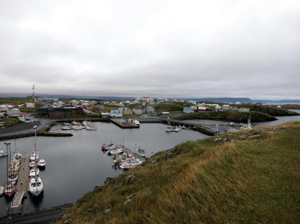 sowie über die Ortschaft Stykkisholmur, ihren kleinen Hafen und die Fähre, welche gerade das Maul aufsperrt um die Autos der Touristen einzuladen. Von hier aus könnte man in die sehr beliebten Westfjorde übersetzen. (www.seatours.is)