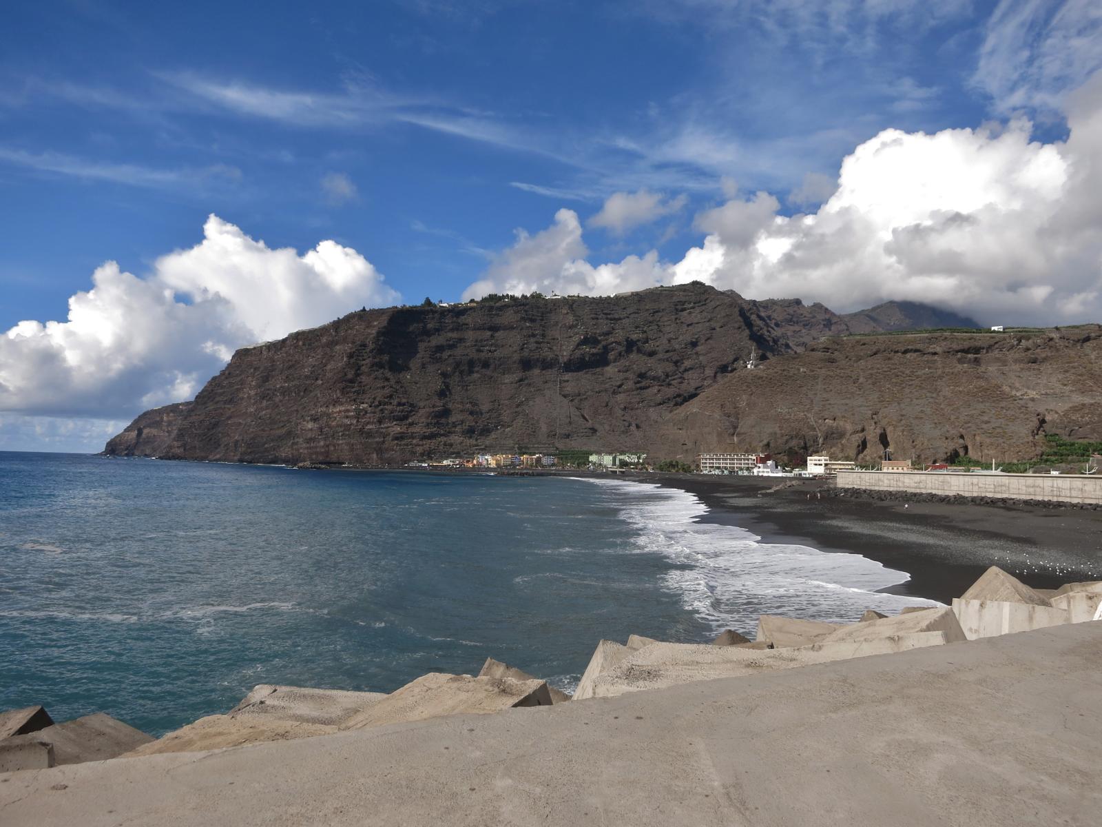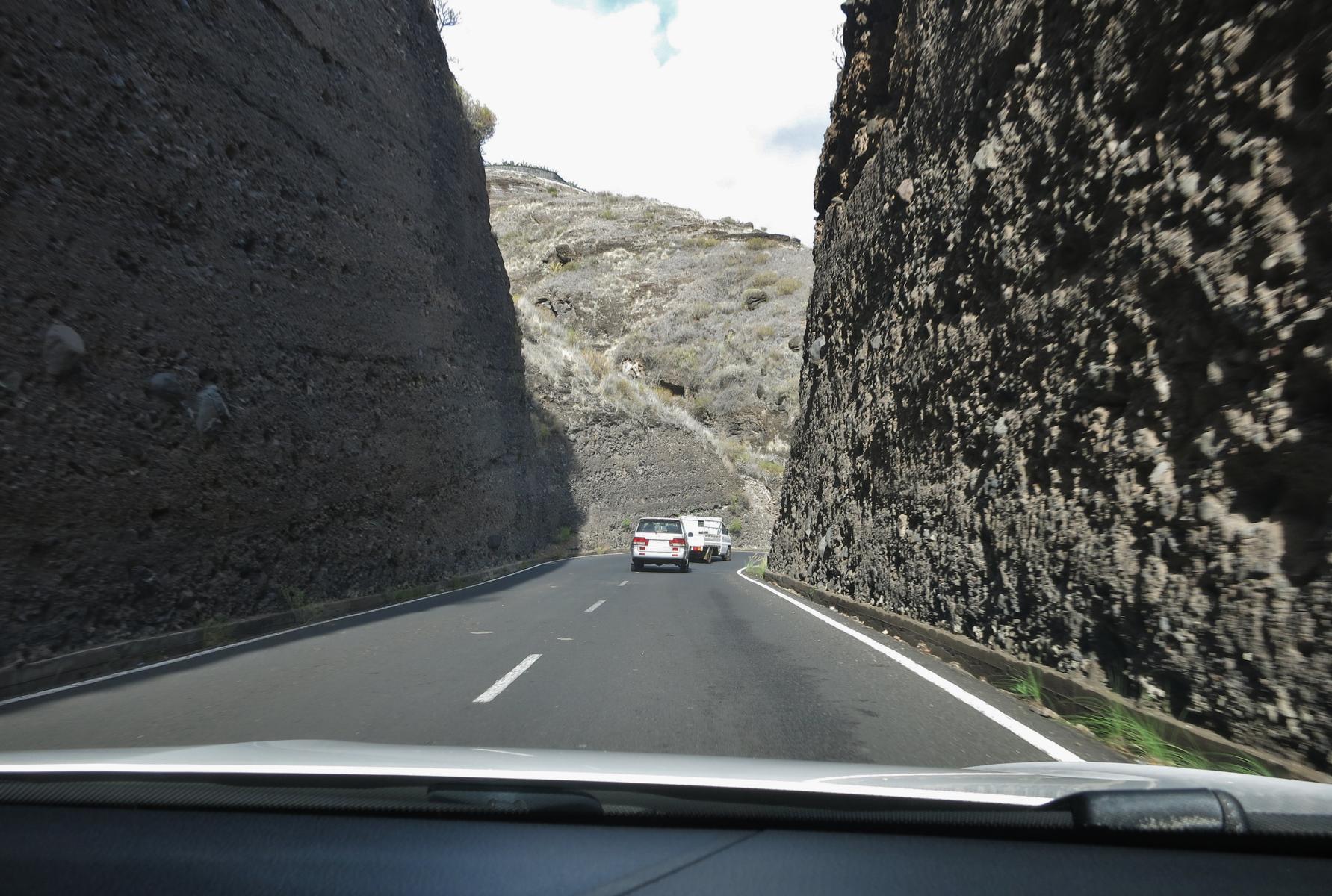 Die letzte Station für heute ist der Hafen und Hafenort Puerto Tazacorte. Dazu geht es die schöne Serpentinenstraße paar Hundert Höhenmeter wieder runter. Mächtige Felswände begrenzen die Straße. Wir staunen.