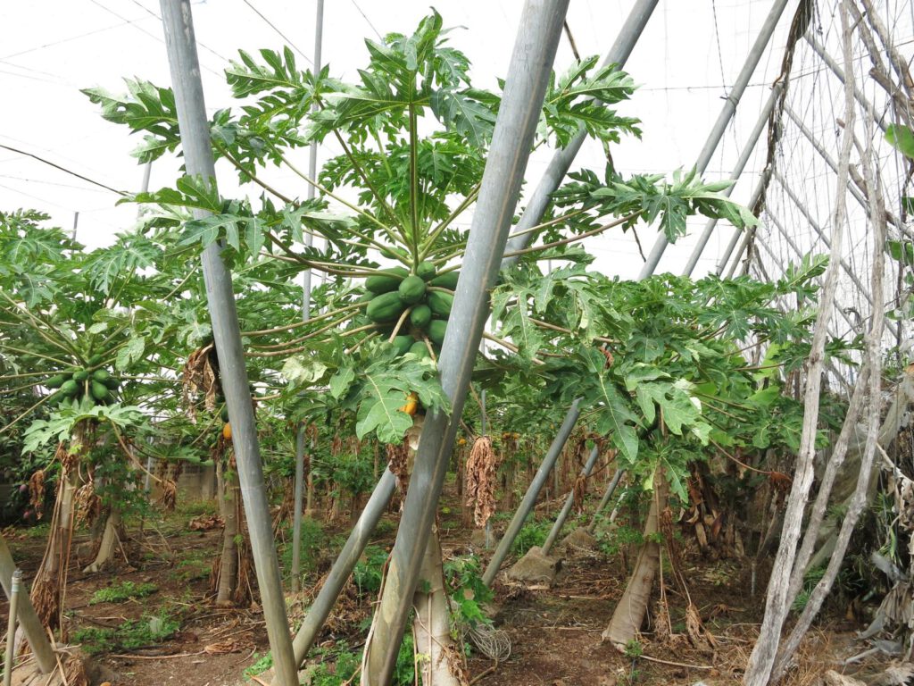 Also schnüffeln wir und zwar lugen wir durch die zerfetzten Zeltplanen ins Bananenfeld hinein. Allerlei wächst hier noch mit. Paprika, Papaya, Kaffee?, Zuckerrohr und auch Hühner spazieren dazwischen rum. Spannend.