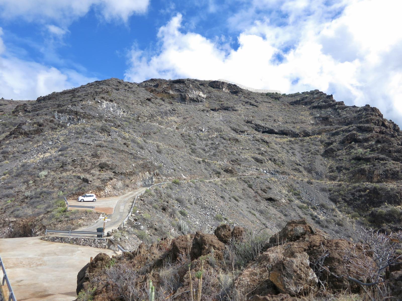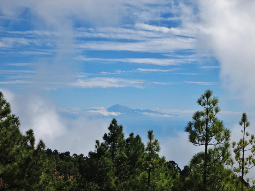 Später sehen wir, dass es eigentlich die Nebenroute ist, auf der sie sich bewegt haben. Roter und weißer Balken kreuzen sich. Die Hauptroute führt unspektakulär aber ziemlich sicher am Fuße des Kegels entlang. Doch bevor wir soweit sind – schiebt sich ganz weit hinten erst mal noch majestetisch der Vulkan Teide von Teneriffa mit seinen 3718 Metern vor unsere Linse.