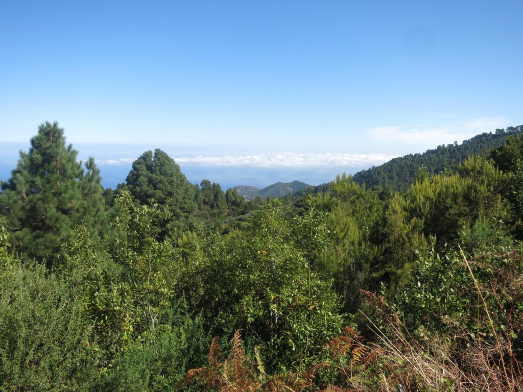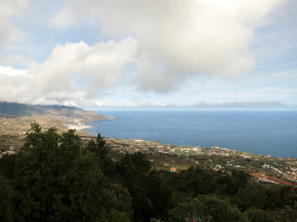 Äußerst schmal und noch kurvenreicher als der Rest der Insel führt uns die historische Straße weiter zum Aussichtspunkt Mirador de Las Mimbreras. Von hier aus können wir auf den Atlantik und wieder auf den Baumbestand schauen.