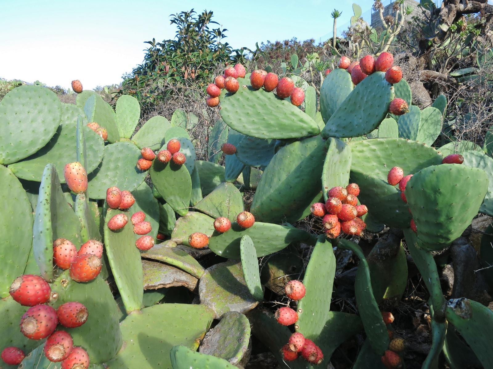Weiter oben kommt ein richtiger Felshang. Einfach grade hoch. Pust. Und dann beginnen die Terassenfelder. Wir scheinen der Stadt näher zu kommen. Genau hier kommt Markus mal auf die Idee, Kaktusfeigen zu untersuchen. Na klar. Kann man ja mal machen. Das kleine mitgeführte Plastikbesteck eignet sich scheinbar hervorragend um sich von deren Leckerheit zu überzeugen. Einziger Nachteil, der Wind trägt diese winzigen Nadeln in meine Richtung. Ich merke es zu spät – insofern habe ich bis abends was von den piksenden Dingern. Die letzte habe ich mir selbst nach dem Duschen noch aus der Brust gezupft. Grrrrr. Dafür säumen jedoch herrliche Pinien dann den Weg und neugierige Echsen lugen aus den Natursteinmauern.