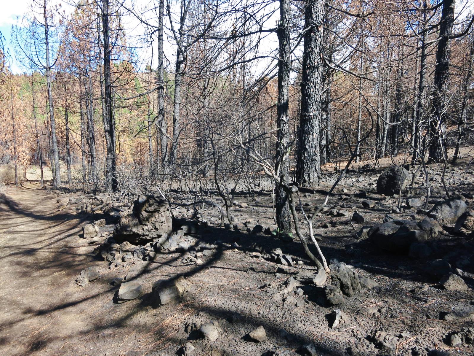 Am Boden liegen braune Piniennadeln und ringsherum stehen verkohlte Baumstämme und kleine blattlose Bäumchen.