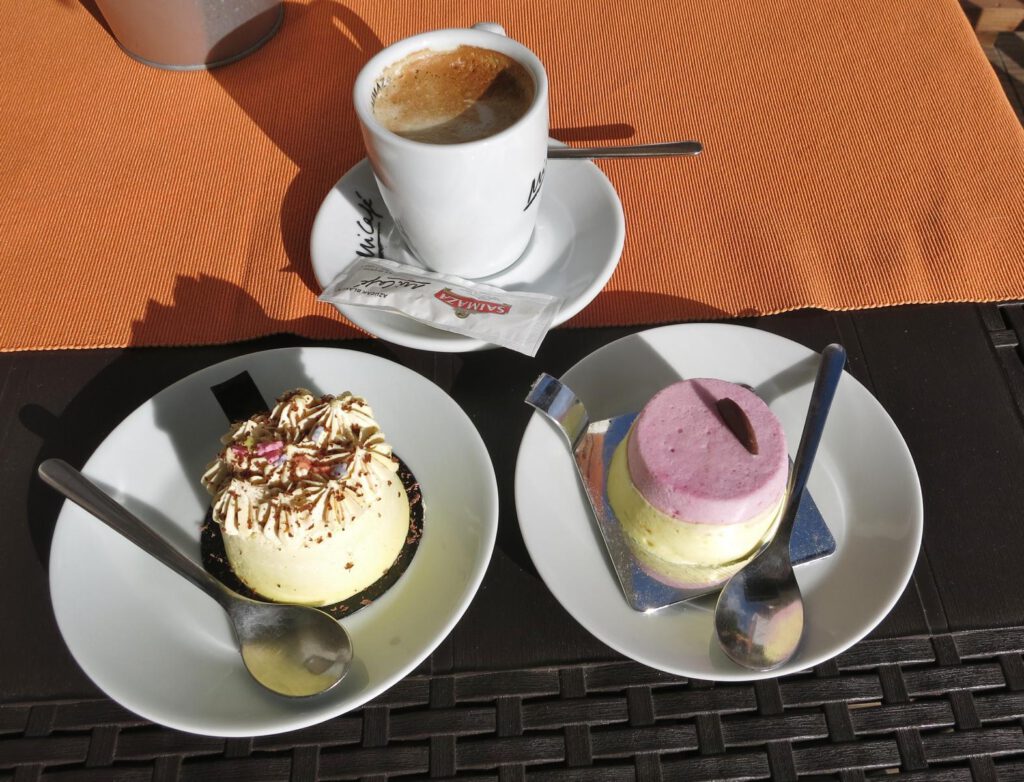 Wir bleiben also nur kurz am Strand und fahren weiter Richtung Süden und besuchen ein zweites Mal Fuencaliente. Dafür schnauft das Auto …. wieder mächtig viele Höhenmeter hinauf. Im Bäcker (Panaderia und Pasteleria Zulay) bekommen wir einen leckeren Café und auch ein kleines süßes Teilchen. Sehen die hübsch aus. Fast zu schön zum Essen. Heute schlemmen wir aber mal so richtig.
