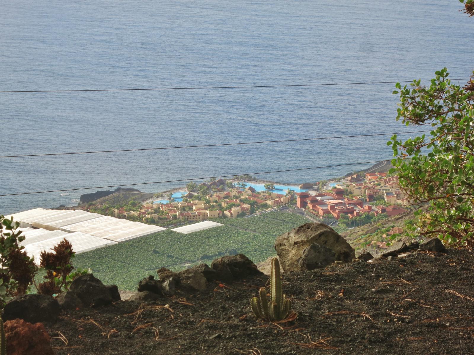 Auf der LP 209 geht es dann wieder abwärts Richtung Küste. Irre viele Höhenmeter wieder runter. Ein bisschen neugierig waren wir ja doch, denn hier liegt das so ziemlich einzige und auch kräftig umstrittene Hotel an der Westküste. Die wenigsten La Palmabesucher wollen in solch einem High End Hotel wohnen, die meisten ziehen das traditionelle Wohnen in Selbstversorgerhäusern vor. Nicht so das Hotel Princess. Mit großem Pool inmitten von Bananenplantagen ist es von oben gut zu sehen.