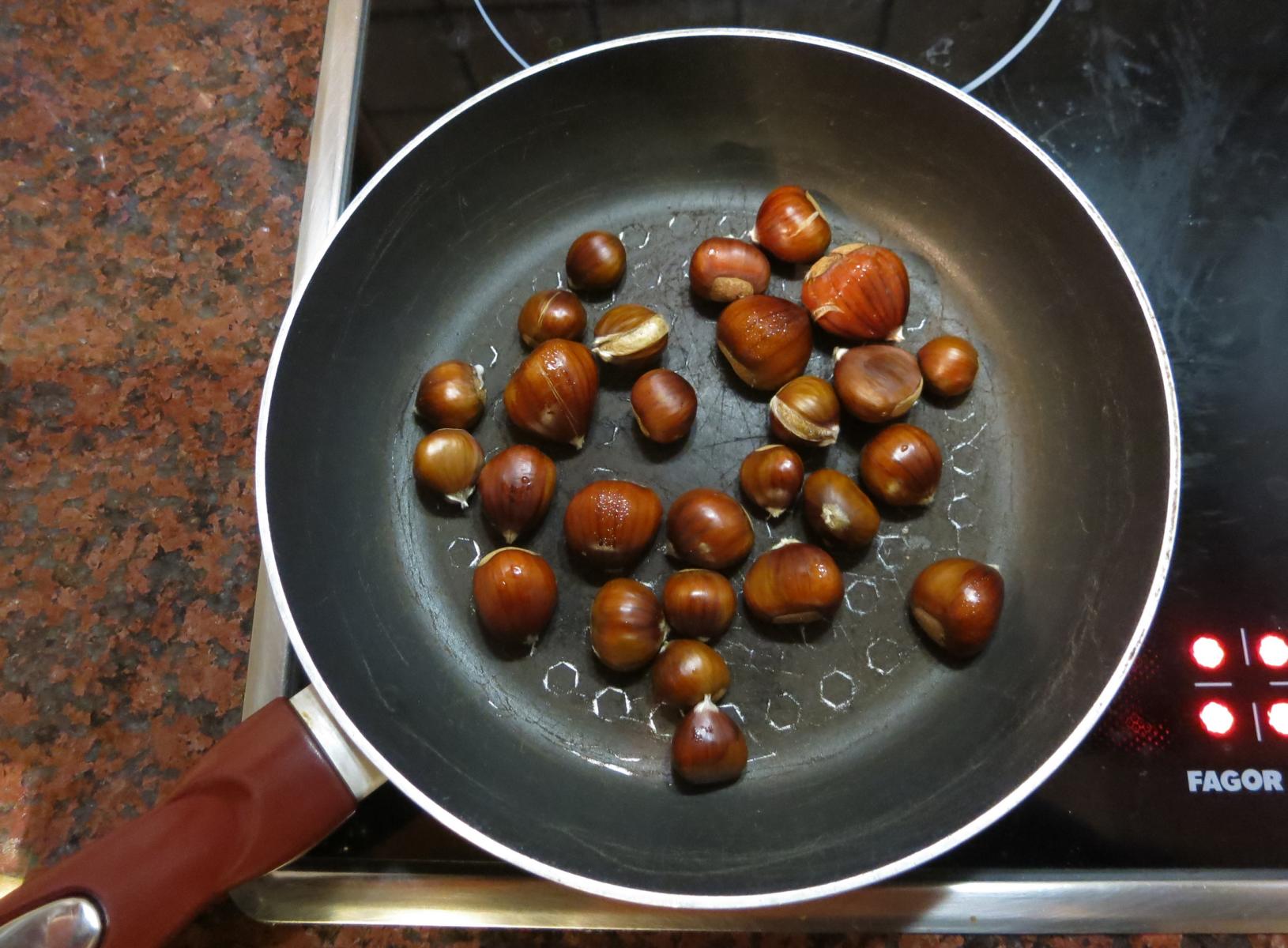 Wir finden jedenfalls ein Haufen Ölspritzer, warum und weshalb wird wohl immer ein Geheimnis bleiben. Jedenfalls kommen wir sicher den Berg hoch und nach einem Sonnenuntergangsstopp in Tijarafe heile in unserem Haus in Los Llanos an. Dort warten heute noch die Esskastanien auf uns. Also ab in die Pfanne mit ihnen.