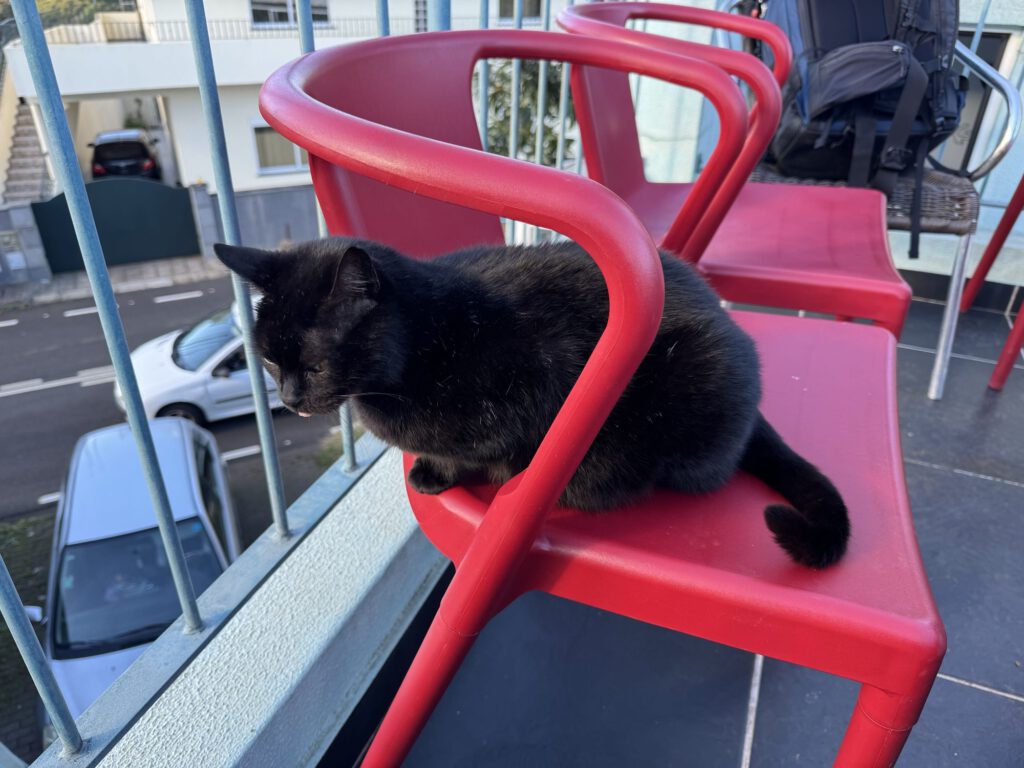 Kaum sitzen wir vorm Bistro auf der Plastik-Combo – schleicht sich eine bettelnde Katze an. Mit ihrem Blick hypnotisiert sie mich, will mich zum teilen animieren. Nix da – wir füttern keine fremden Tiere.