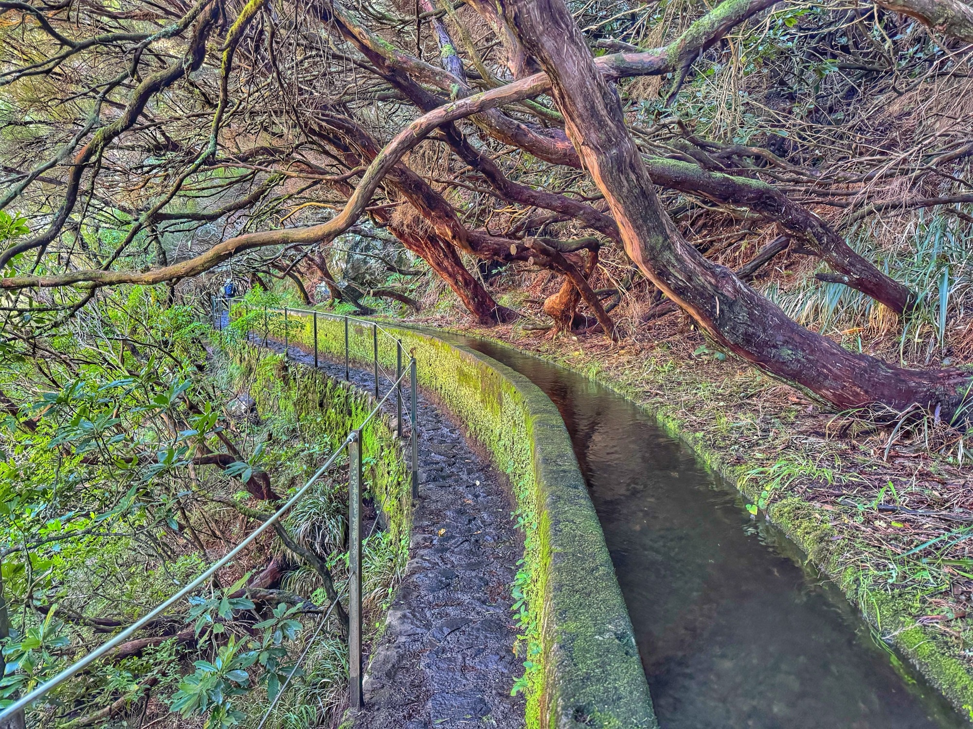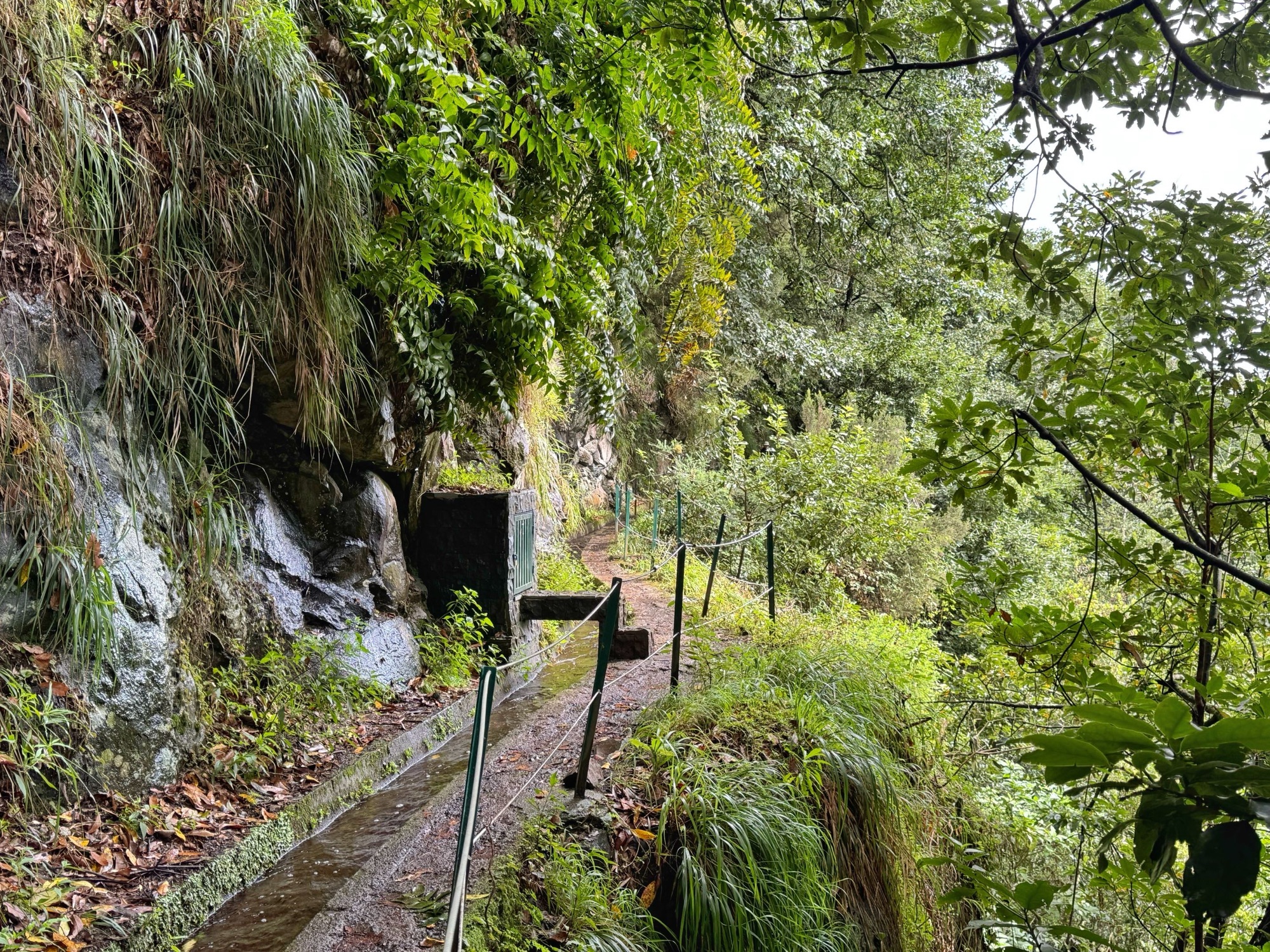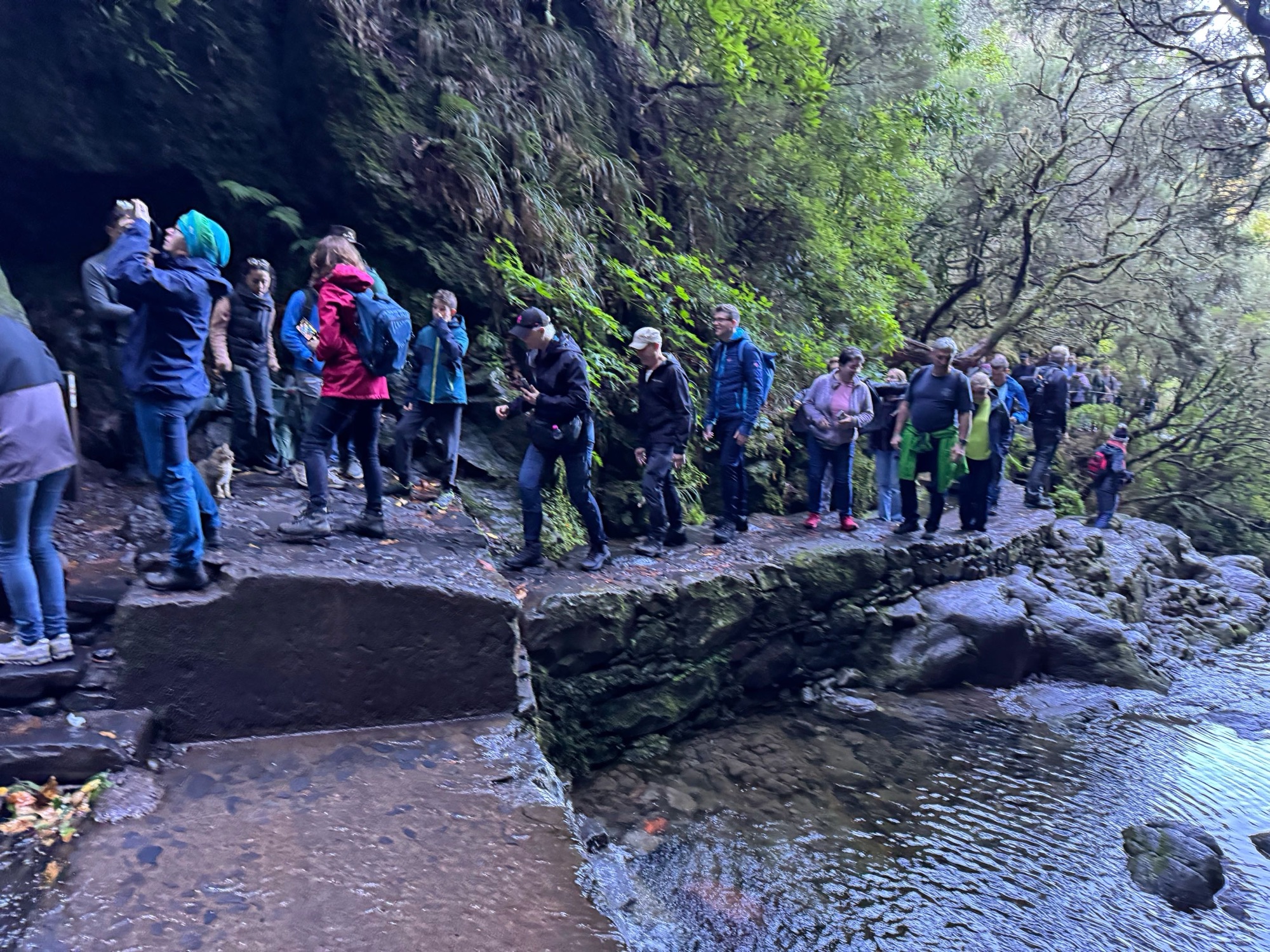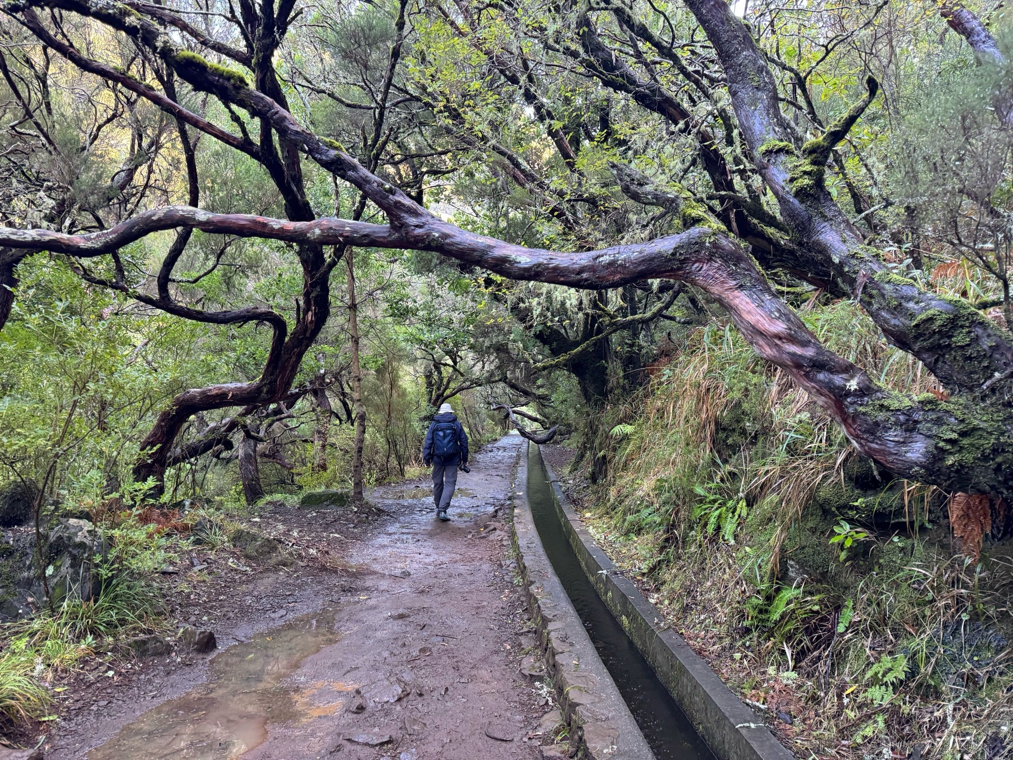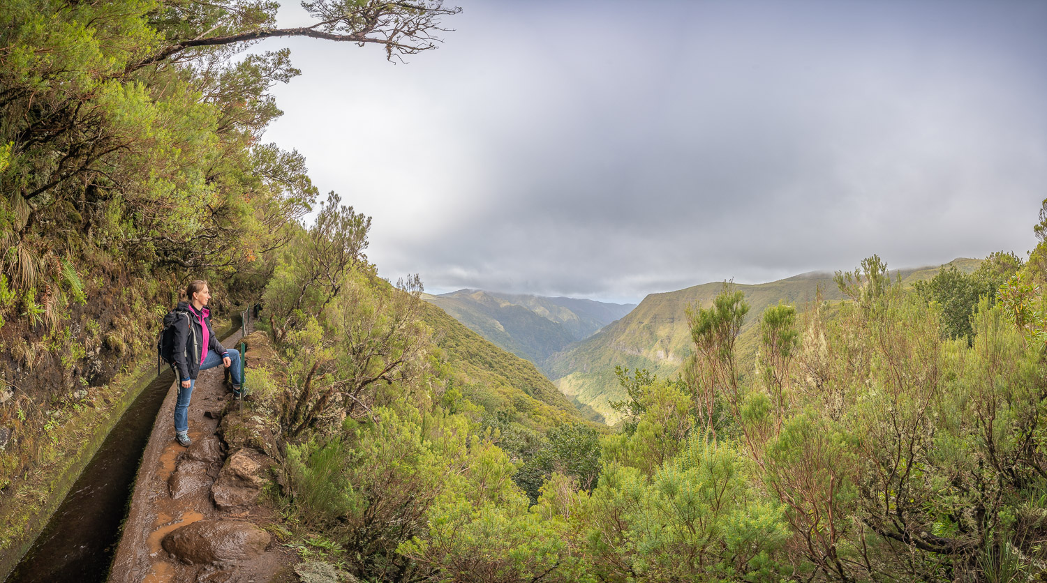 Rechts ist Felsen, das Wasser in der Levada ist hier mehr als knöchelhoch, gelaufen wird links vom Wasser auf der Mauer. Die zwei markanten Baumstämme sind Eukalyptusbäume – da es immer wieder regnet riecht es wechselnd und in Nuancen entweder wie im Blumen- oder im Gewürzladen. Wirklich aromatischer Waldduft, ganz toll. Der Regen stört uns nicht weiter. Bei etwa 14° und immer wieder durchschimmernder Sonne trocknen wir auch recht schnell wieder.