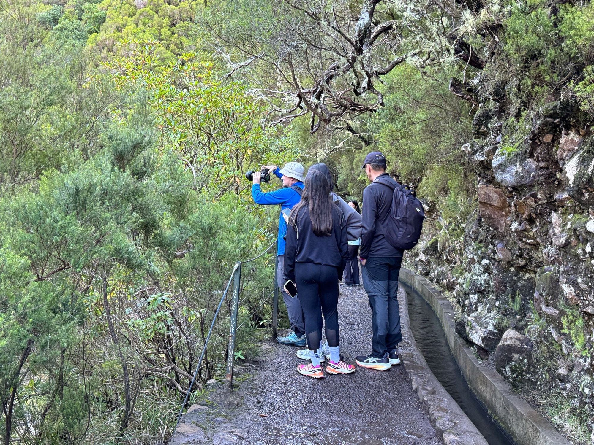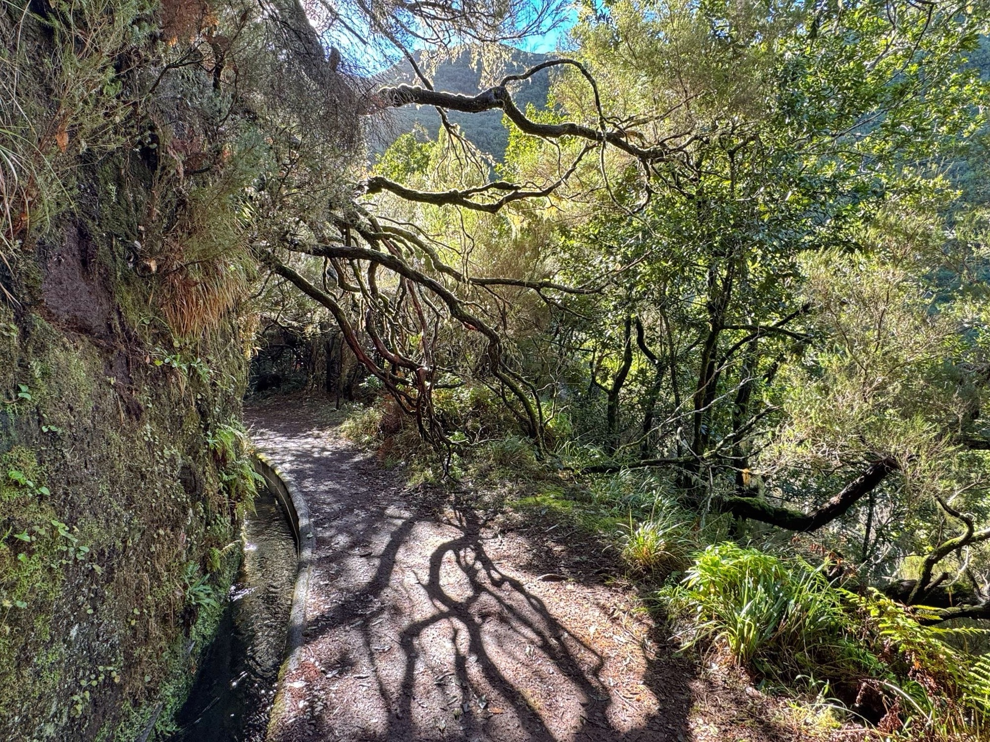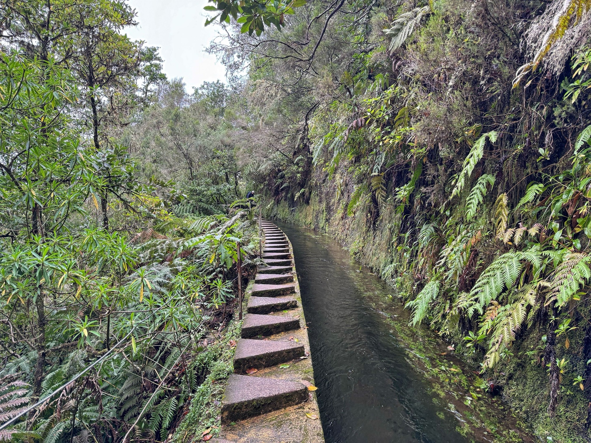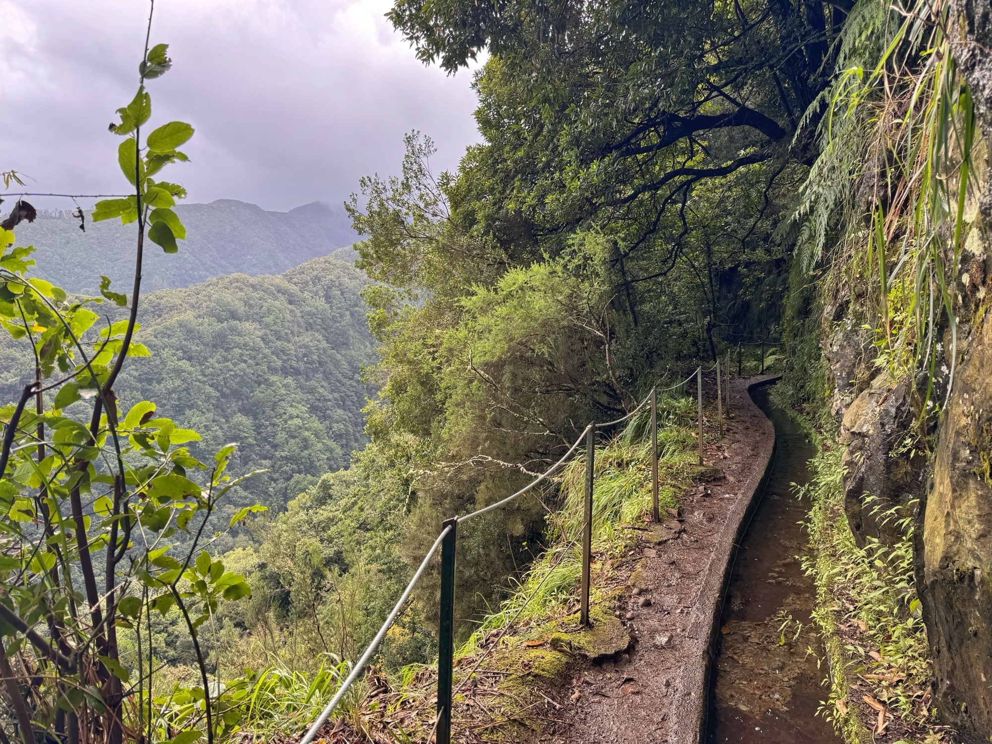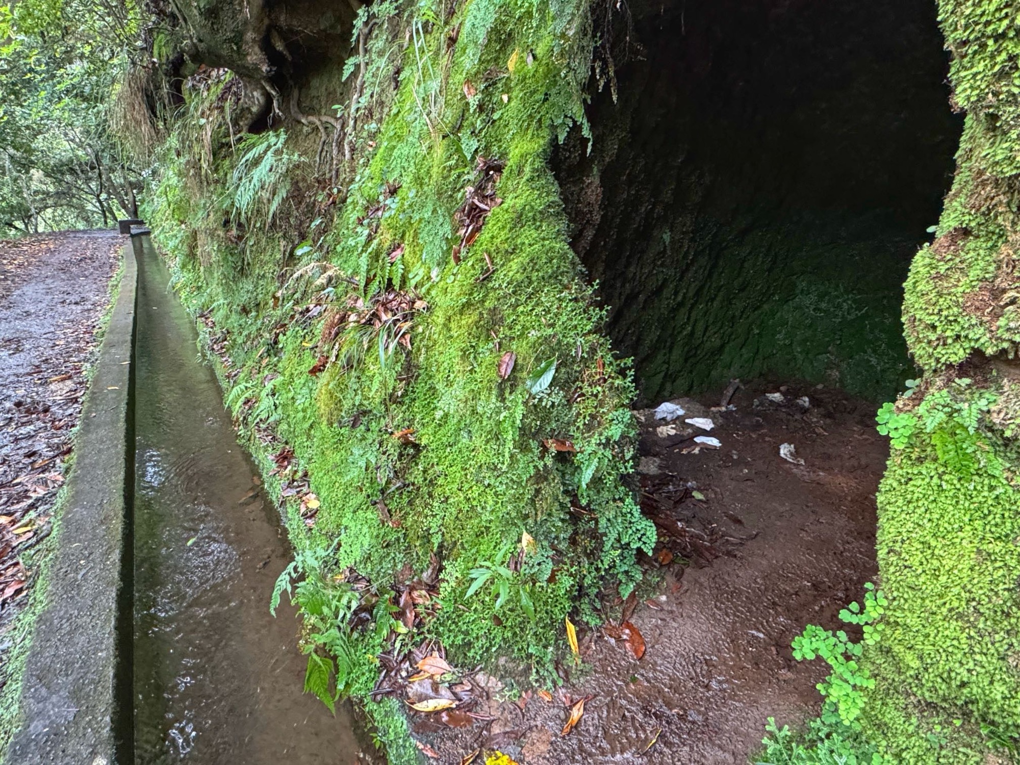 Rechts ist Felsen, das Wasser in der Levada ist hier mehr als knöchelhoch, gelaufen wird links vom Wasser auf der Mauer. Die zwei markanten Baumstämme sind Eukalyptusbäume – da es immer wieder regnet riecht es wechselnd und in Nuancen entweder wie im Blumen- oder im Gewürzladen. Wirklich aromatischer Waldduft, ganz toll. Der Regen stört uns nicht weiter. Bei etwa 14° und immer wieder durchschimmernder Sonne trocknen wir auch recht schnell wieder.