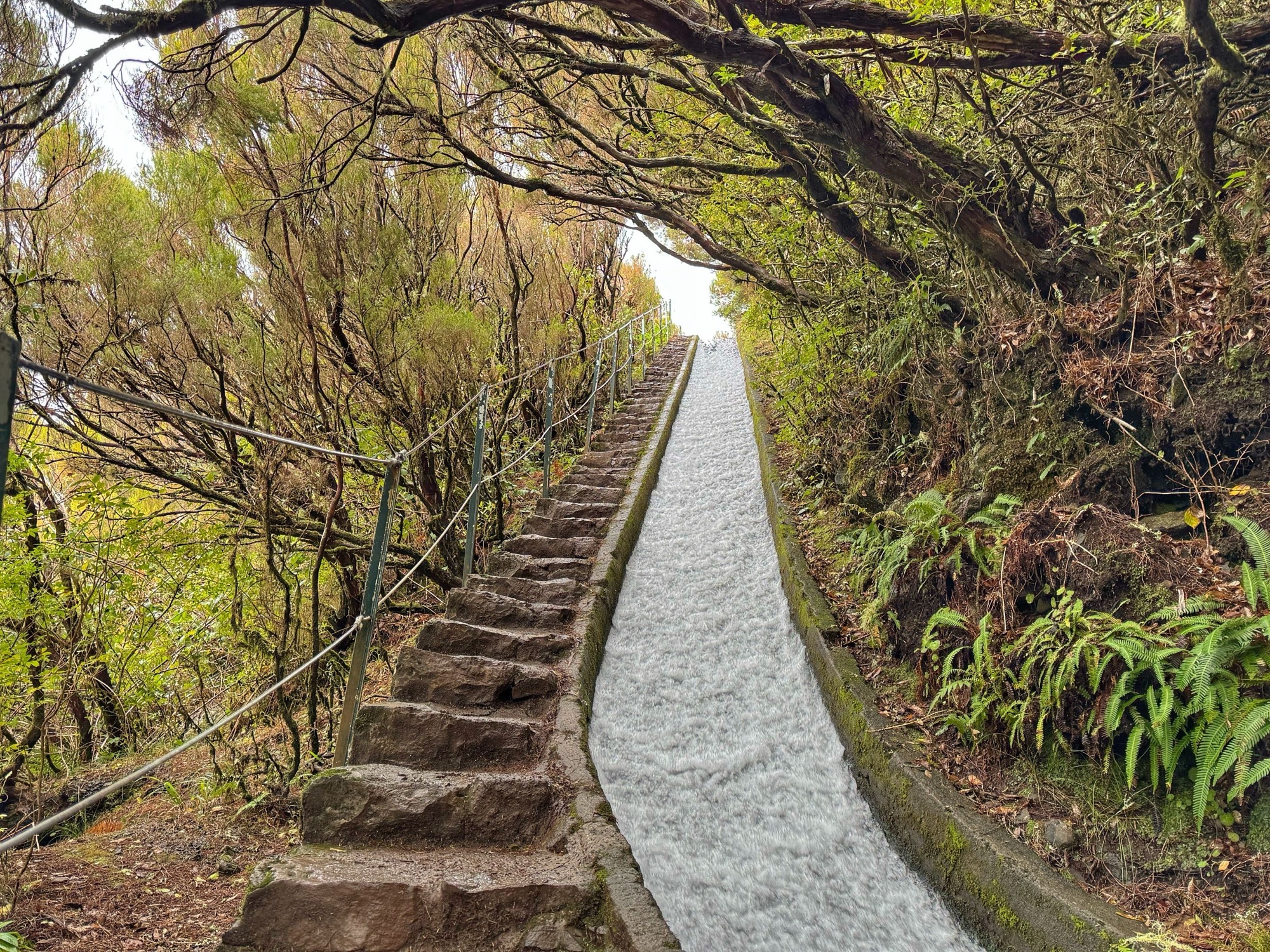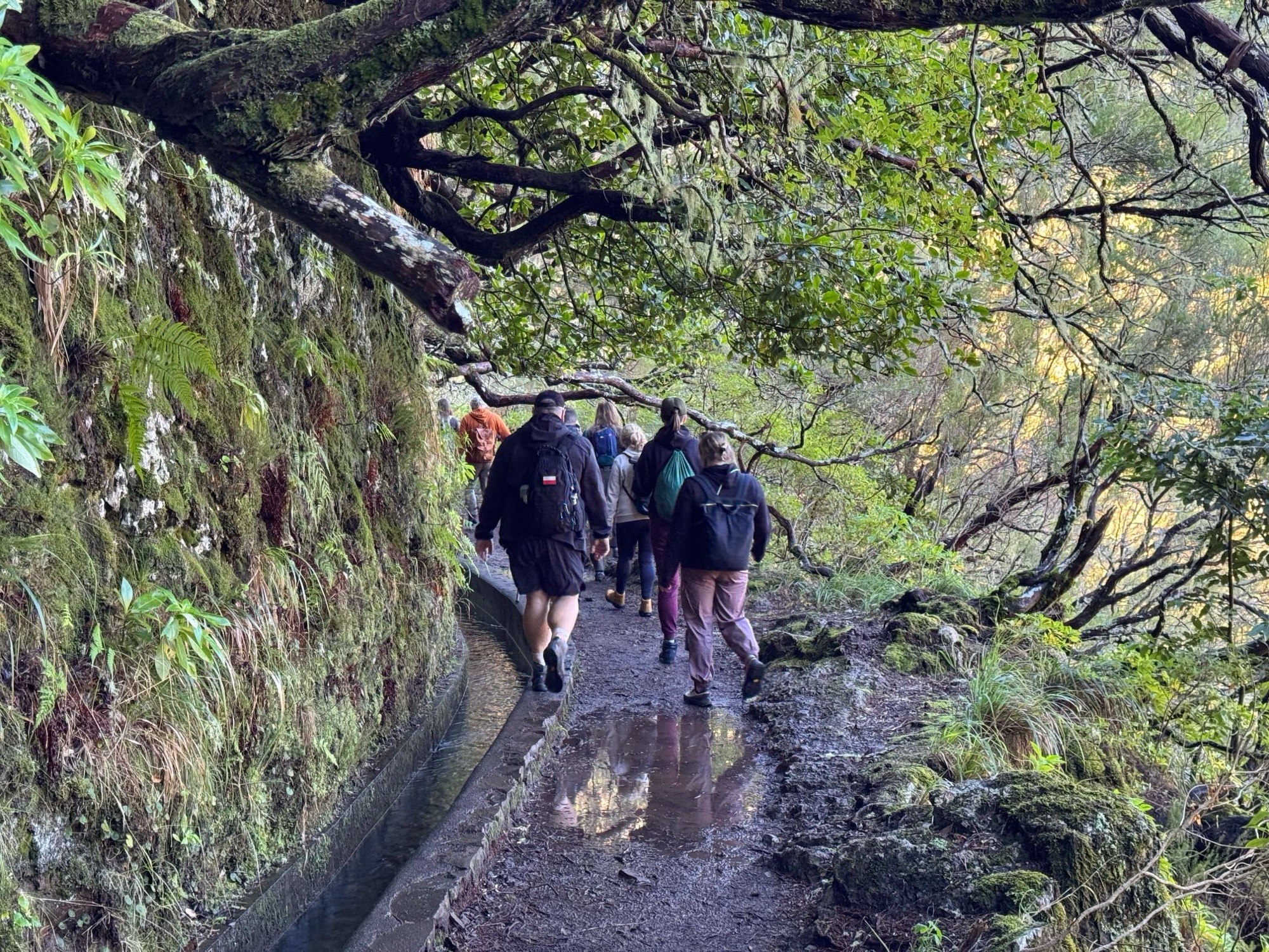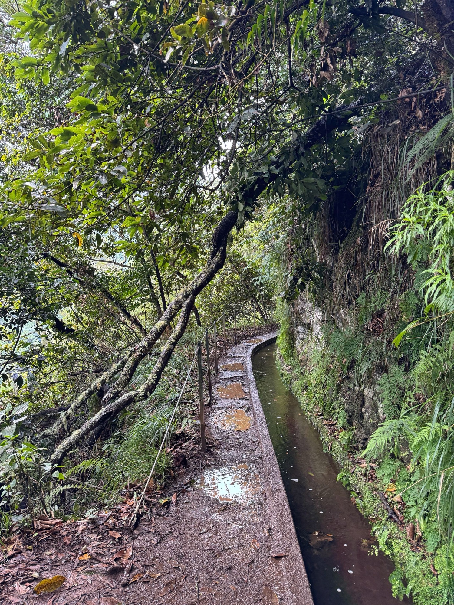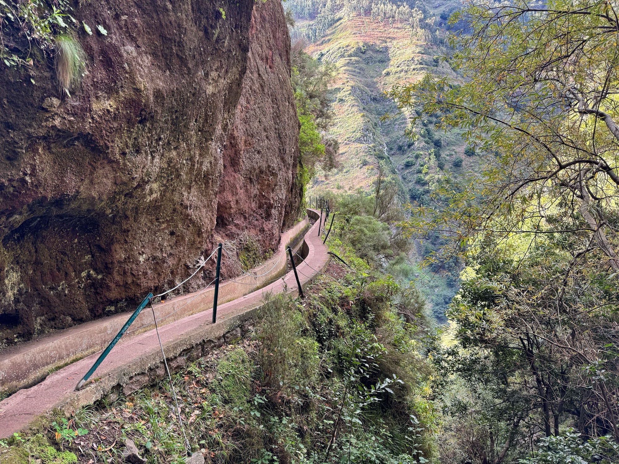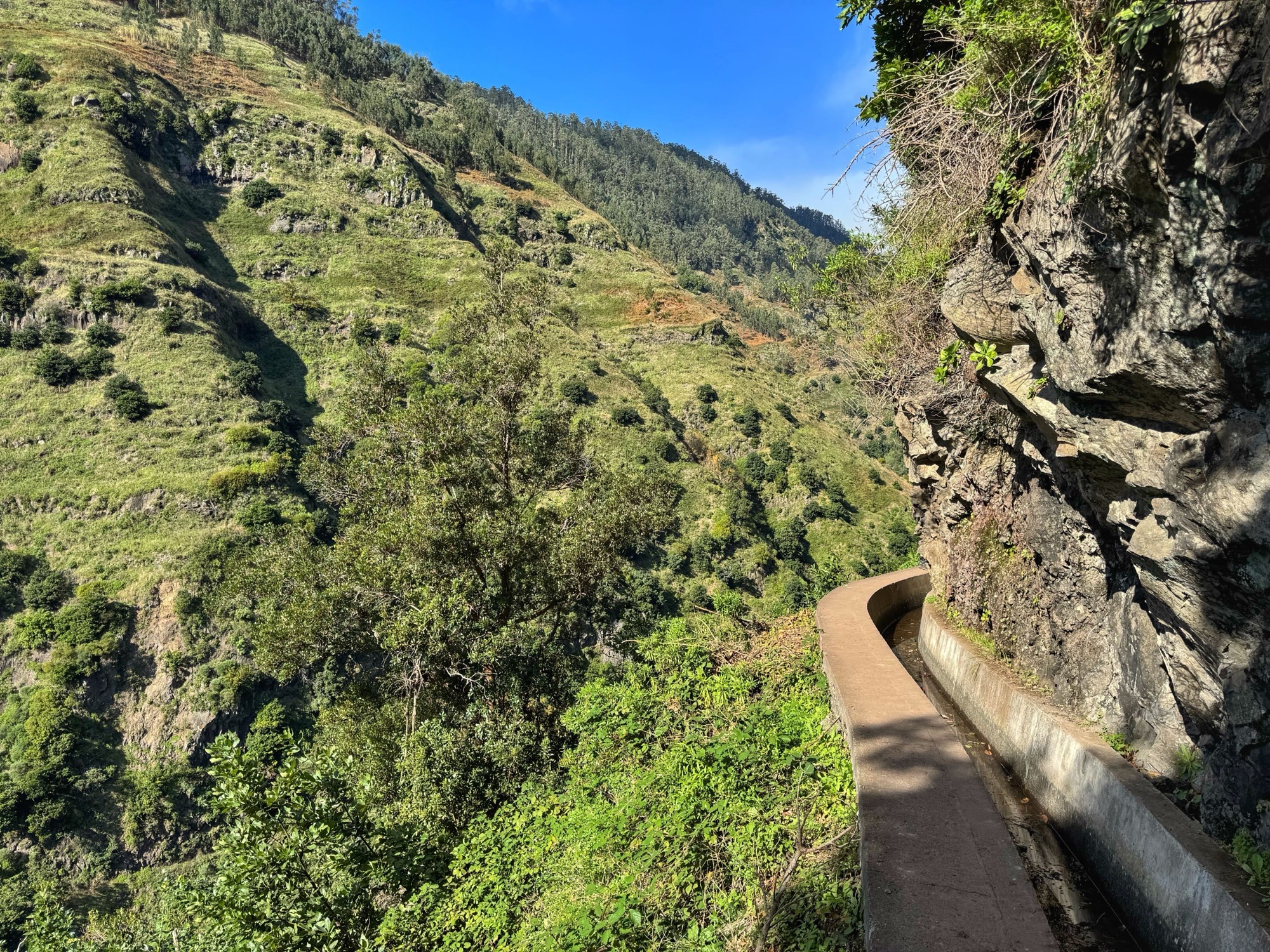 Rechts ist Felsen, das Wasser in der Levada ist hier mehr als knöchelhoch, gelaufen wird links vom Wasser auf der Mauer. Die zwei markanten Baumstämme sind Eukalyptusbäume – da es immer wieder regnet riecht es wechselnd und in Nuancen entweder wie im Blumen- oder im Gewürzladen. Wirklich aromatischer Waldduft, ganz toll. Der Regen stört uns nicht weiter. Bei etwa 14° und immer wieder durchschimmernder Sonne trocknen wir auch recht schnell wieder.