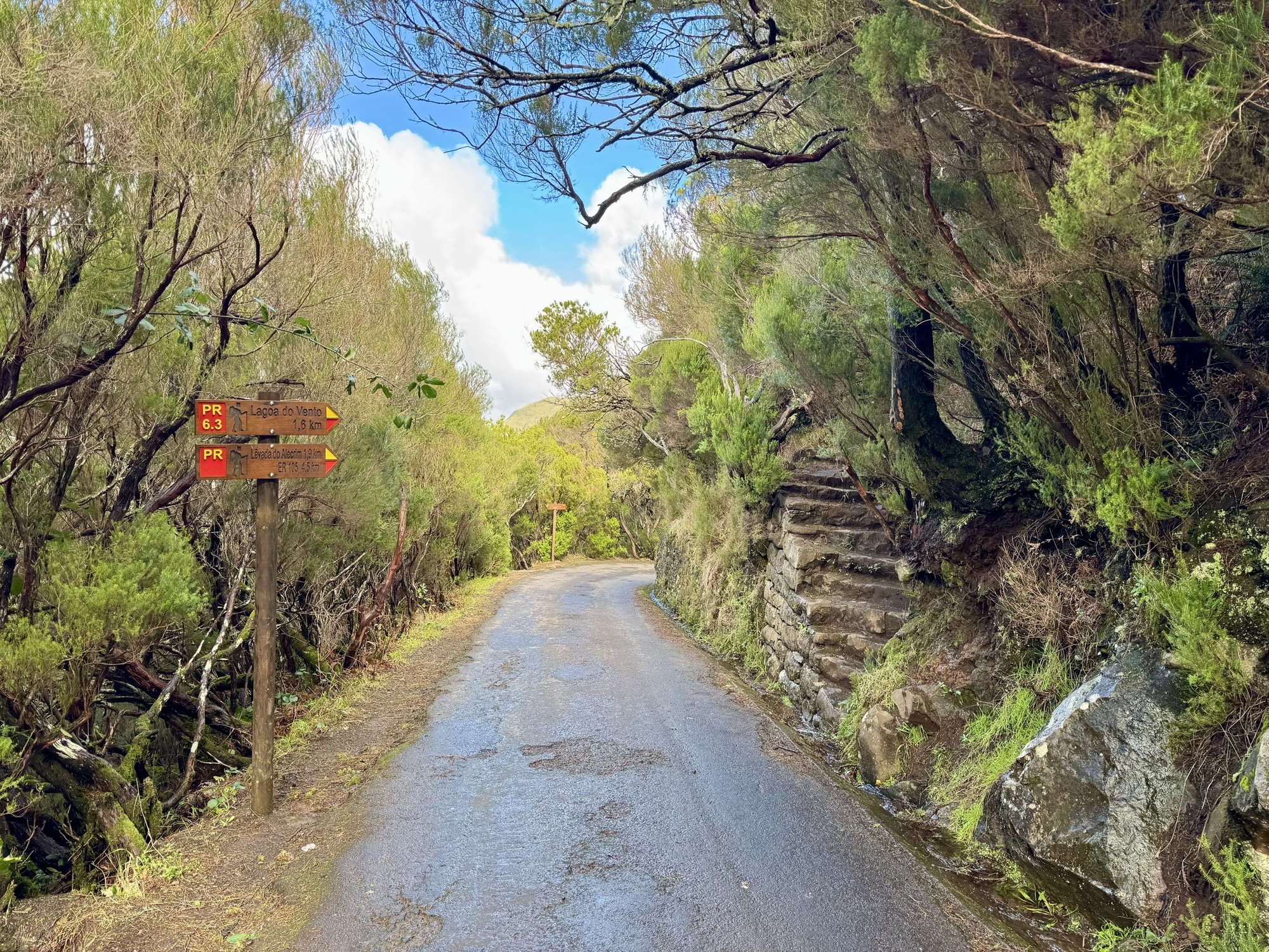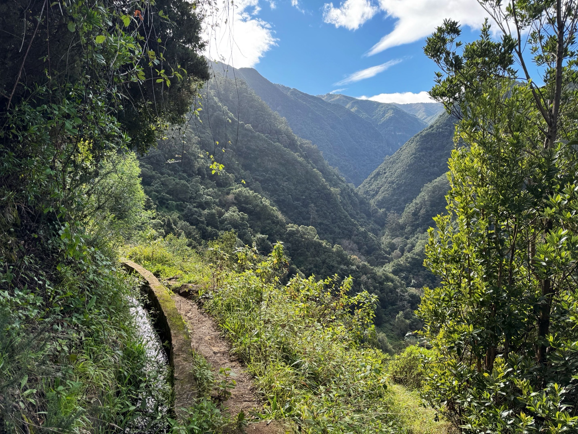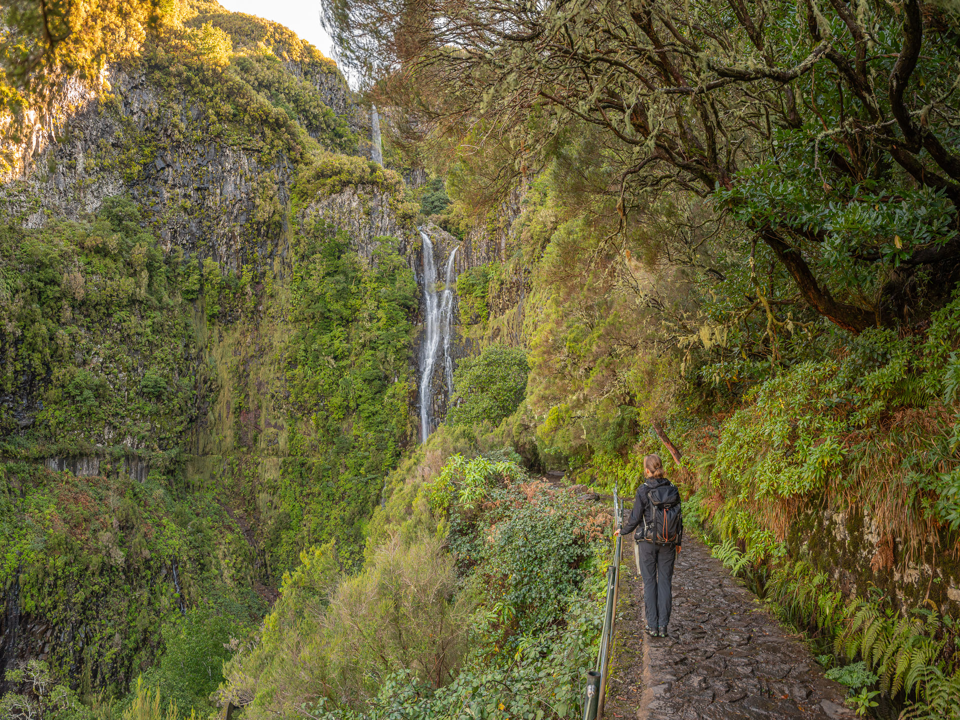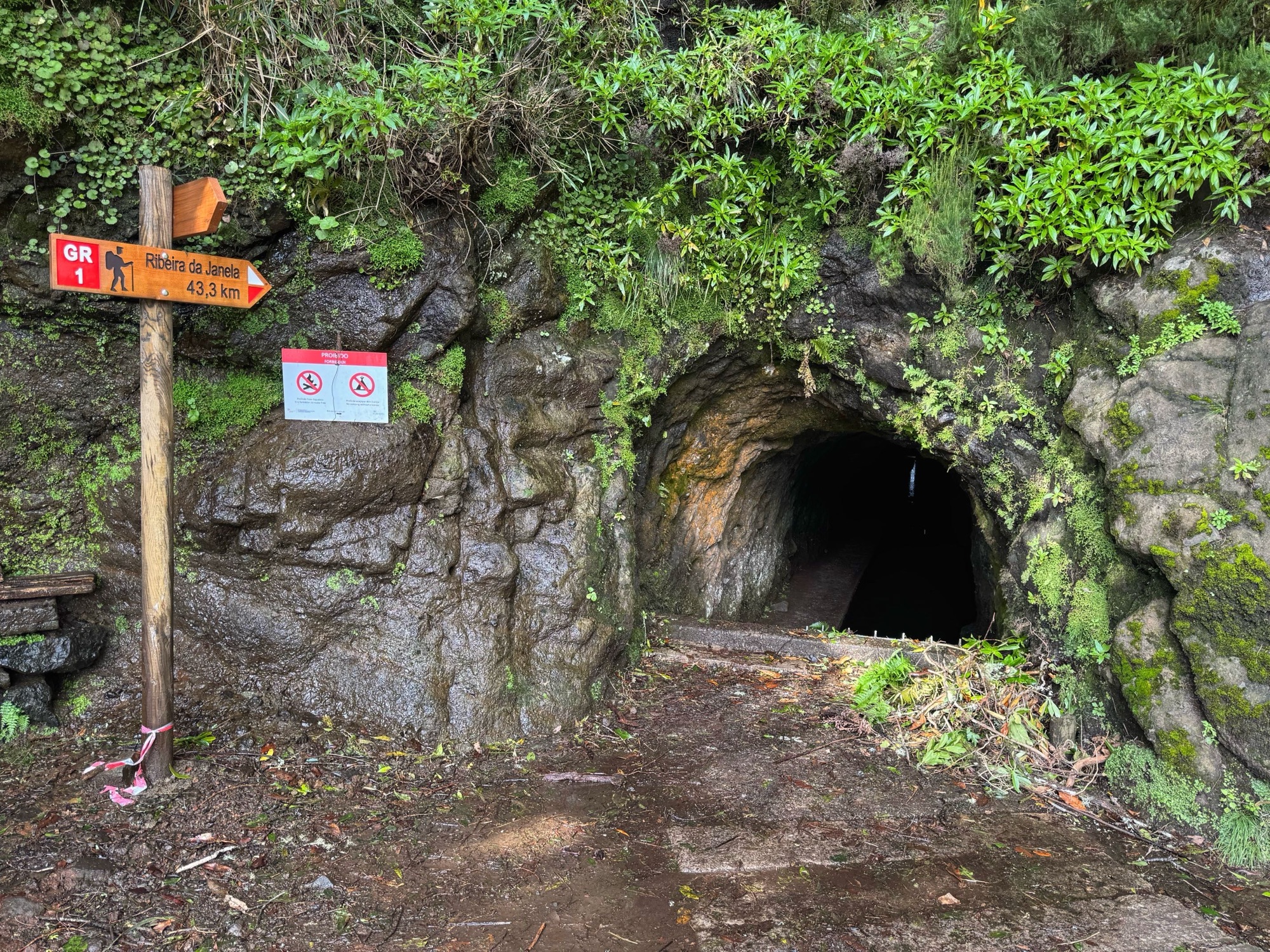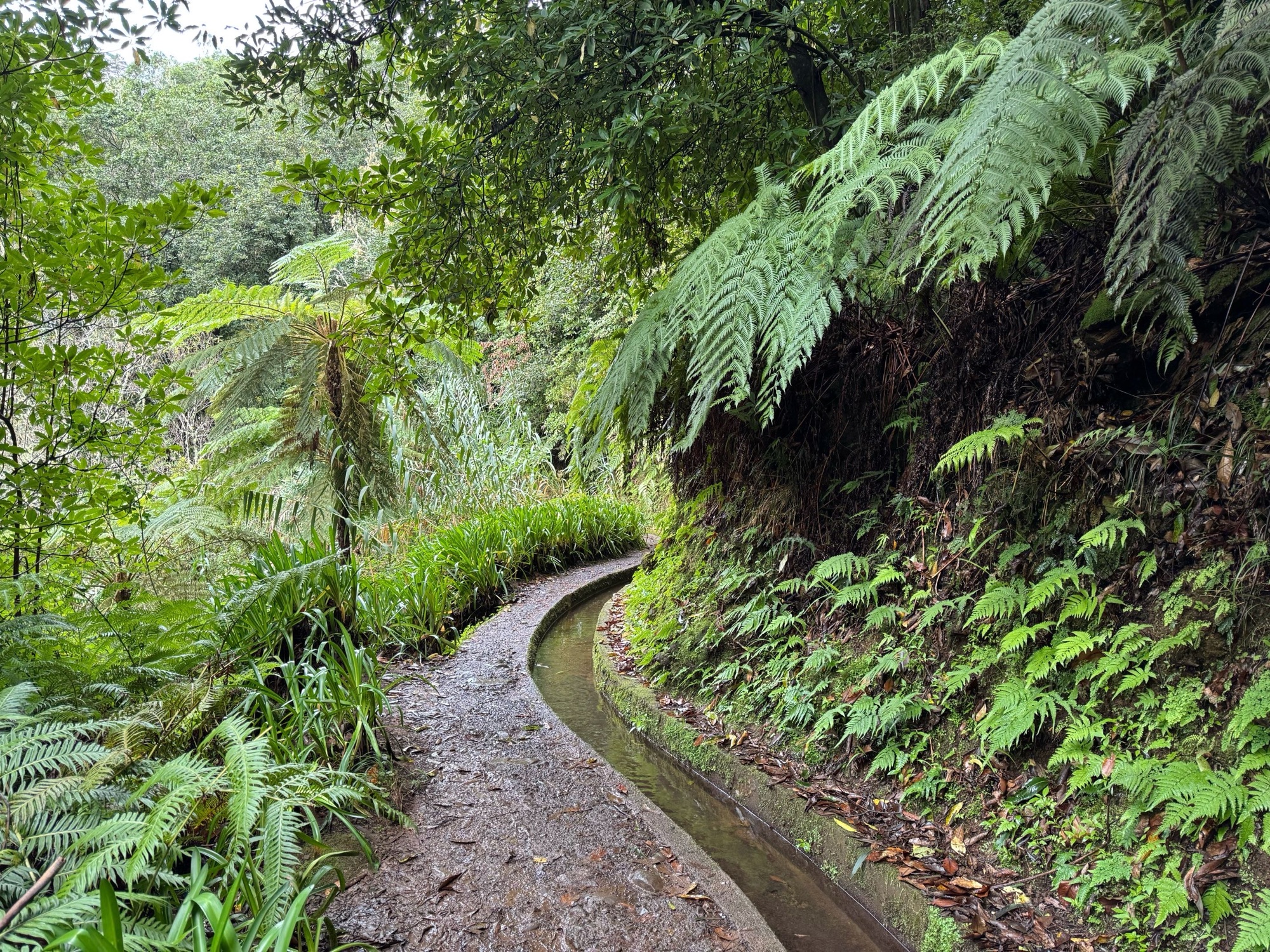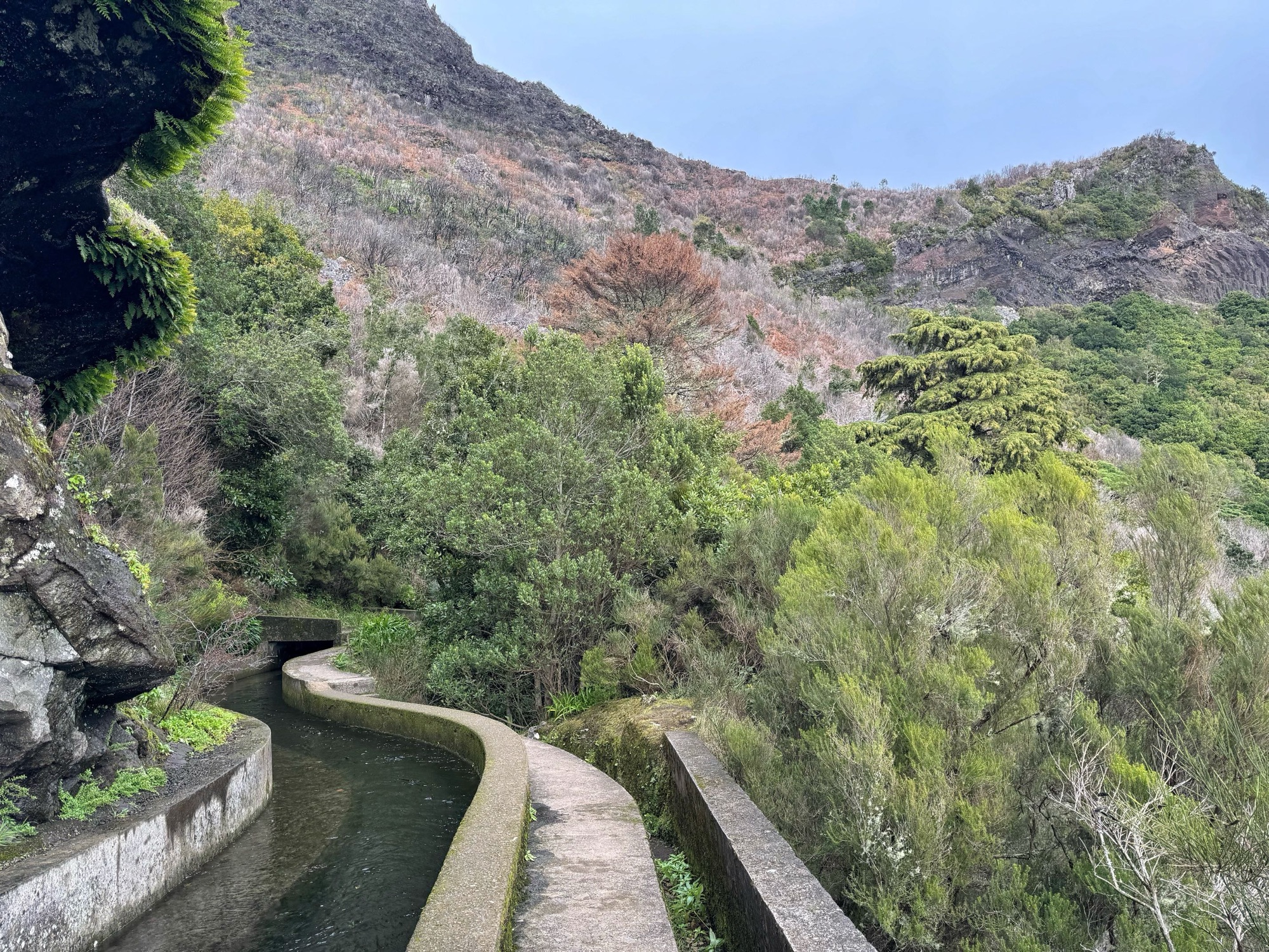 Rechts ist Felsen, das Wasser in der Levada ist hier mehr als knöchelhoch, gelaufen wird links vom Wasser auf der Mauer. Die zwei markanten Baumstämme sind Eukalyptusbäume – da es immer wieder regnet riecht es wechselnd und in Nuancen entweder wie im Blumen- oder im Gewürzladen. Wirklich aromatischer Waldduft, ganz toll. Der Regen stört uns nicht weiter. Bei etwa 14° und immer wieder durchschimmernder Sonne trocknen wir auch recht schnell wieder.