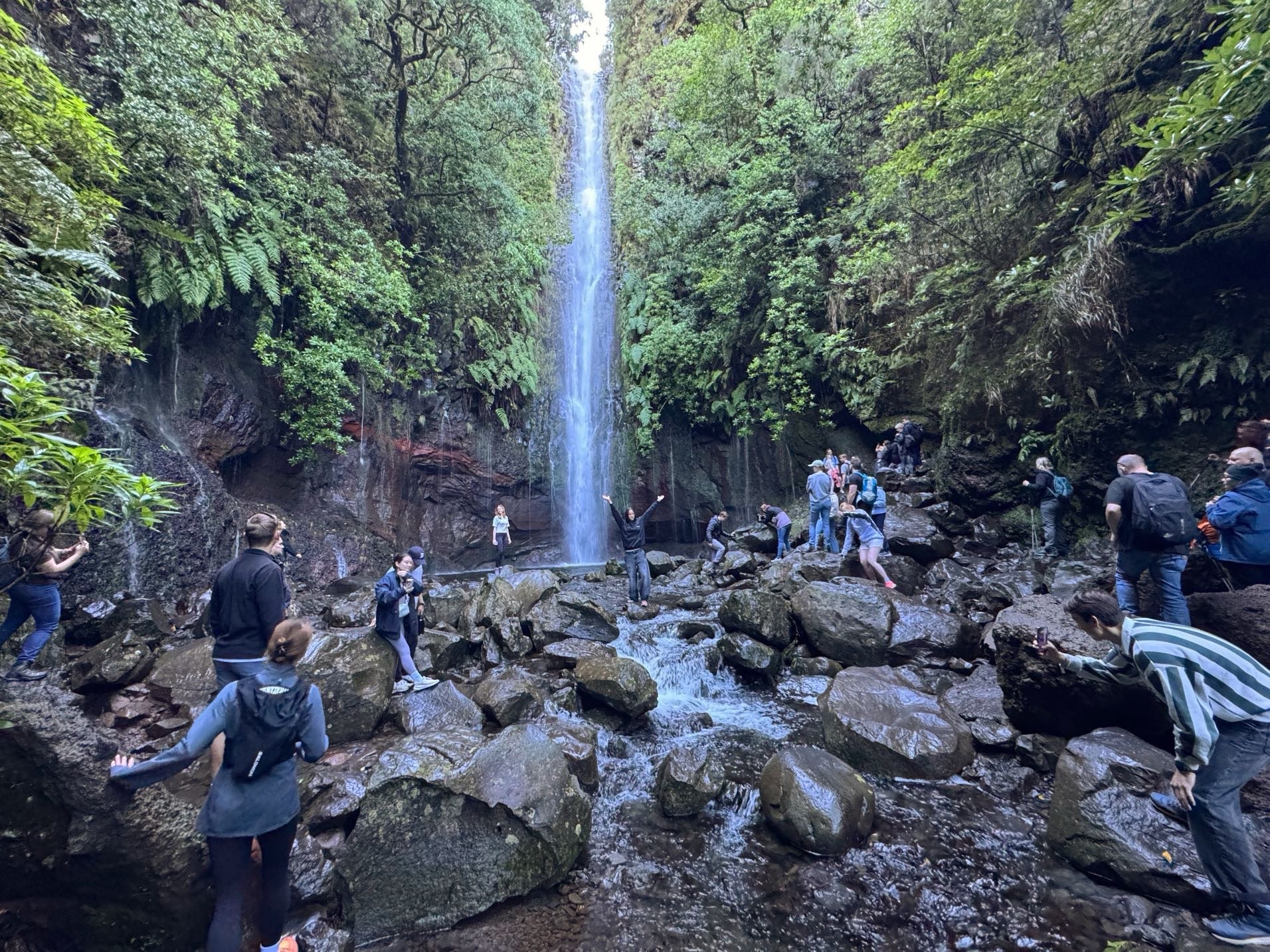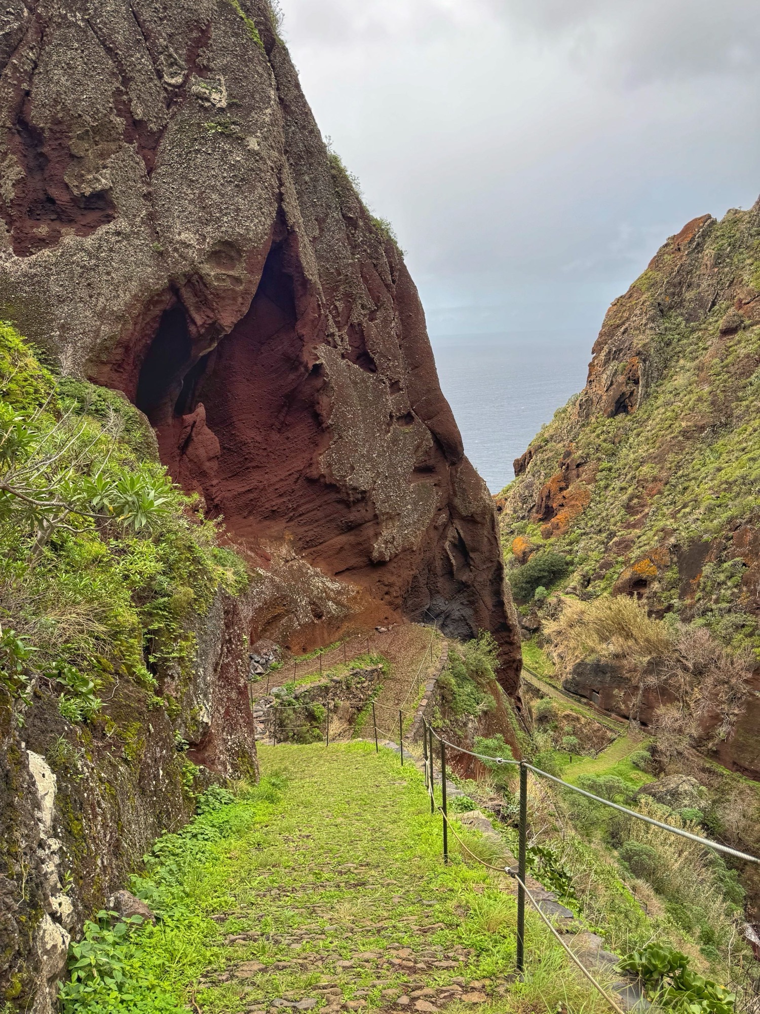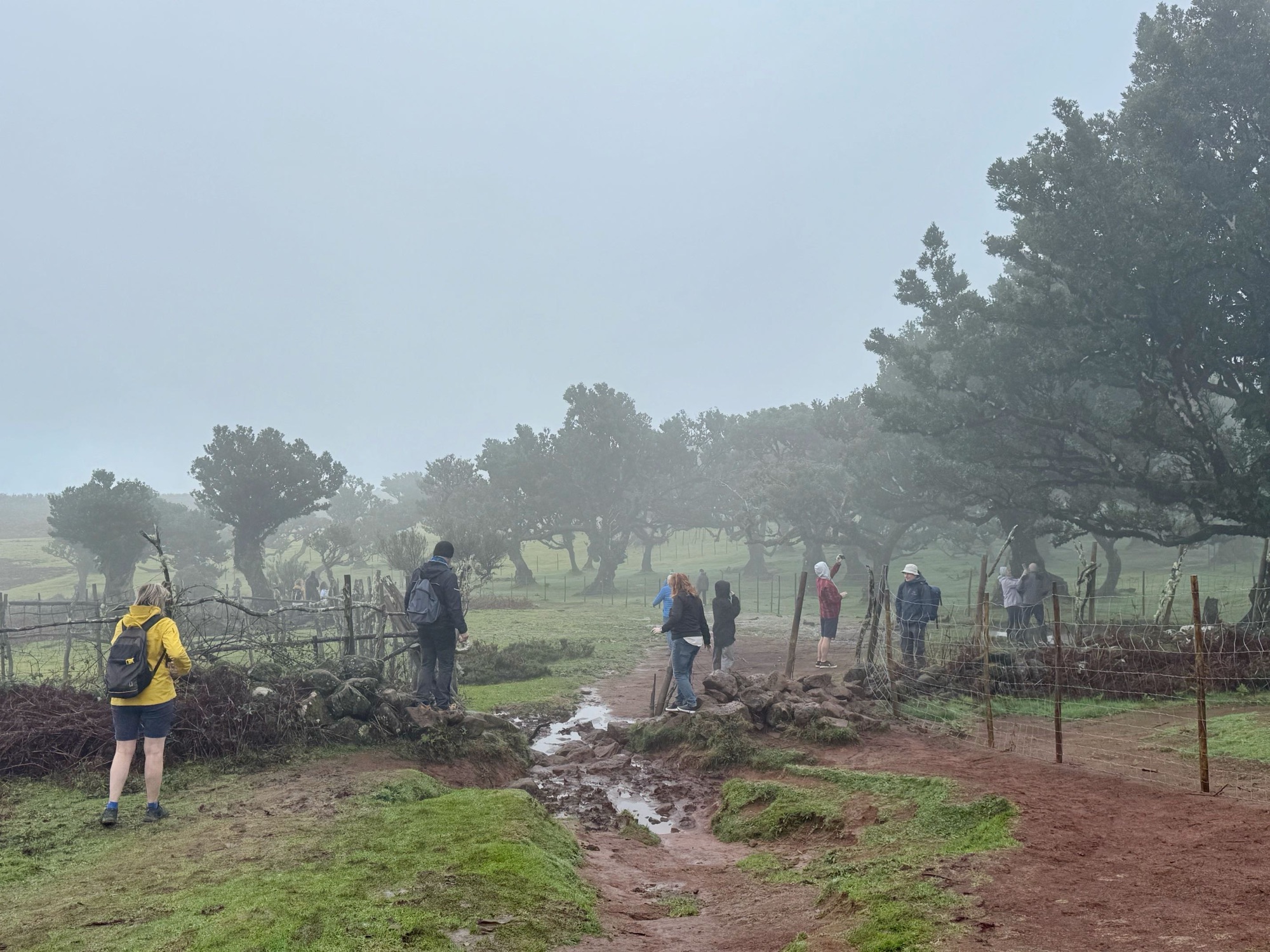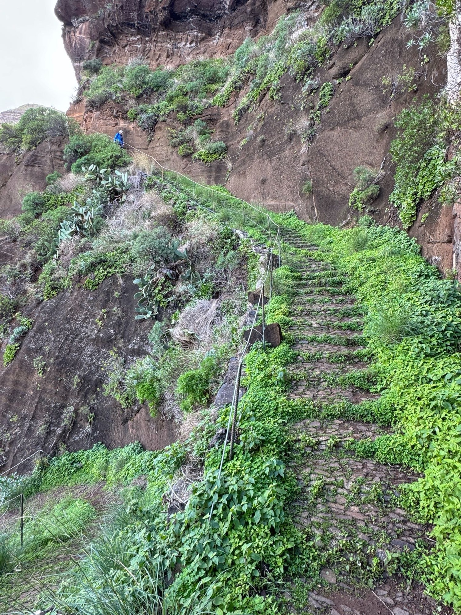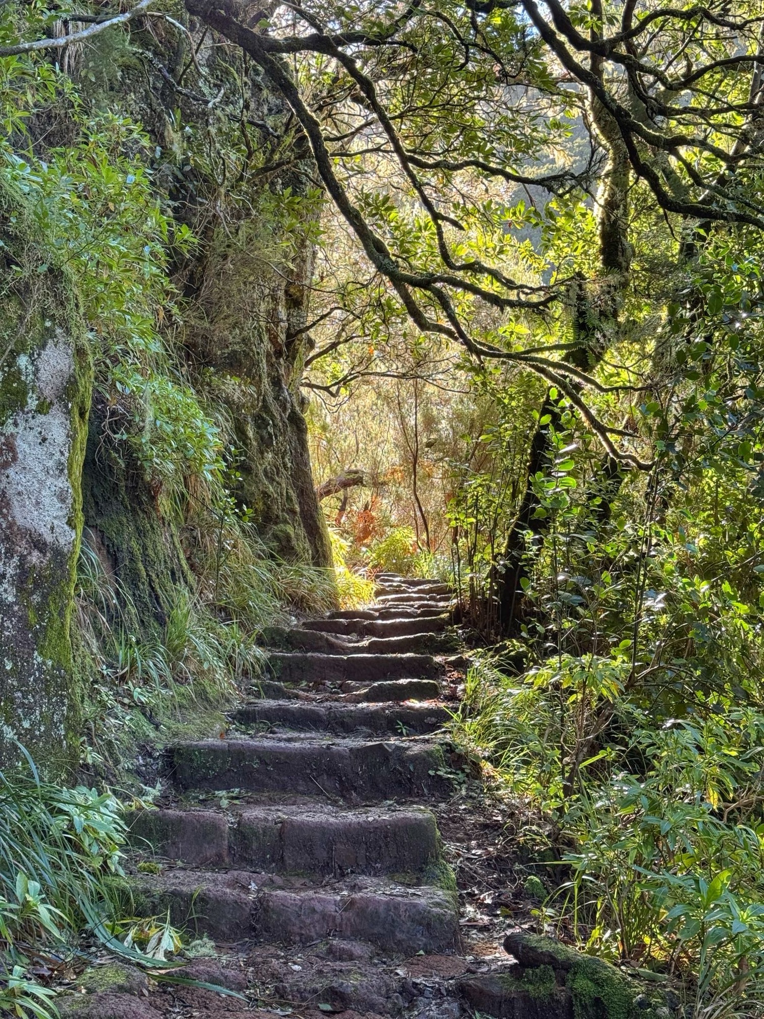 Rechts ist Felsen, das Wasser in der Levada ist hier mehr als knöchelhoch, gelaufen wird links vom Wasser auf der Mauer. Die zwei markanten Baumstämme sind Eukalyptusbäume – da es immer wieder regnet riecht es wechselnd und in Nuancen entweder wie im Blumen- oder im Gewürzladen. Wirklich aromatischer Waldduft, ganz toll. Der Regen stört uns nicht weiter. Bei etwa 14° und immer wieder durchschimmernder Sonne trocknen wir auch recht schnell wieder.