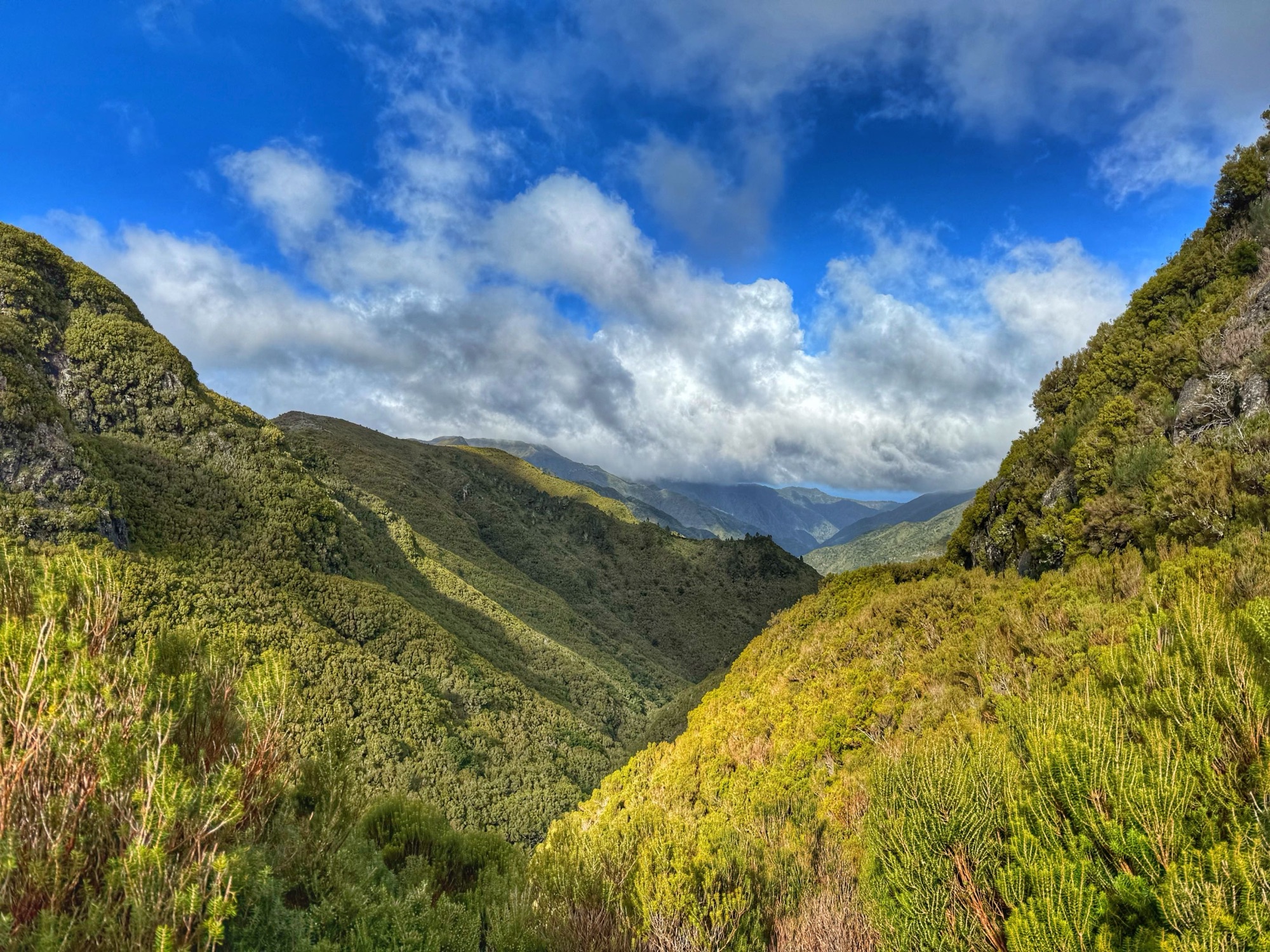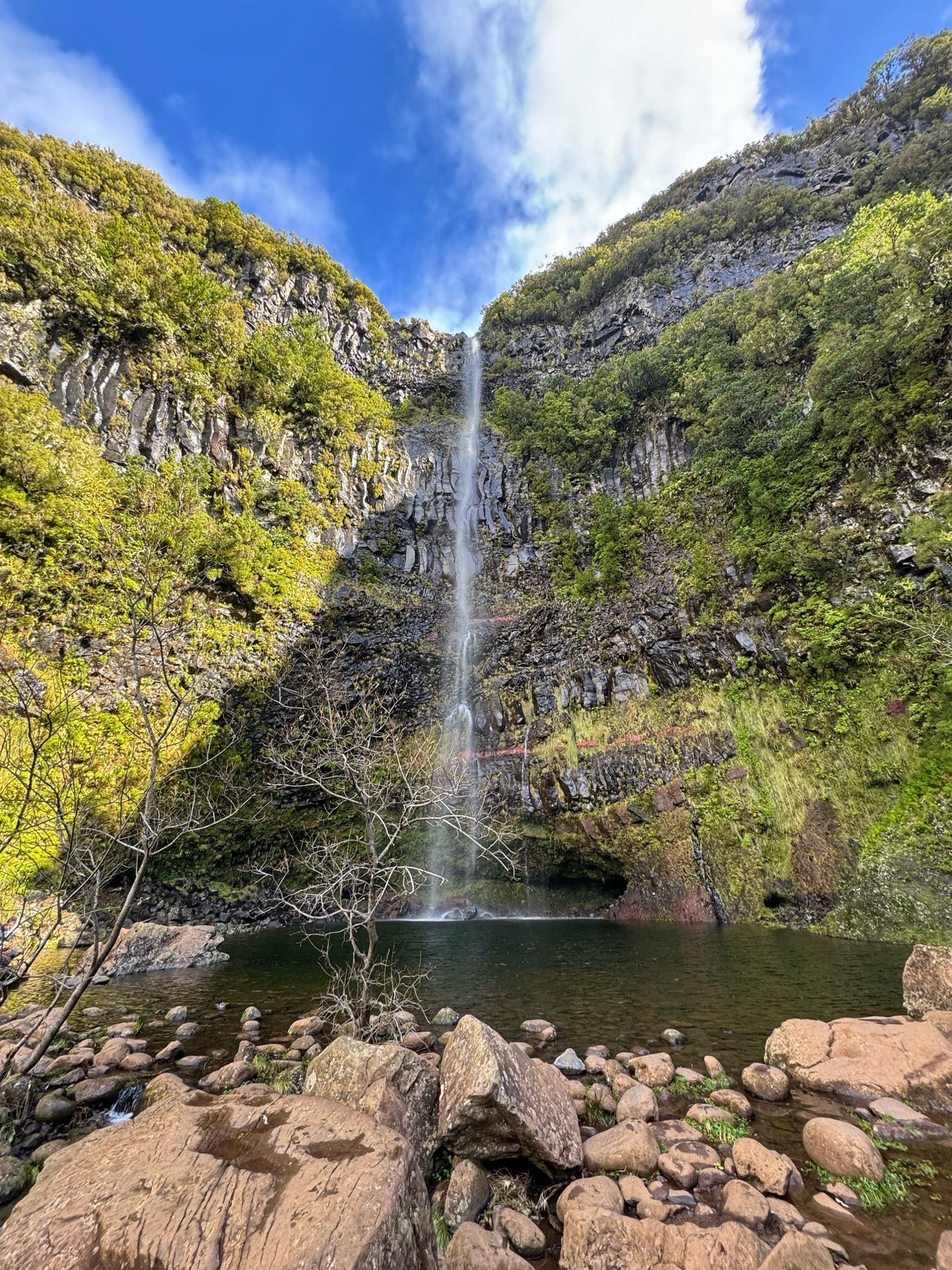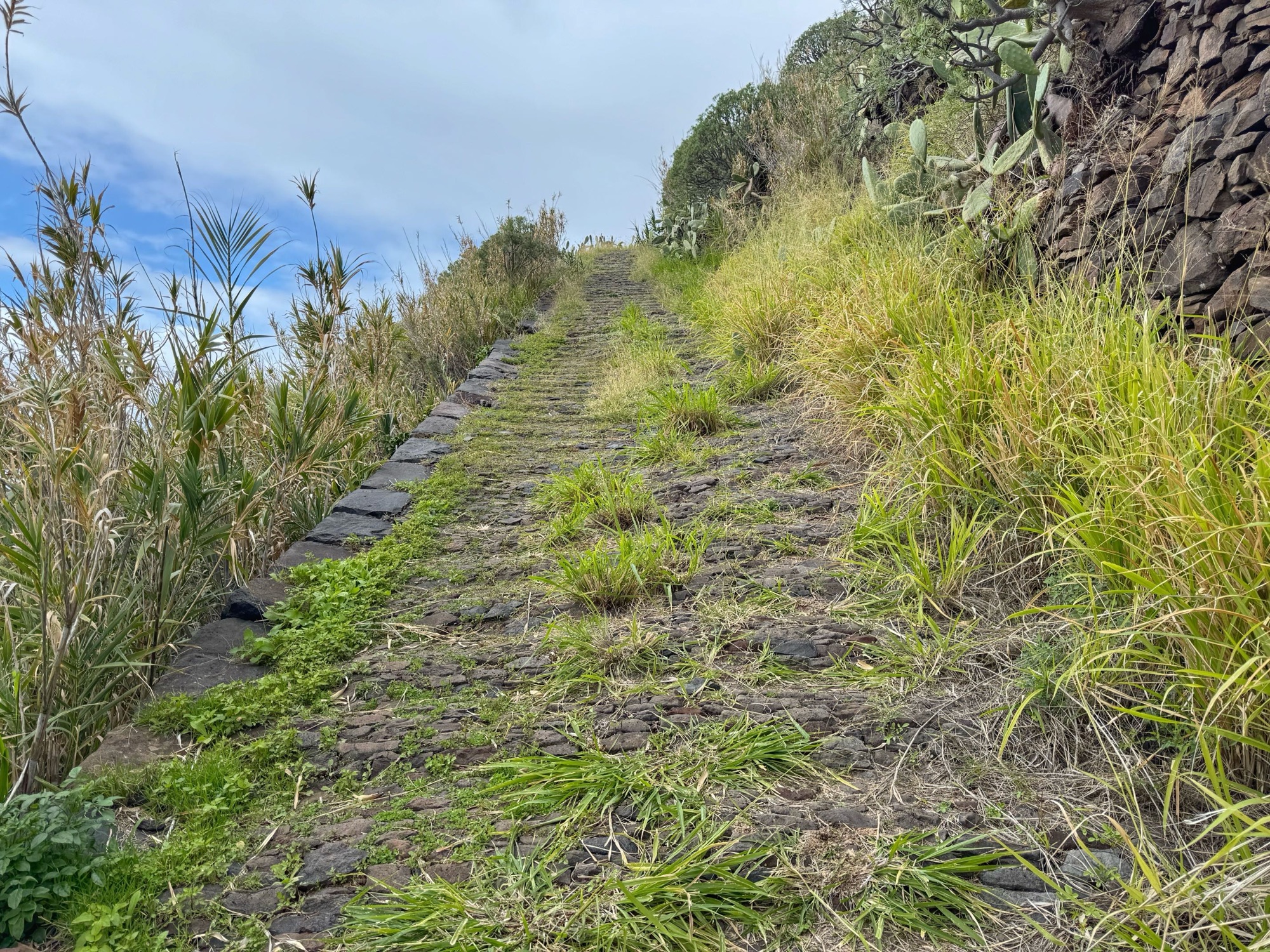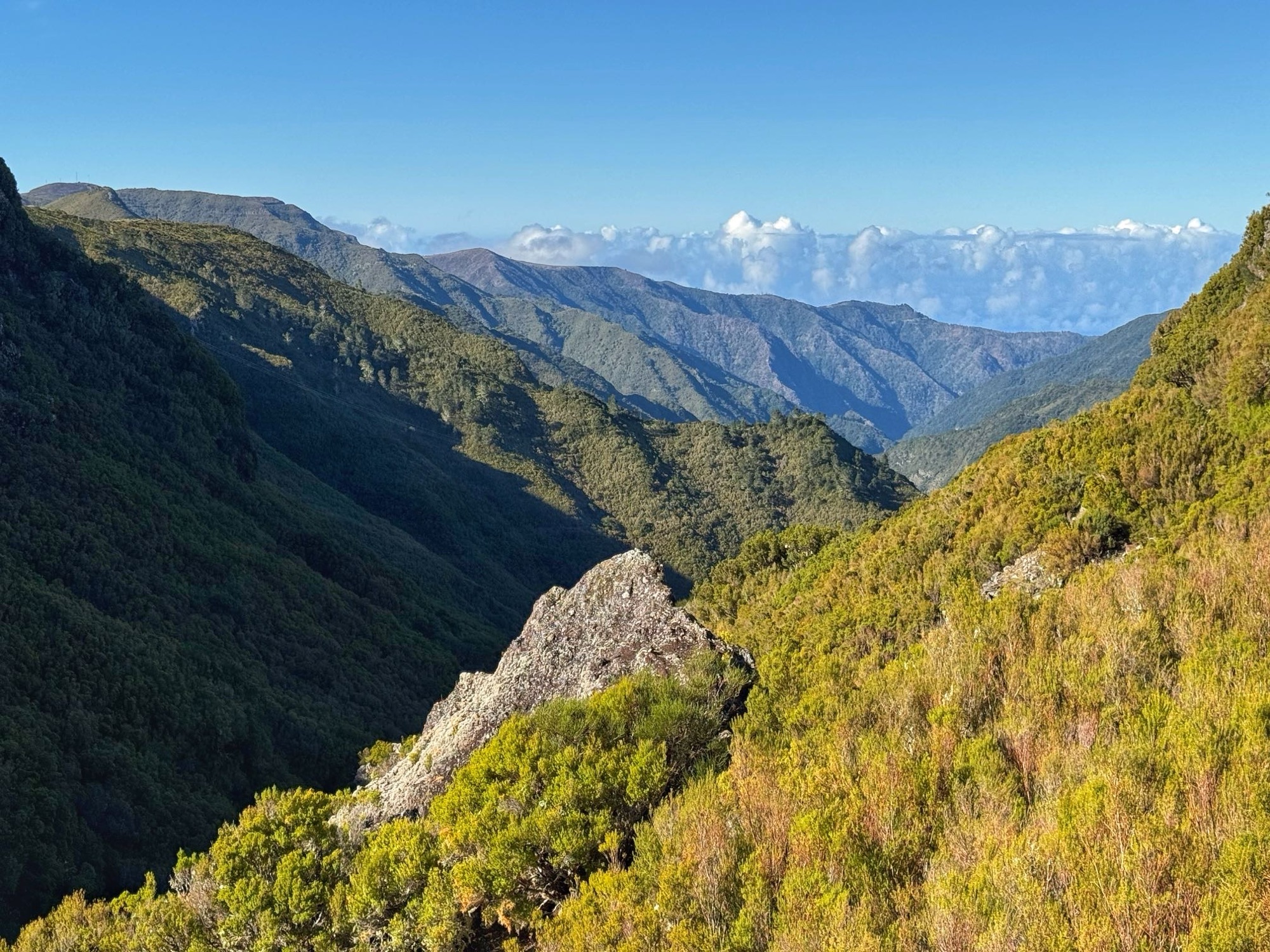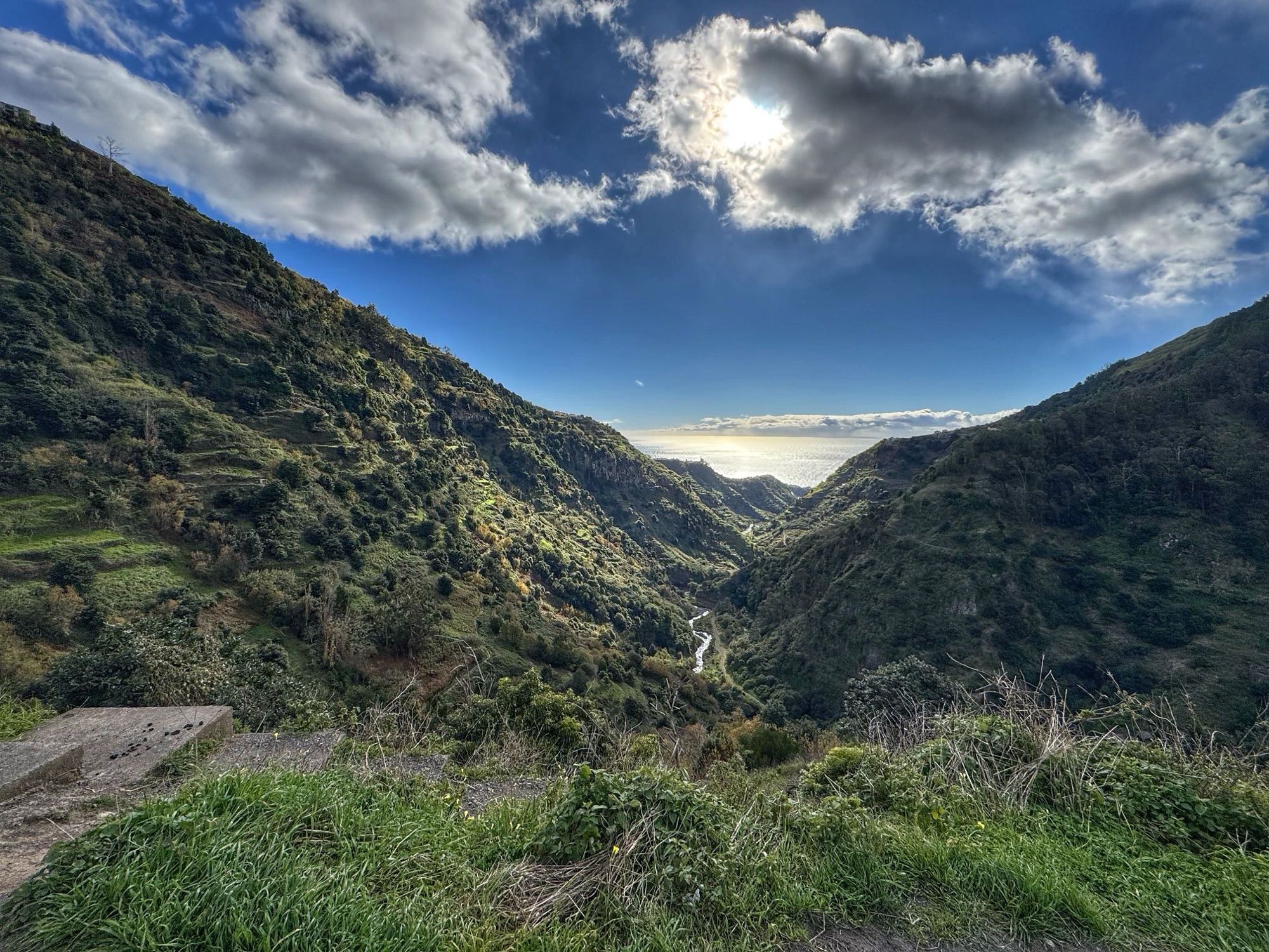 Rechts ist Felsen, das Wasser in der Levada ist hier mehr als knöchelhoch, gelaufen wird links vom Wasser auf der Mauer. Die zwei markanten Baumstämme sind Eukalyptusbäume – da es immer wieder regnet riecht es wechselnd und in Nuancen entweder wie im Blumen- oder im Gewürzladen. Wirklich aromatischer Waldduft, ganz toll. Der Regen stört uns nicht weiter. Bei etwa 14° und immer wieder durchschimmernder Sonne trocknen wir auch recht schnell wieder.