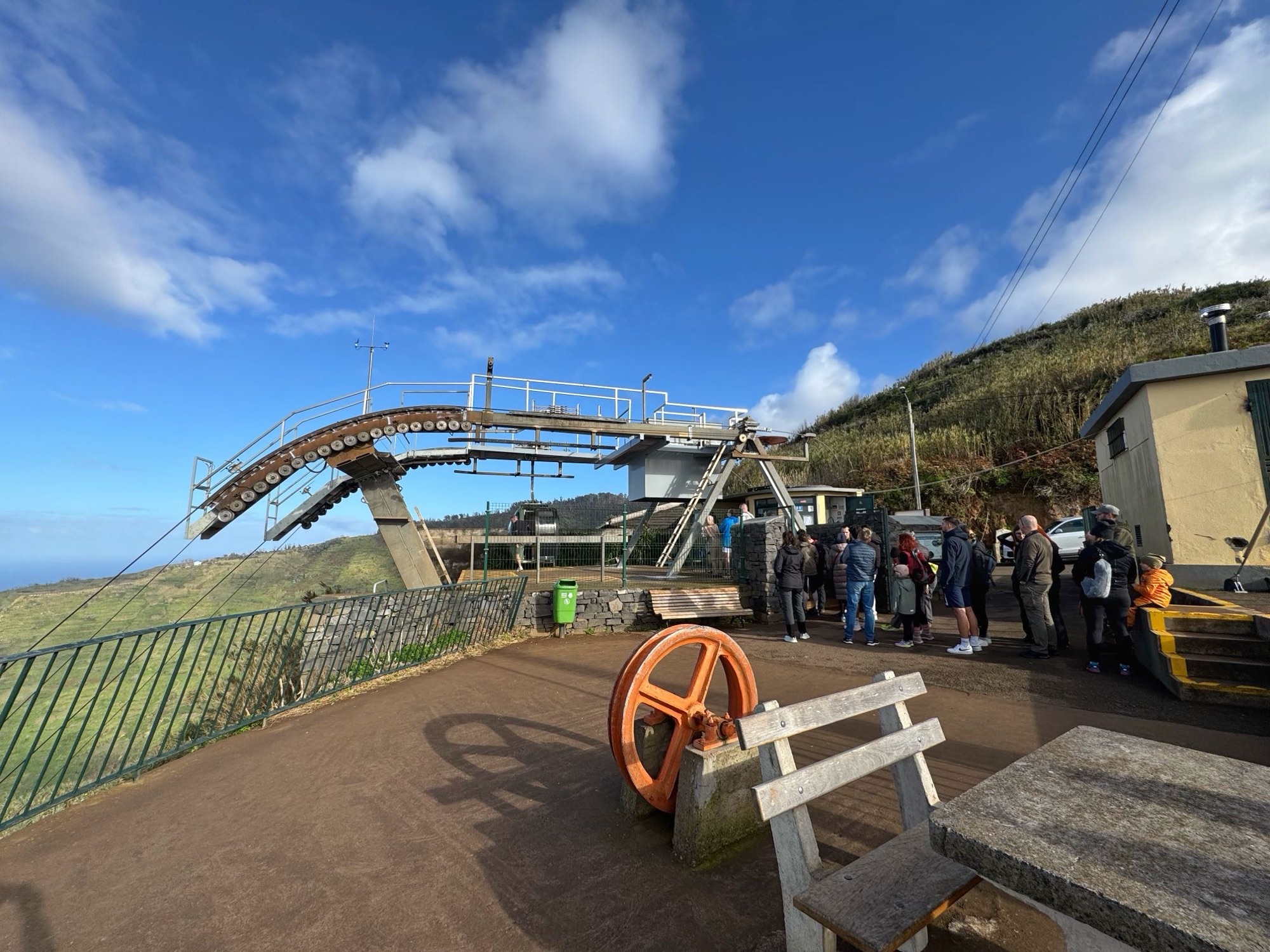Blick aus dem Bistro – sitzen wie die Einheimischen und weit oben verläuft die ZipLine.