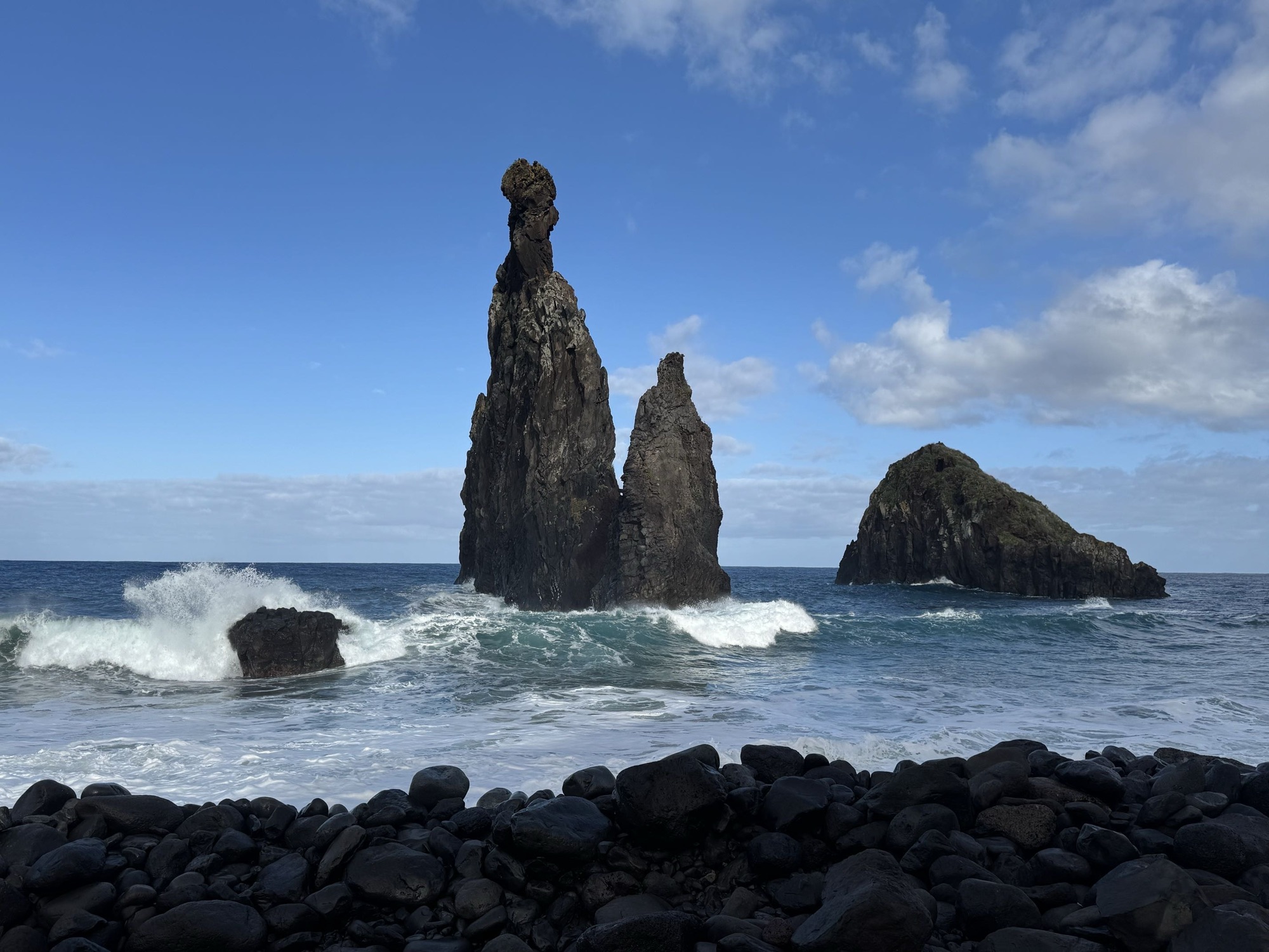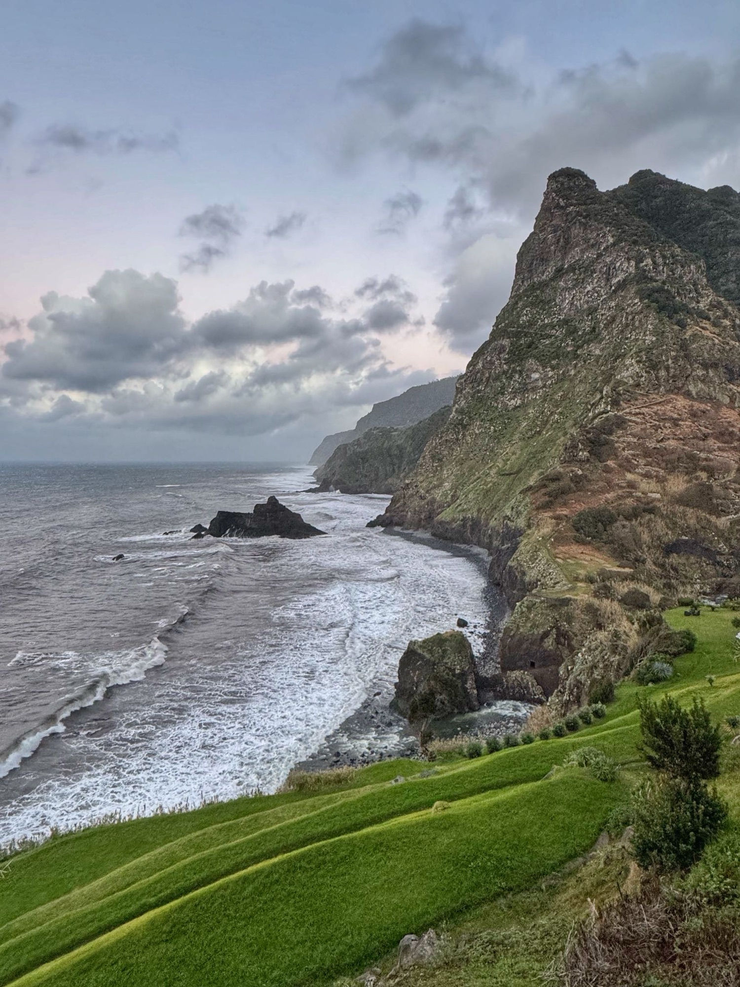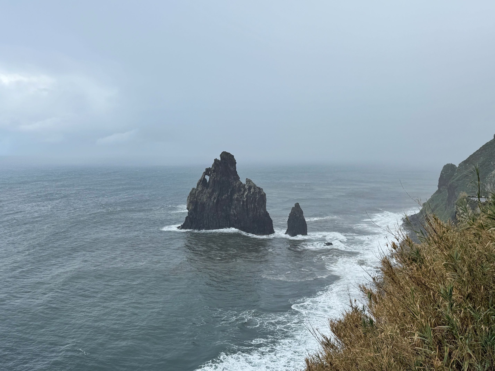 Nur 3 Minuten später stehen wir am Nordstrand am Aussichtspunkt „Miradouro dos Ilhéus da Ribeira da Janela“. Der Atlantik schickt beeindruckende, teils bedrohliche Wellen an den Strand. Ein Wunder, dass die kleine Felsspitze dem Druck standhalten kann.