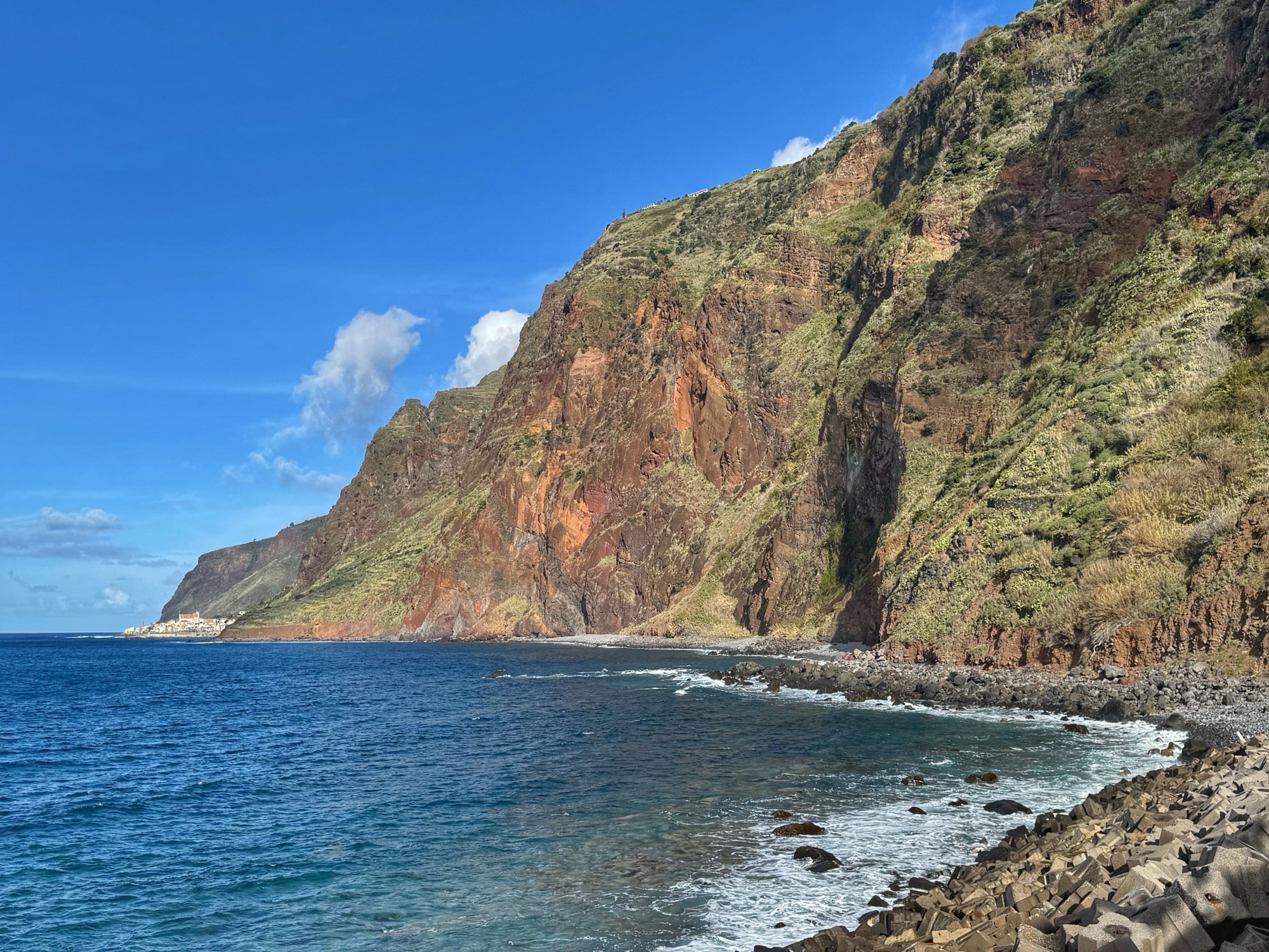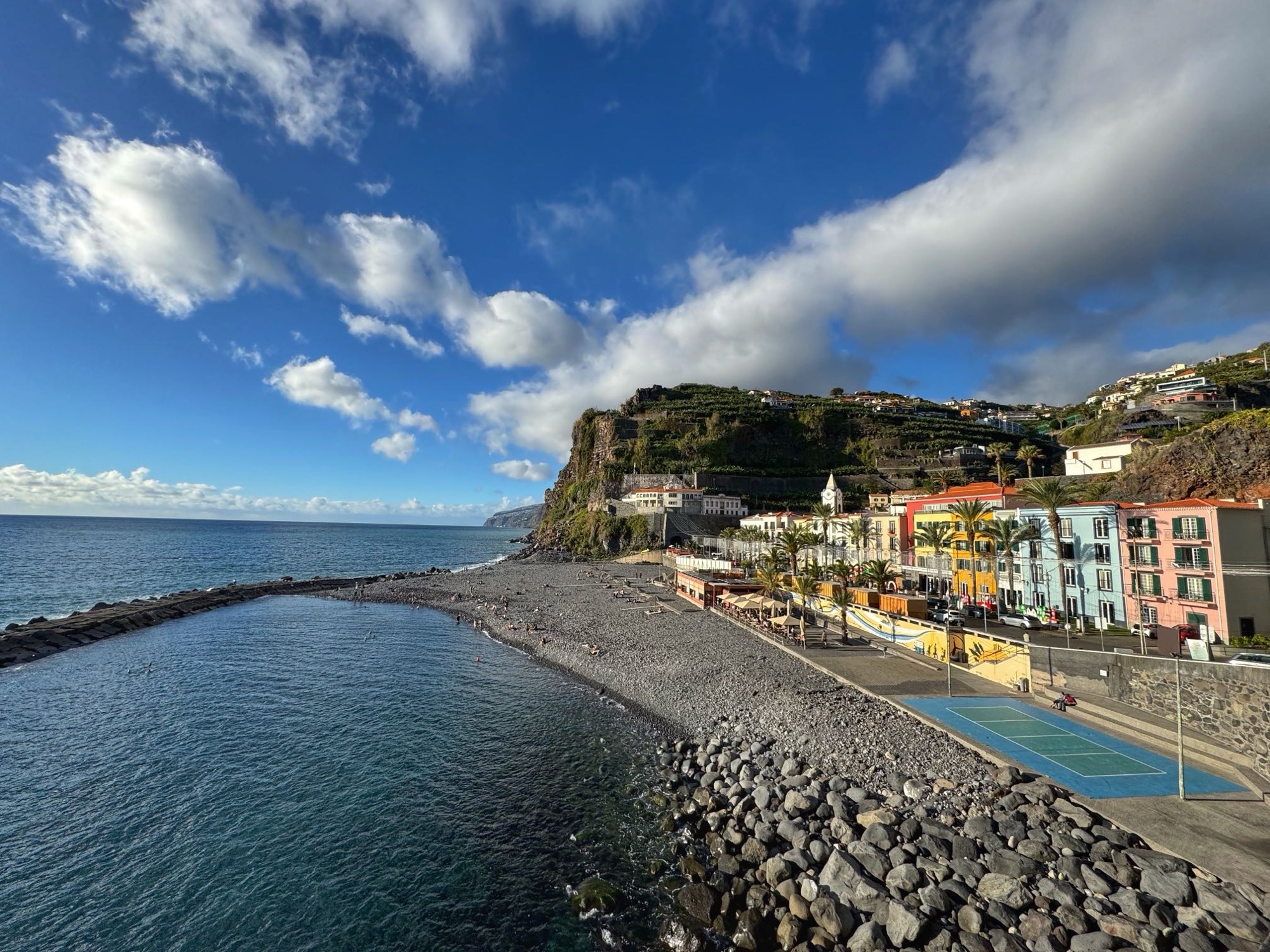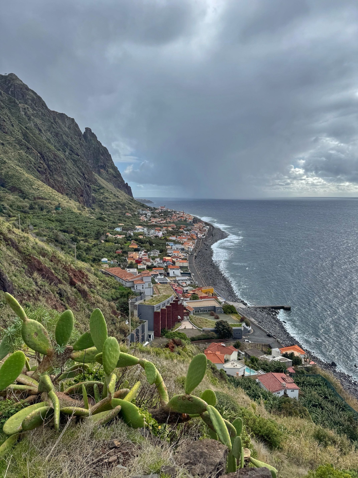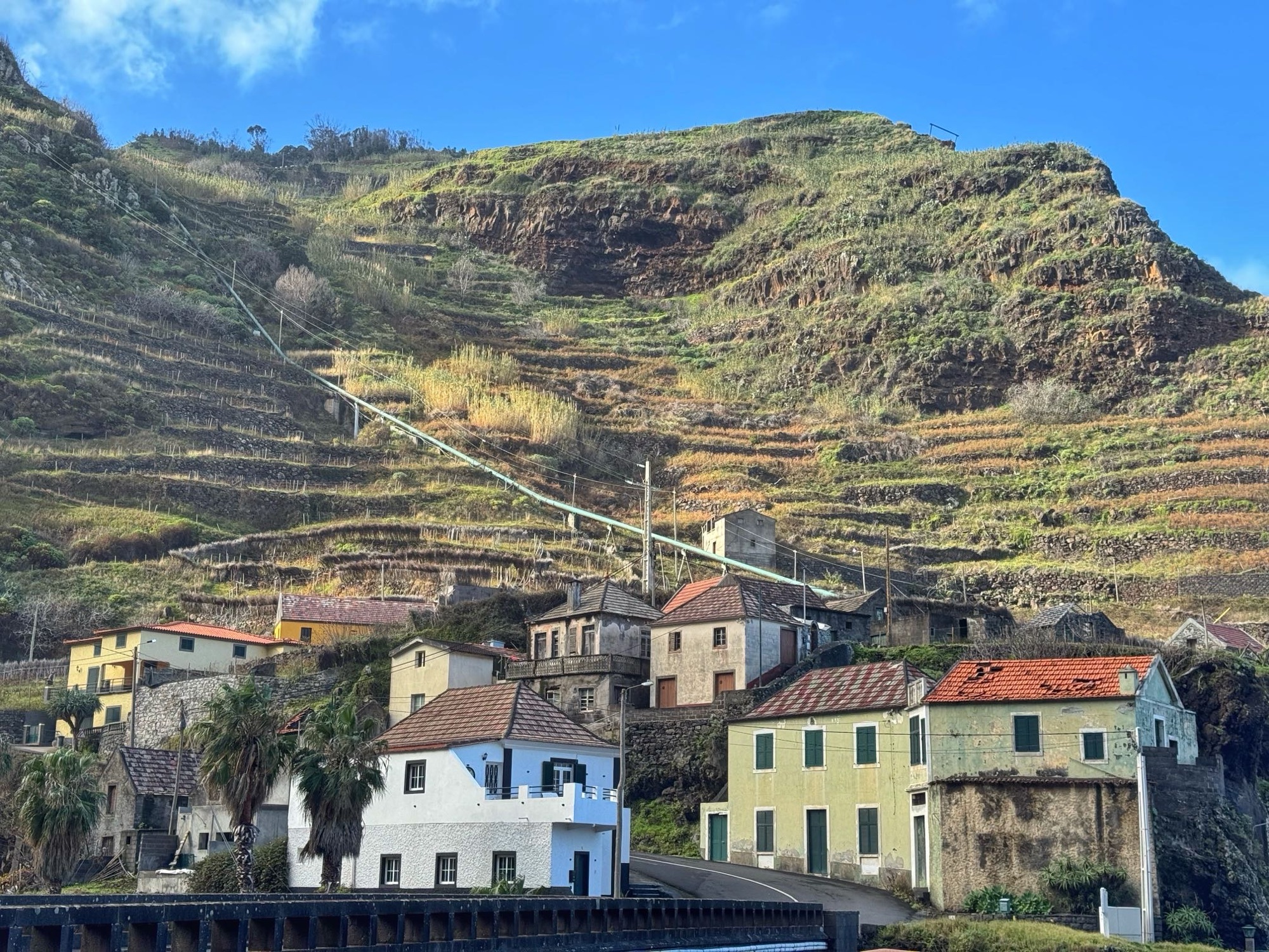 Paar Meter weg vom Strand erwische ich diesen recht hübschen Blick auf die Terassenhänge und paar Häuser des Dörfchens Ribeira de Janela. Schaut alles ganz ruhig und idyllisch aus – rund um uns tummeln sich allerdings eine Menge Touristen.