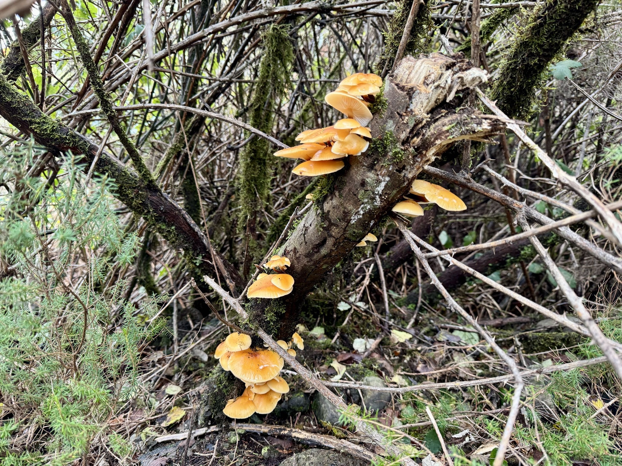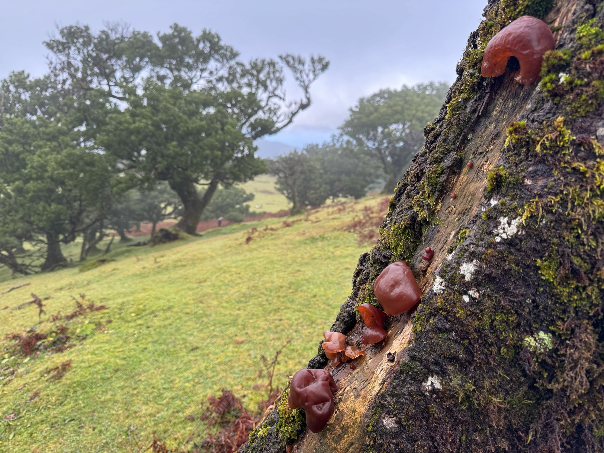 Das einige Bäume dem Tod geweiht sind, verraten die fleißig am Stamm nagenden Zersetzerpilze – die lieben Judasohren, die sich hier aufgrund der Feuchtigkeit mächtig vollgesogen haben und deshalb etwas mehr aufgequollen aussehen.