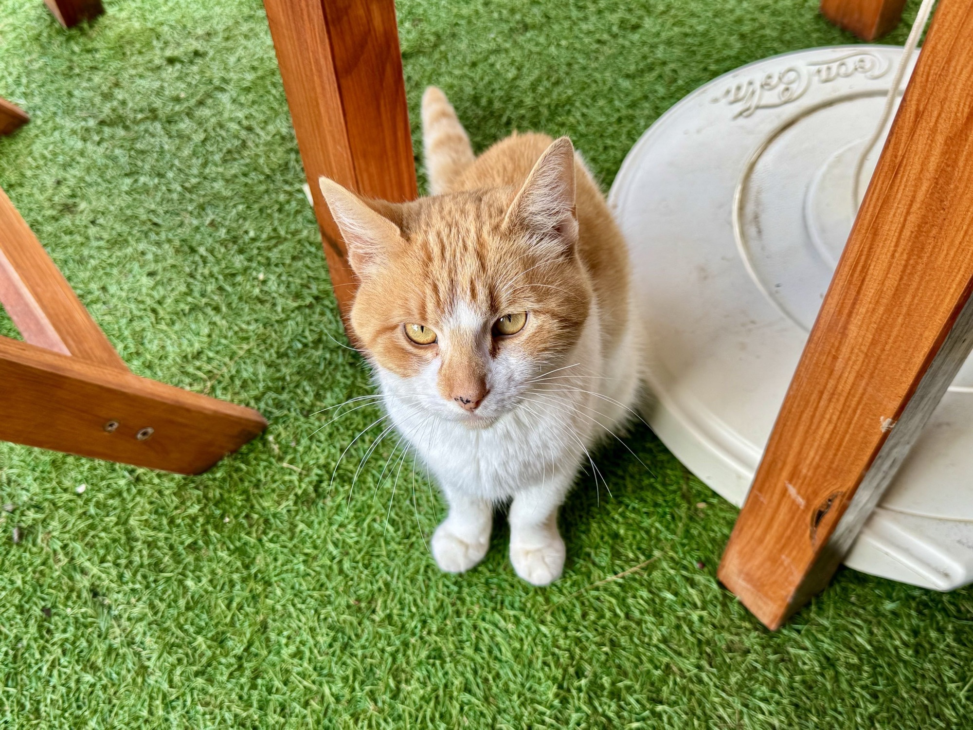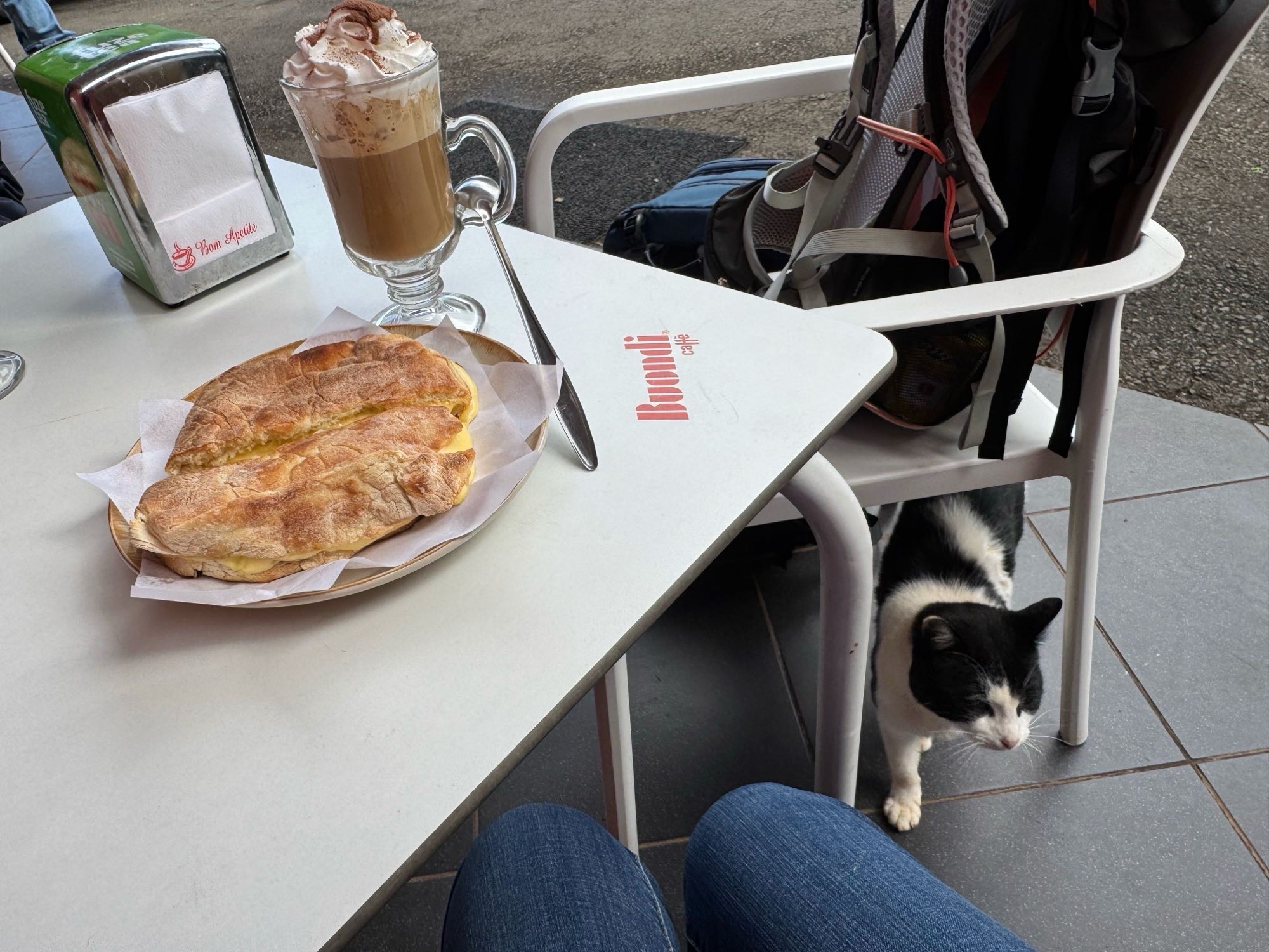 Kaum sitzen wir vorm Bistro auf der Plastik-Combo – schleicht sich eine bettelnde Katze an. Mit ihrem Blick hypnotisiert sie mich, will mich zum teilen animieren. Nix da – wir füttern keine fremden Tiere.