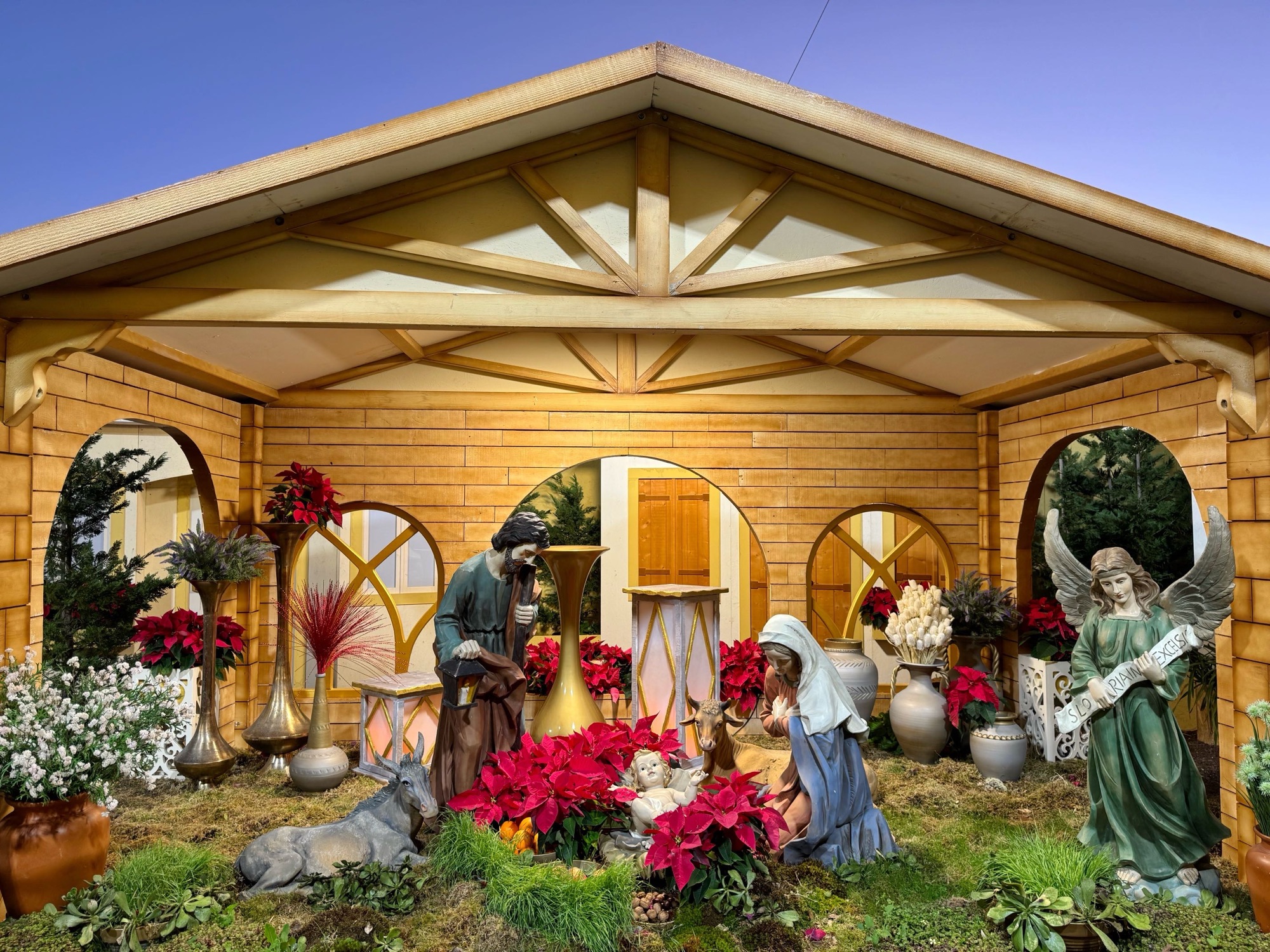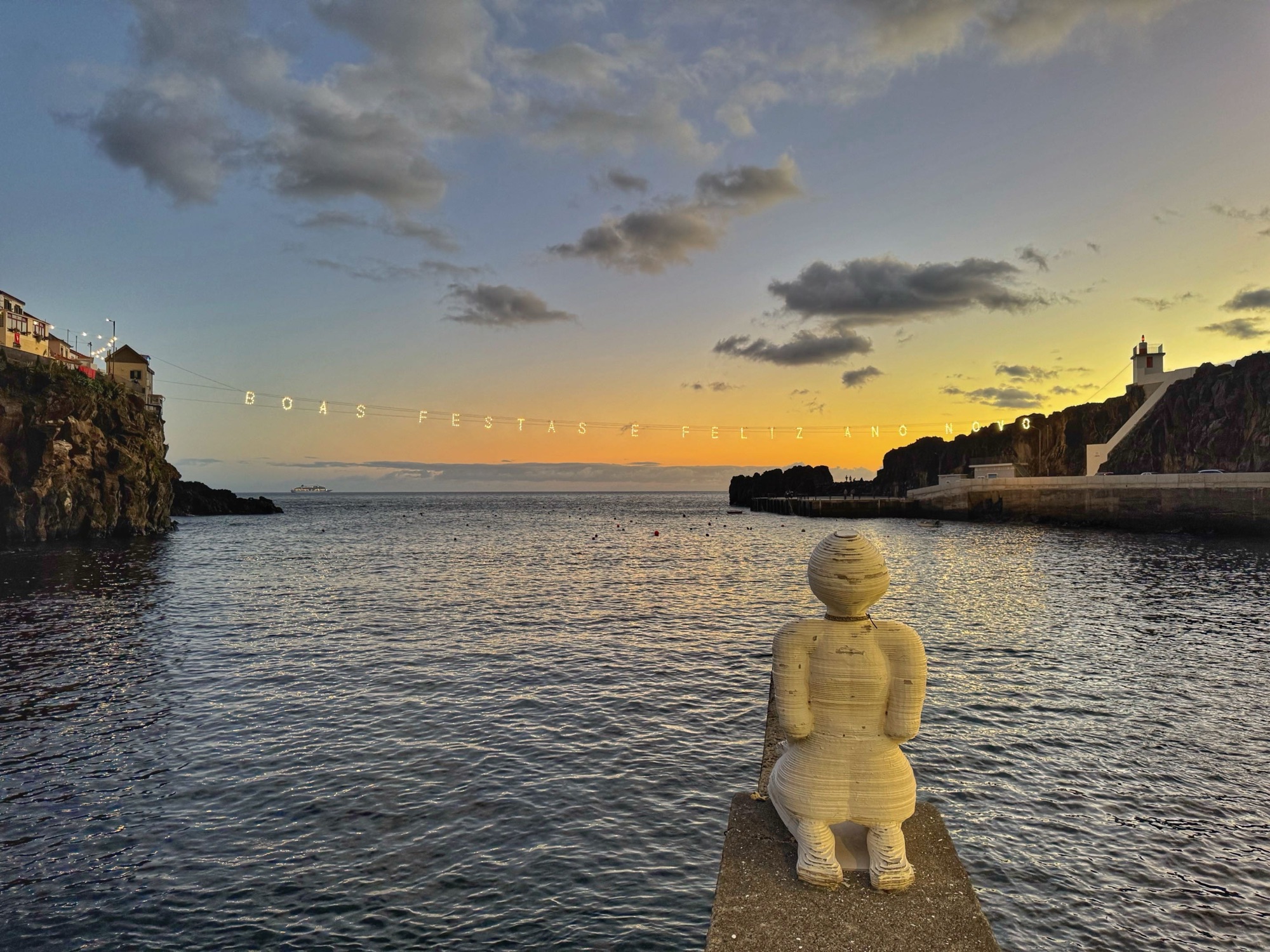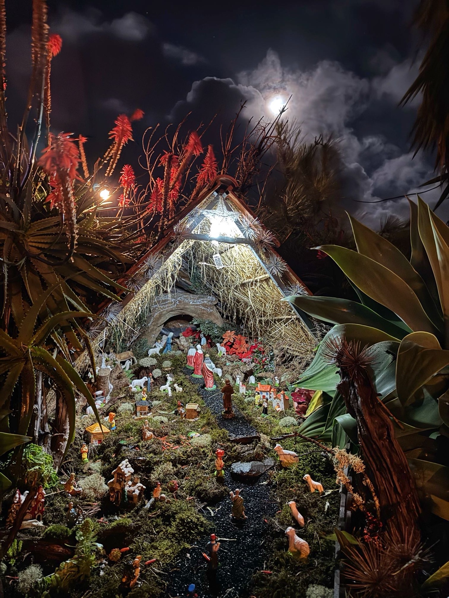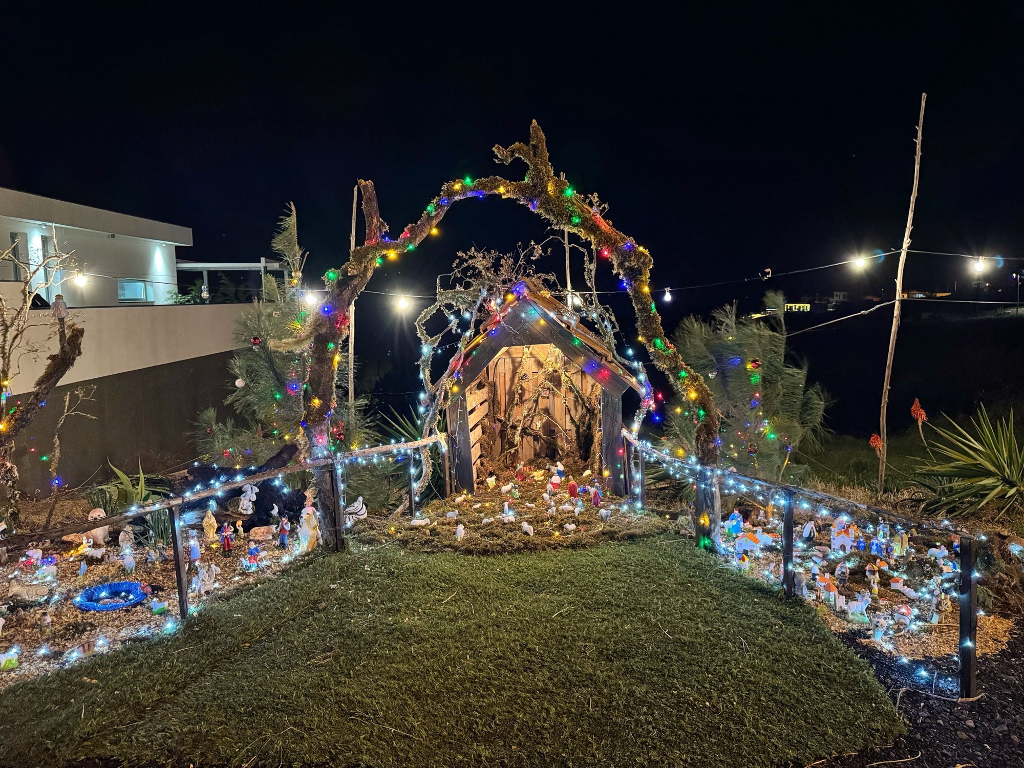 Und endlich klappt es, dass ich an einer Krippe in unserem Ort Prazeres nochmal aussteige. Häufig sind wir abends hier vorbeidgedüst, ich muss die einfach noch fotografieren – auch hier gar nicht so leicht. Dunkelheit einerseits, der hell erleuchtete Mond und alles wird durch den Sturm durchgeschüttelt. Deshalb ist die Umgebung unscharf.