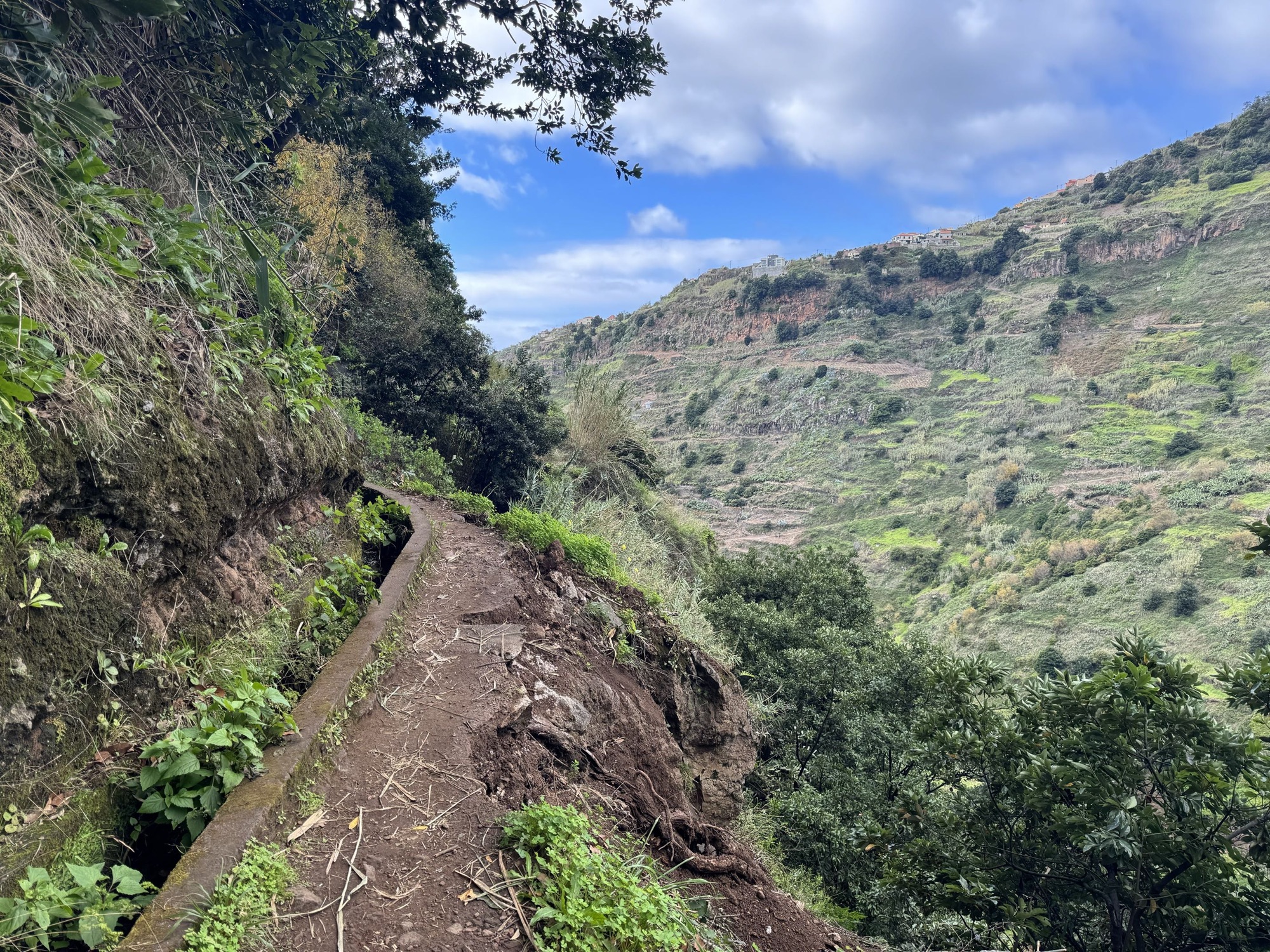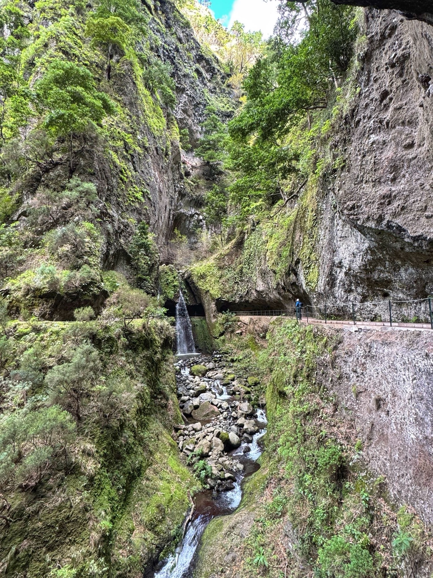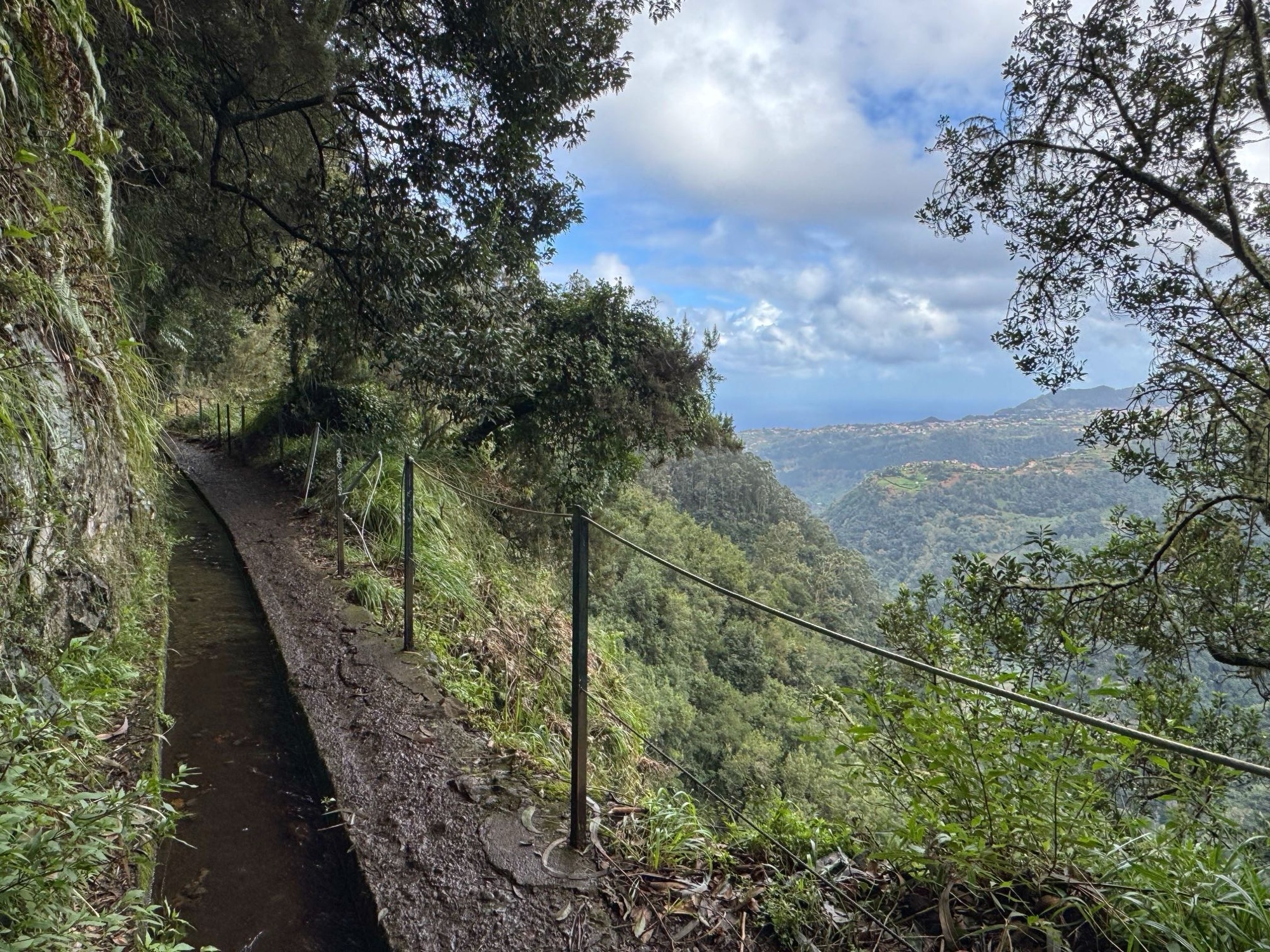 Auf dem kommenden Bild siehst du einen kleinen Eindruck von „minimal gefährlich“. Absturz ist auf dieser Levada bei Unachtsamkeit möglich aber eher unwahrscheinlich. Natürlich ist der nasse Boden rutschig, auch das birgt ein gewisses Risiko, was für uns aber keine große Hürde dargestellt hat.