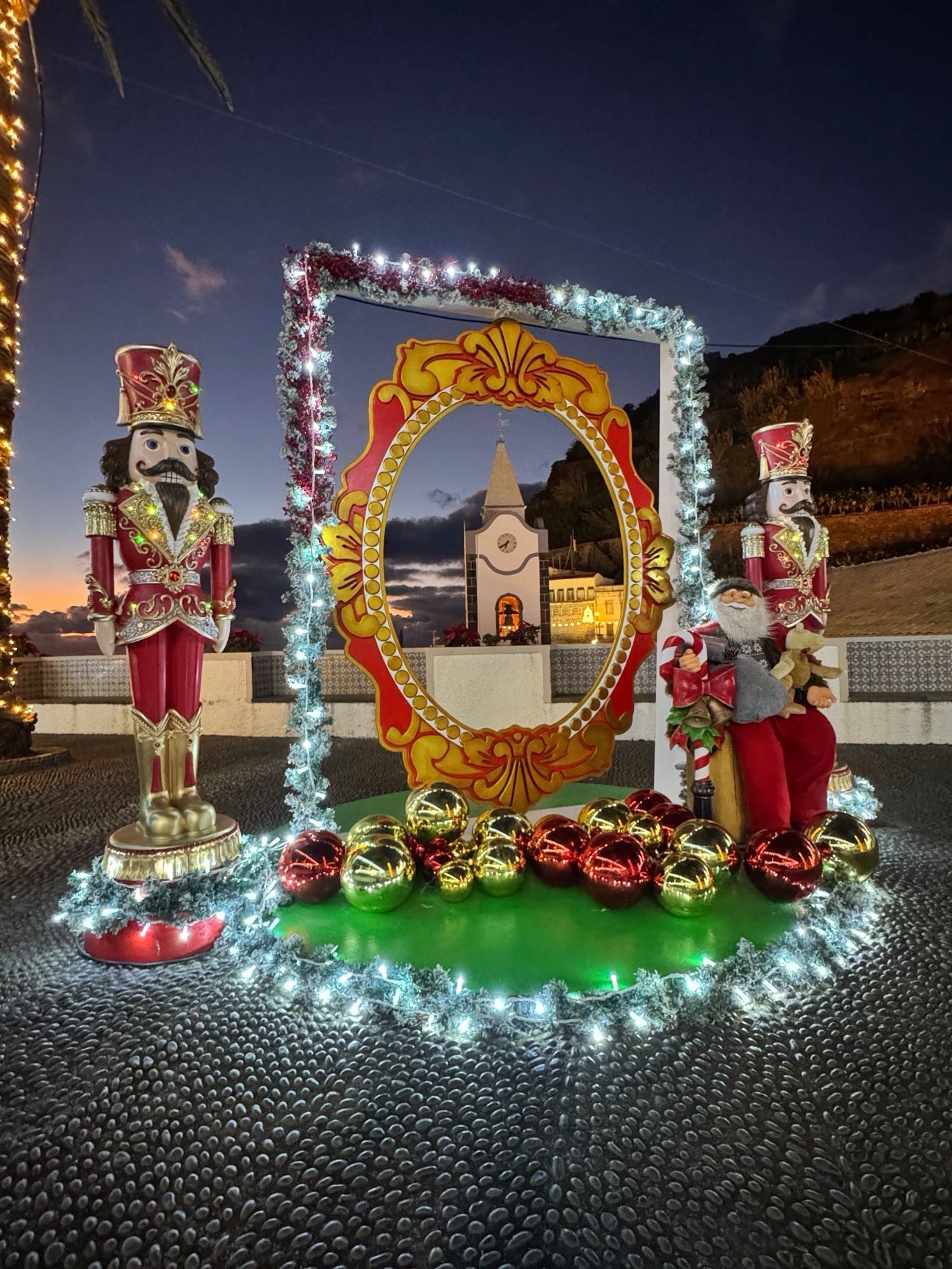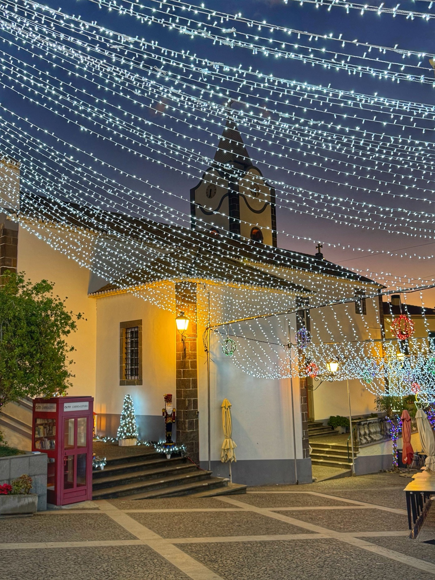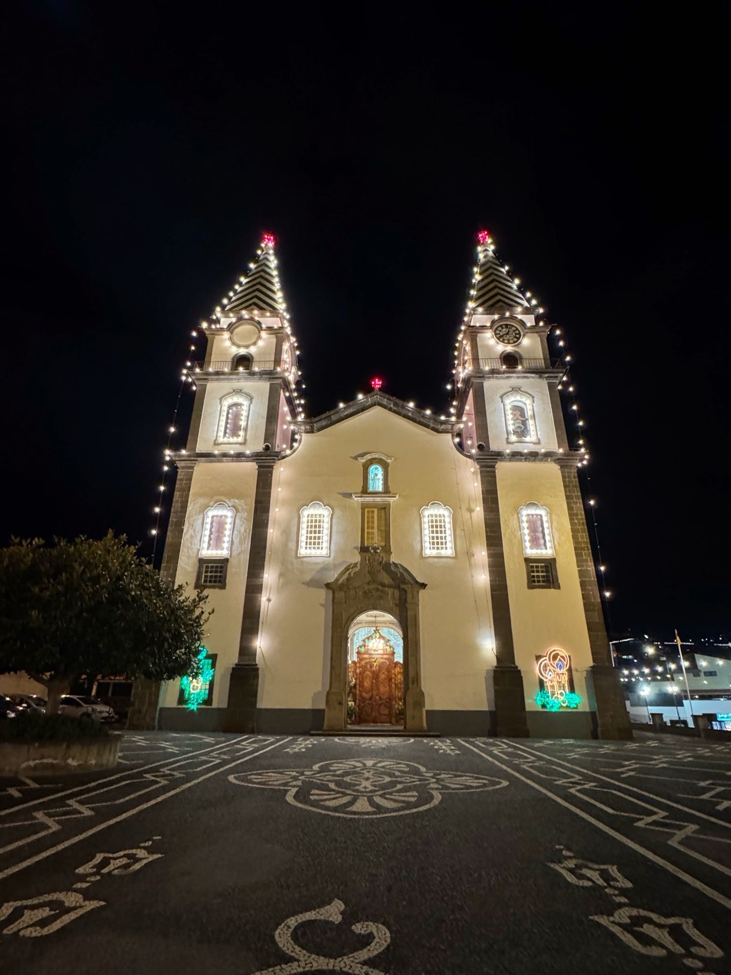 Kirche in Prazeres mit Weihnachtsbeleuchtung
