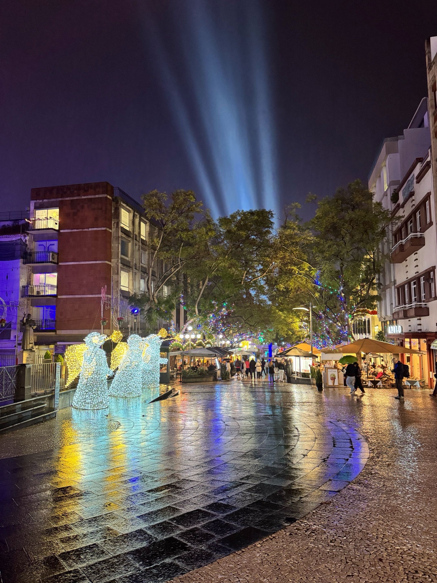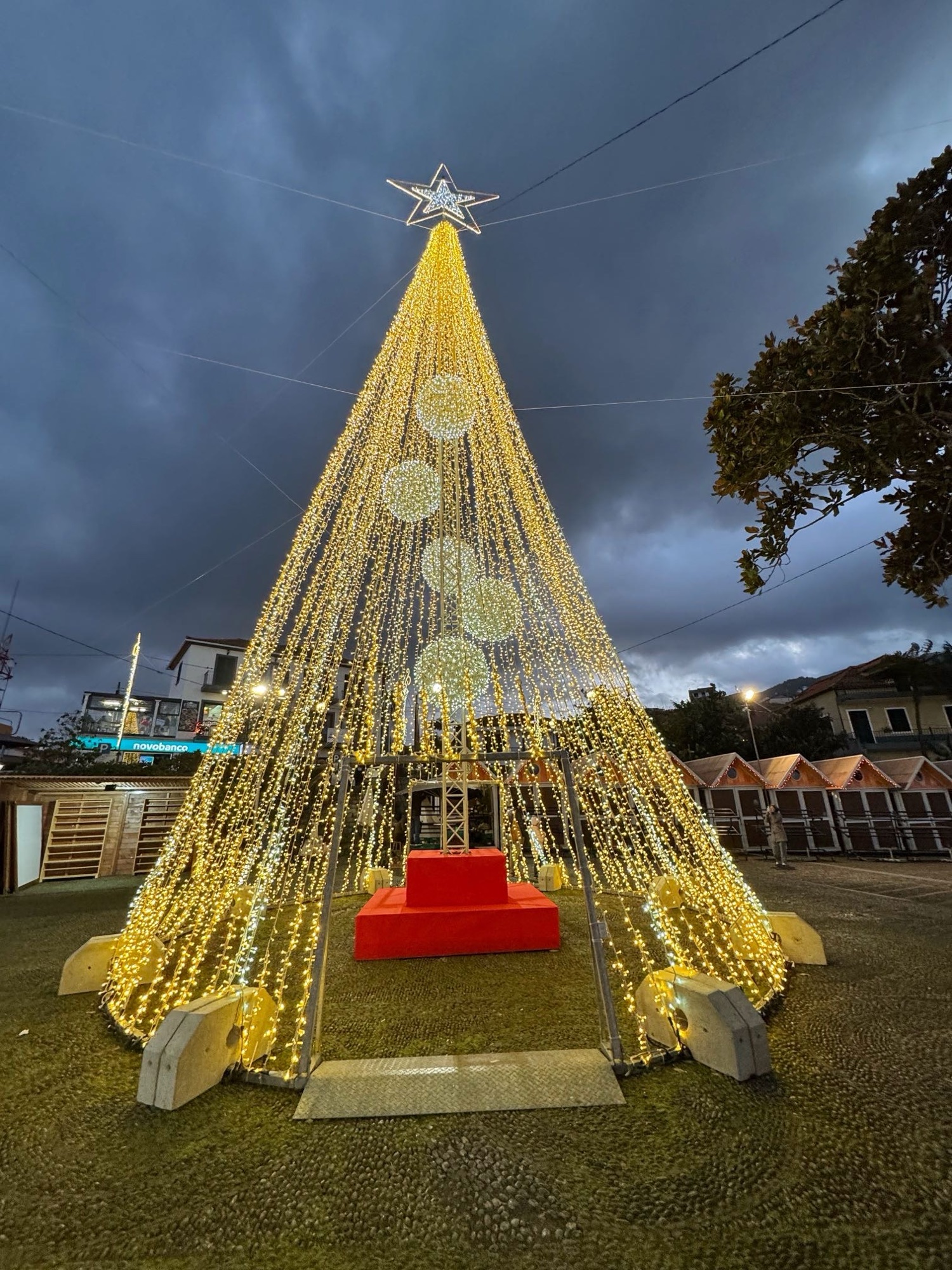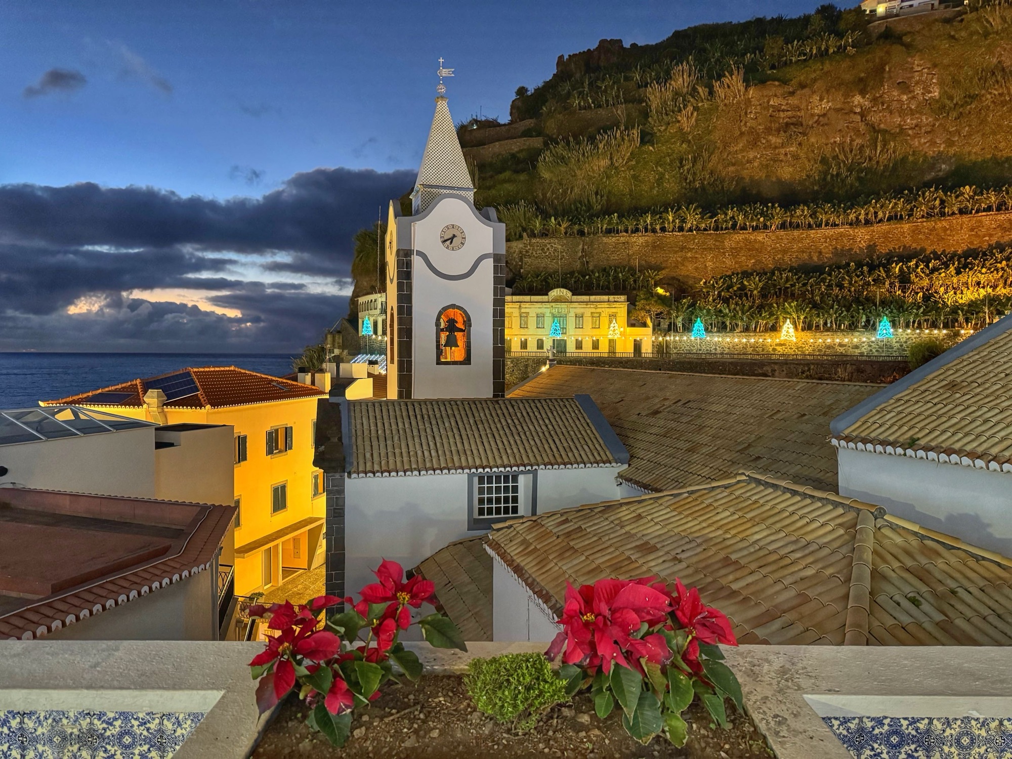 Kirche in Prazeres mit Weihnachtsbeleuchtung