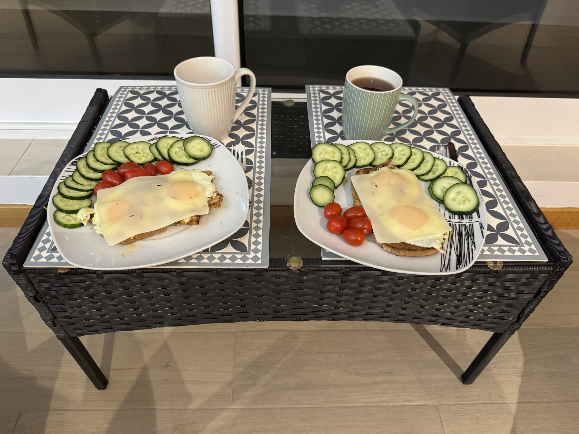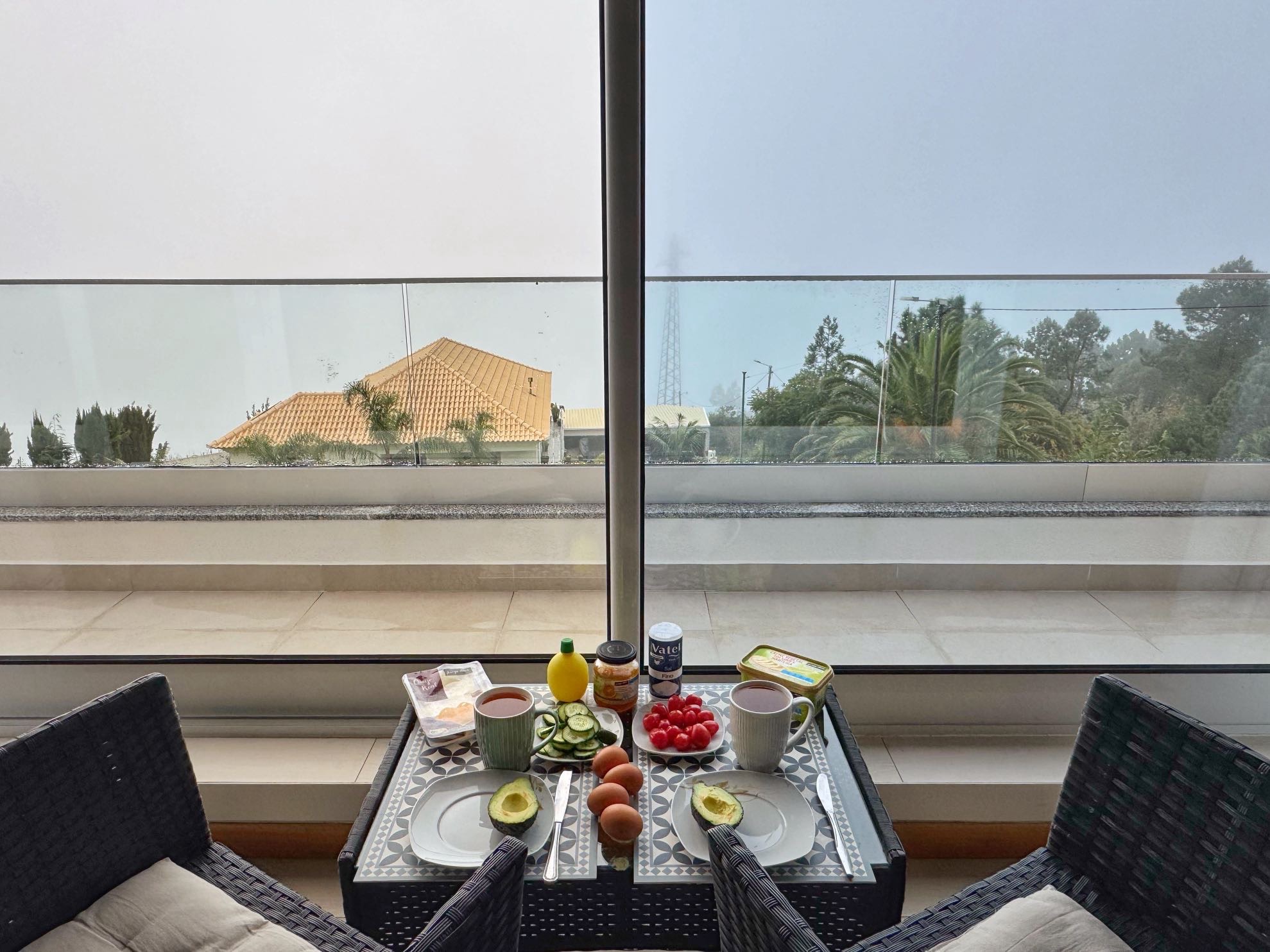 Den ersten vollständigen Tag wollen wir es ruhig und langsam angehen lassen, wir sind immer noch von den letzten Arbeitswochen und der Anreise müde. Erst mal ein schönes Frühstück. Wie fast immer im Urlaub gibt es Müsli und den ersten Blick bei Tageslicht aus dem Fenster: