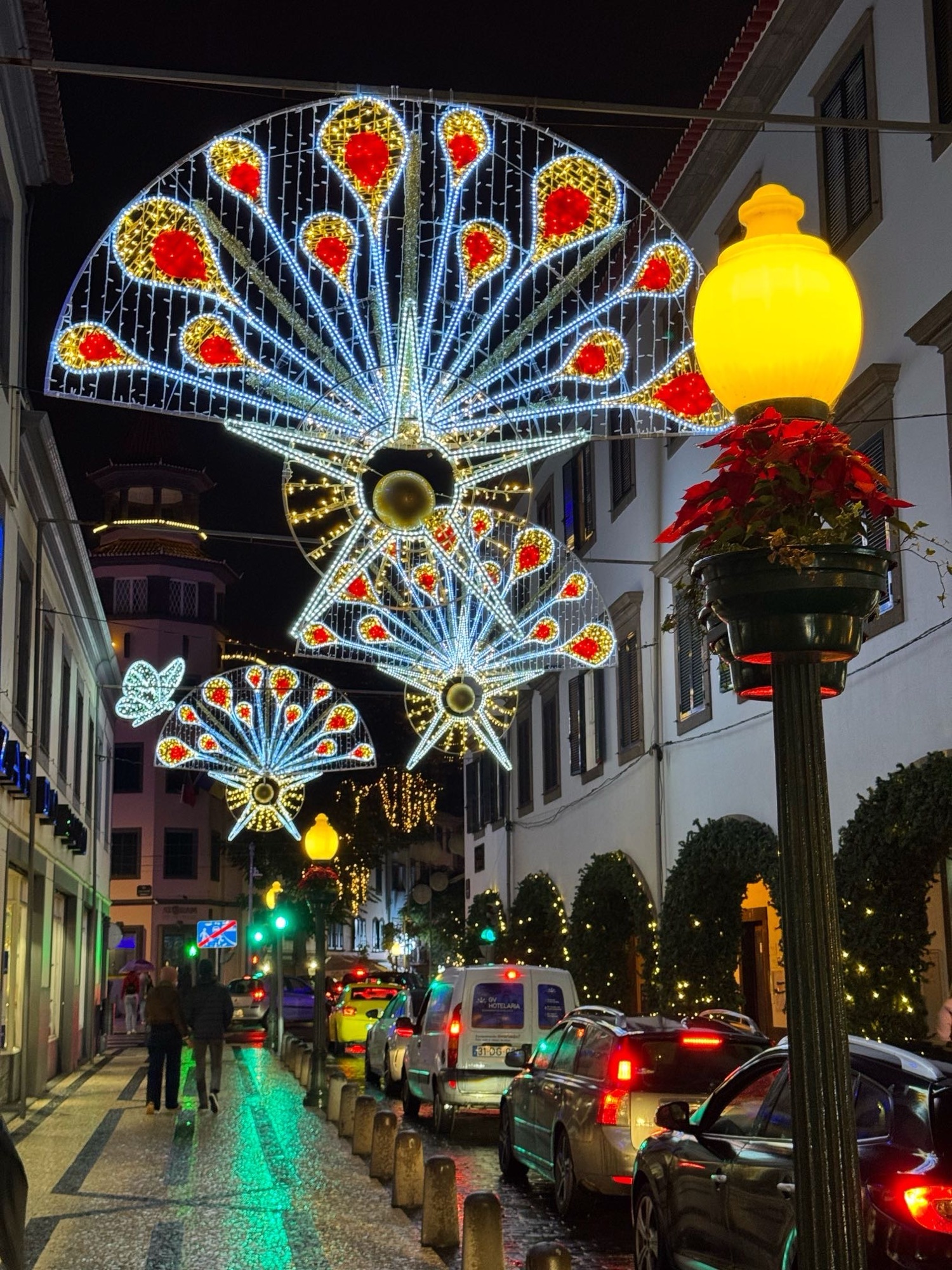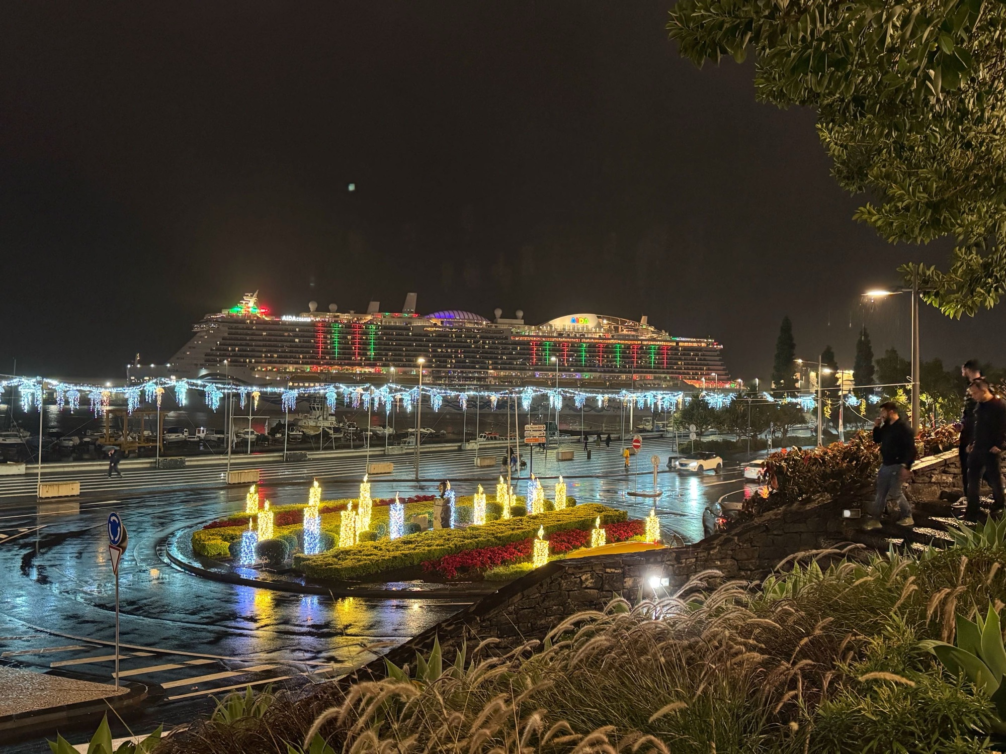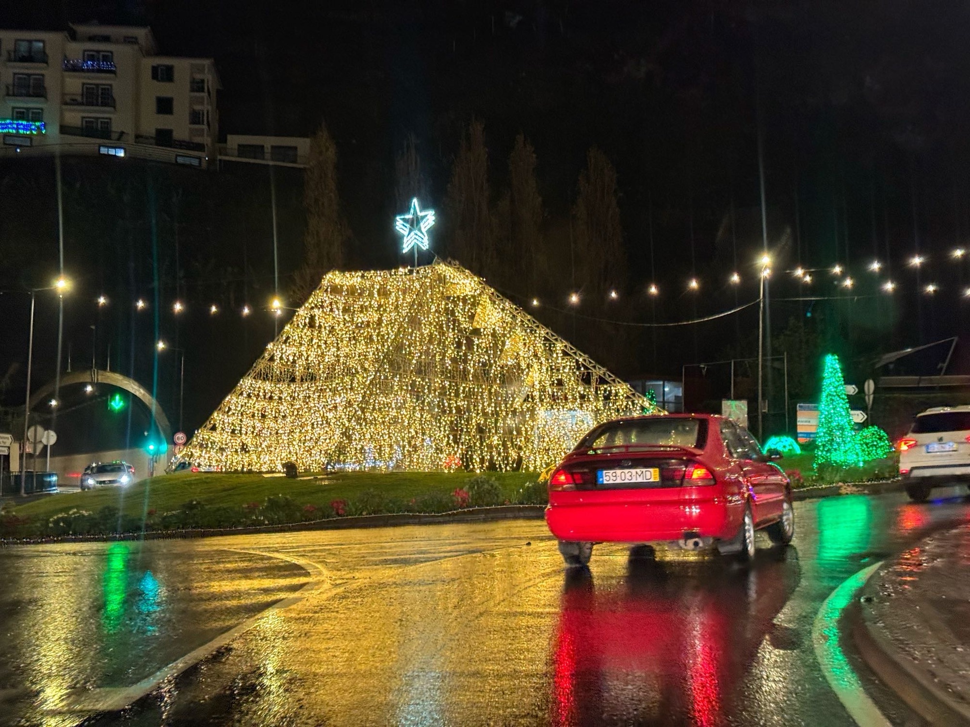 Kleiner Eindruck zumindest von einem der unzählig und variationsreich erleuchteten Kreisverkehre. Aus einem Tunnel raus, um so einen Kreisverkehr drumherum gefahren und in den nächsten Tunnel rein. Das ist Madeira.