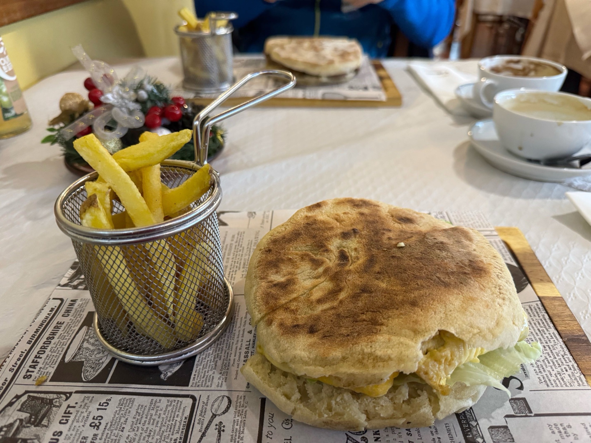 Wir nehmen das einzige Essen, was es gibt. Ein im Toaster schön heiß gemachten Sandwich mit viel Käse und Knoblauchbutter. Dazu einen Cappuccino auf den ein Klecks Schlagsahne und noch Kakao kommt.