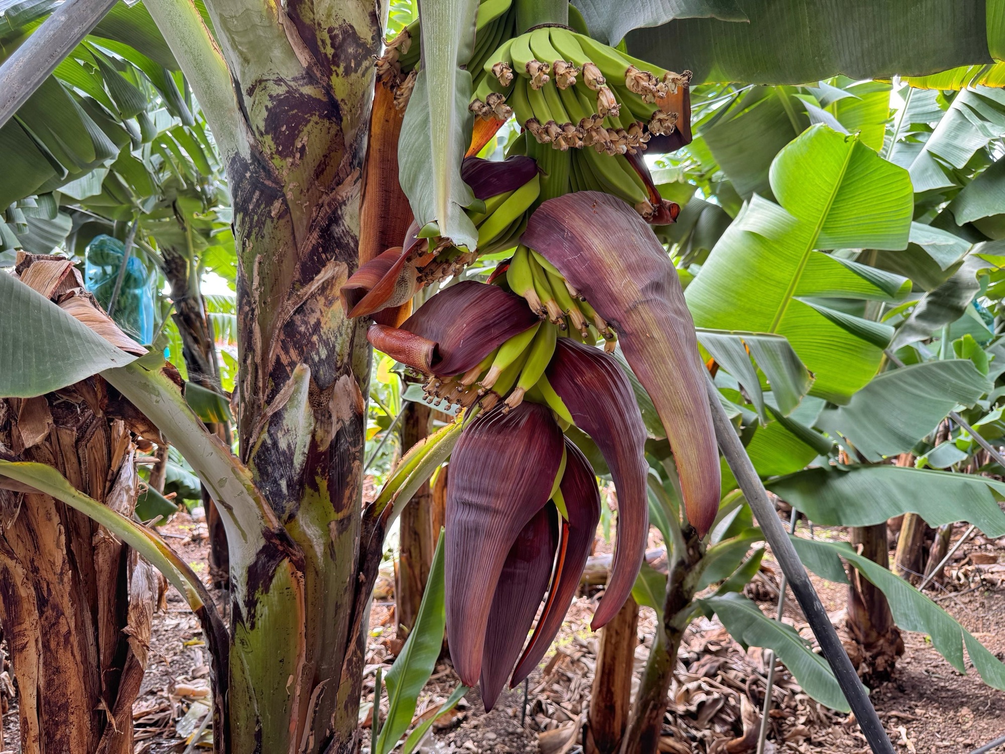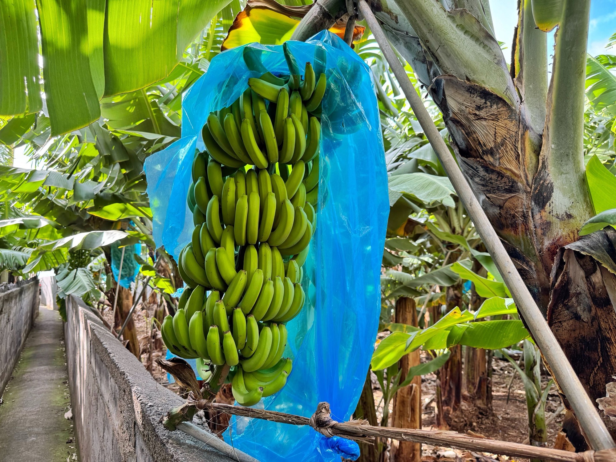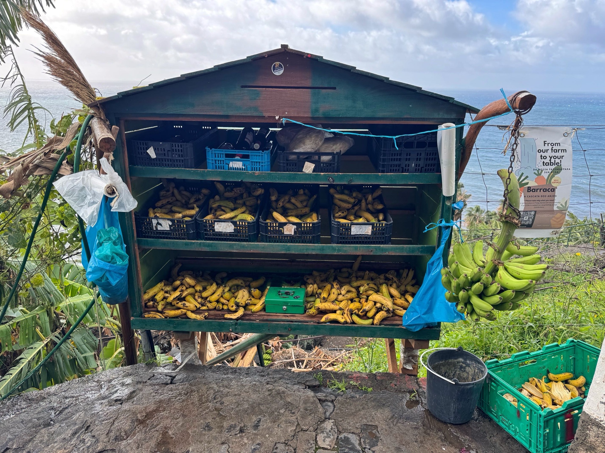 Immerhin macht einer ein kleines Geschäft. An einer Bananenplantage werden Bananen verkauft – wir nehmen welche. Es gibt die Kasse des Vertrauens und wer kein Kleingeld hat, kann über einen Scan-Code online überweisen.