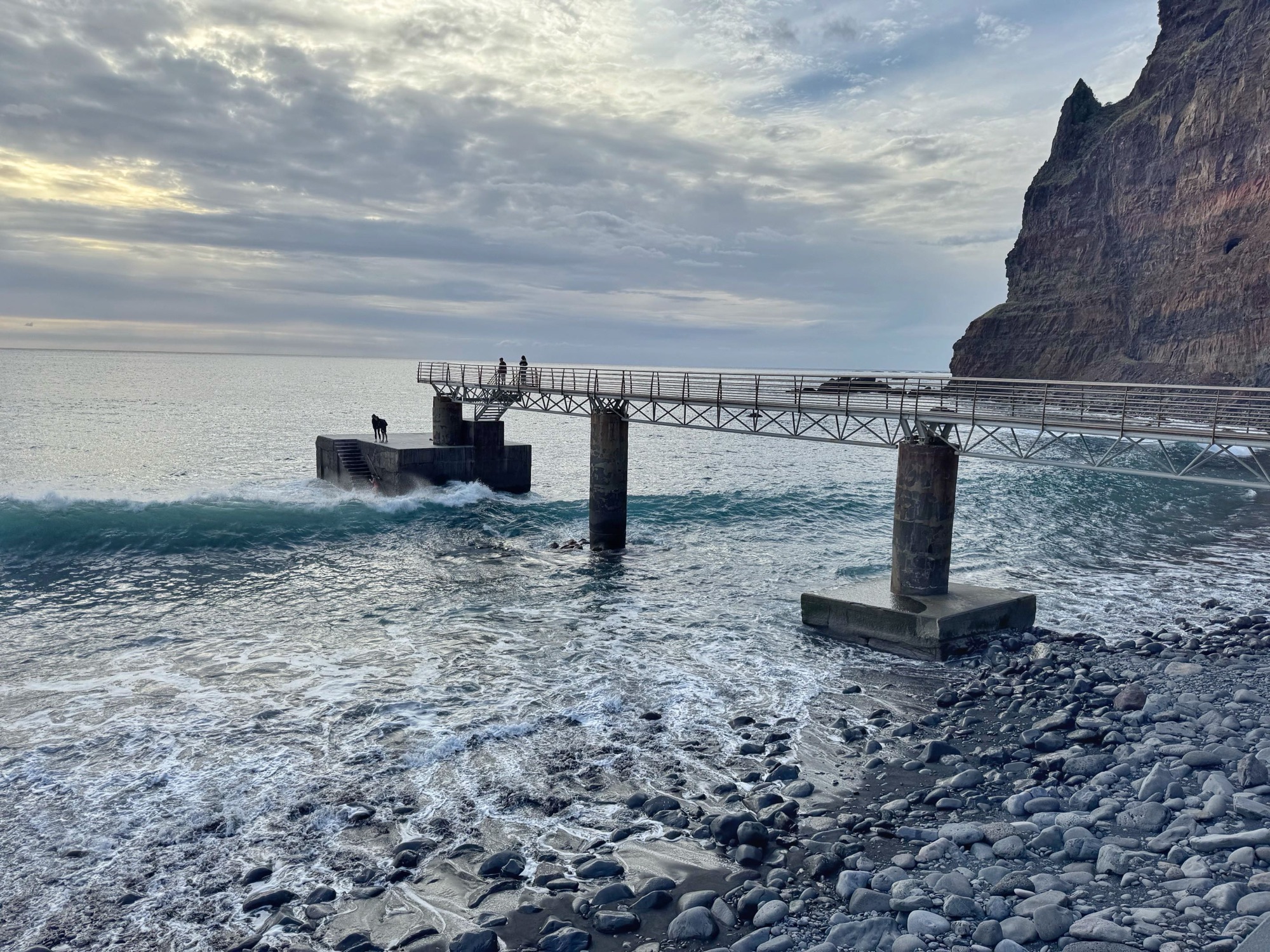 Am nächsten Stop erhaschen wir diesen Blick auf Seixal. Die vorgelagerten Meerwasserschwimmbecken werden durch die stürmischen Wellen geflutet, im geschützten Strandbereich versuchen sich paar Surfer. Während ich mir meinen Rolli anziehe, hüpfen andere im Badeanzug rum.