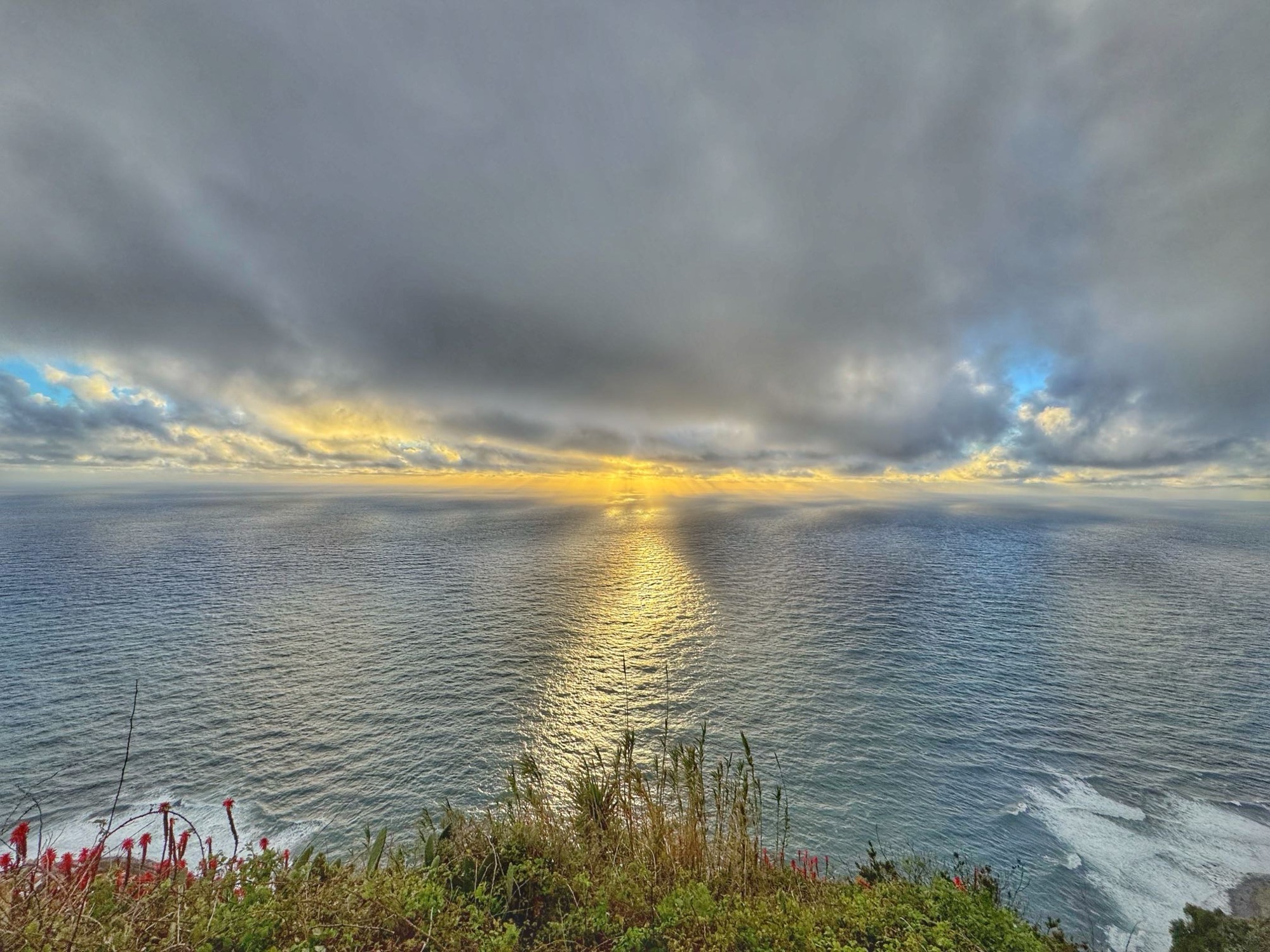 Am Abend erhoffen wir uns noch ein wenig Sonnenuntergang, der wird nahezu vollständig von einer dicken Regenwolke gekapert. Eine kleine Impression ist es noch geworden: Die Blüte des Tages sind diese fantastischen roten Blüten, sie gehören zur „Baum-Aloe“ oder auch „Fackel-Aloe“