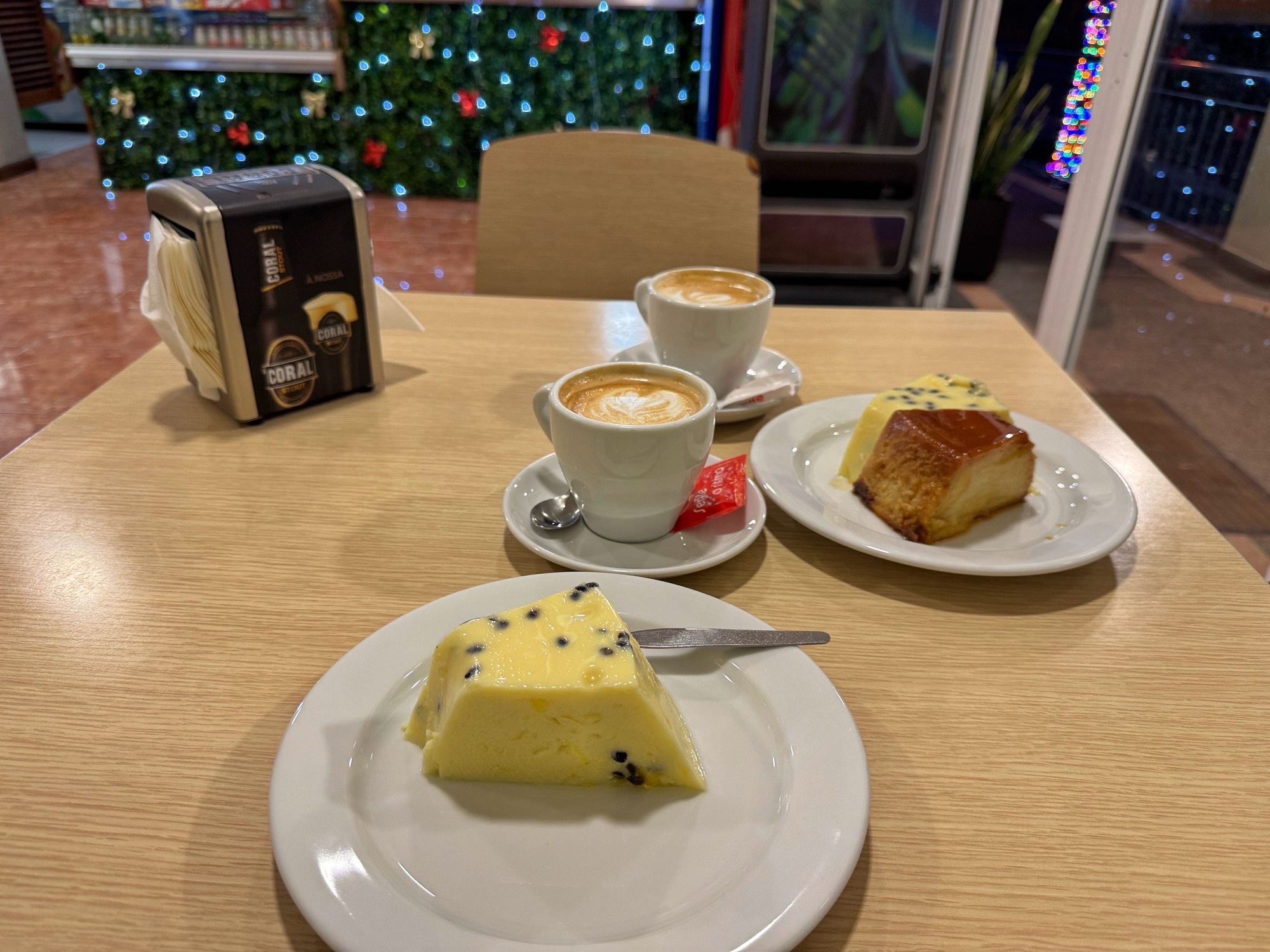 Für uns wird es etwas, was wir in einigen Kuchenvitrinen bereits gesehen aber noch nicht getestet haben. Für mich Passionsfruchtpudding und für Marcus noch ein Stück Karamelpudding dazu. Der Kaffee in dieser Bar ist sehr gut, nach nun zwei Wochen habe ich es endlich drauf, wir eine „Chinese“ zu bestellen. Das ist ein Kaffee mit Milch. Den Pudding kann man mal machen, müsste ich aber nicht ständig haben.