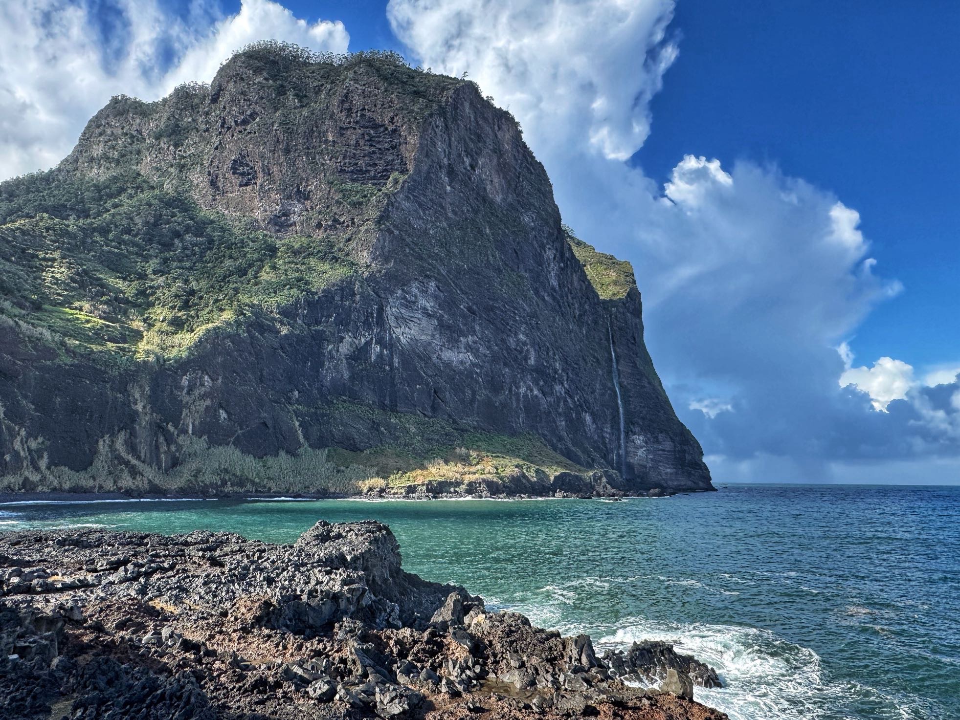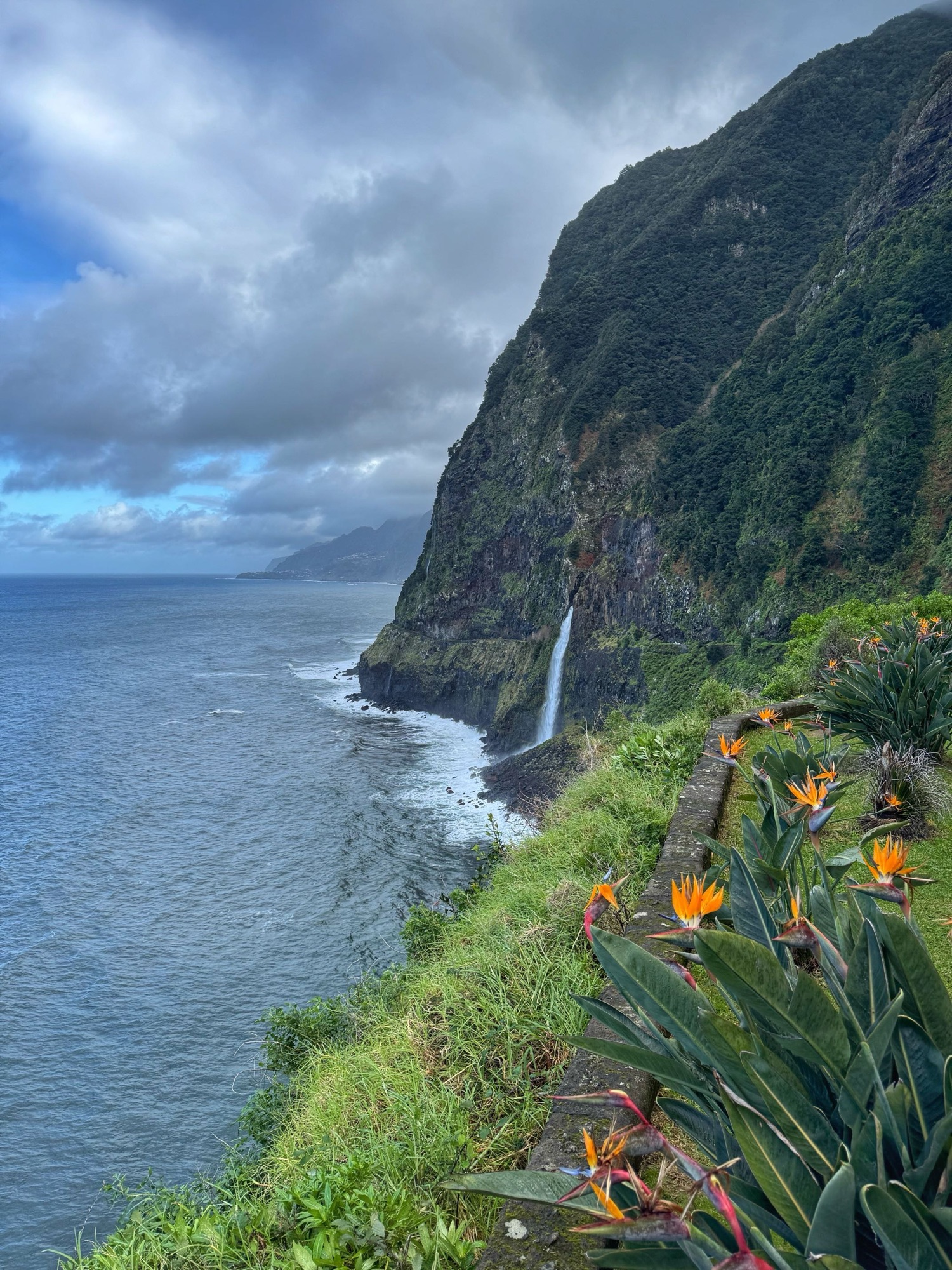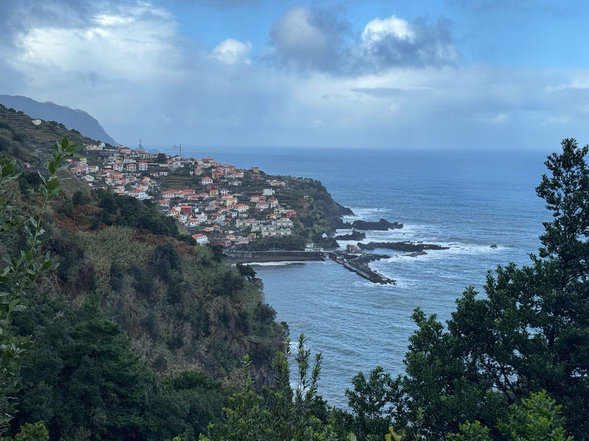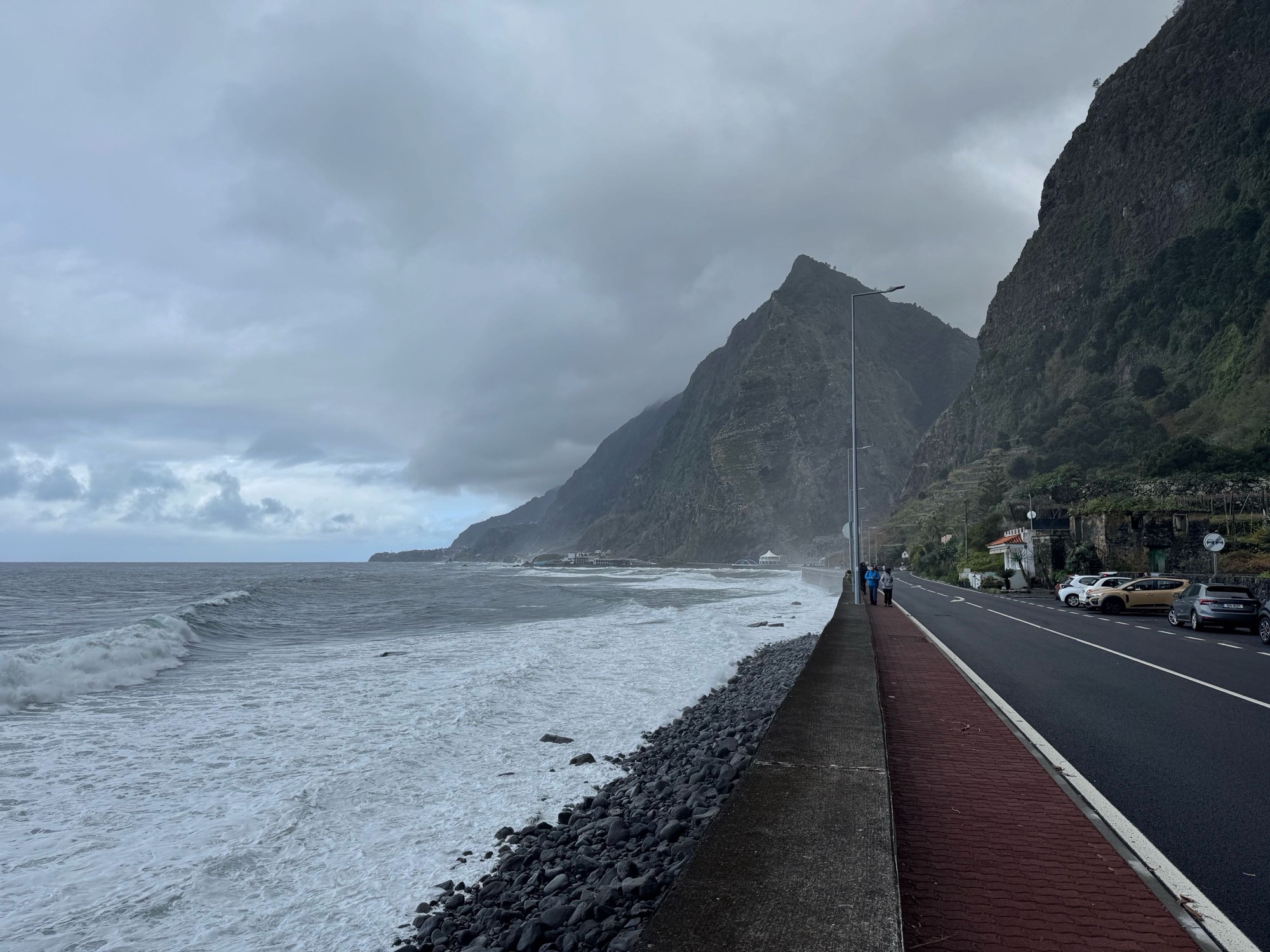 Die Wanderwege auf Madeira waren auch heute nochmal wegen des stürmischen und regnerischen Wetters gesperrt also brechen wir nochmals zu einer Auto-Inselrundtour auf. Wollen dort anknüpfen, wo wir gestern im Norden aufgehört haben. Aber wir kommen nicht weit. An der Südküste sehen wir, wie sich der Atlantik aufbäumt. Wir halten an, fangen an verschiedenen Stellen ein paar Wellen ein.