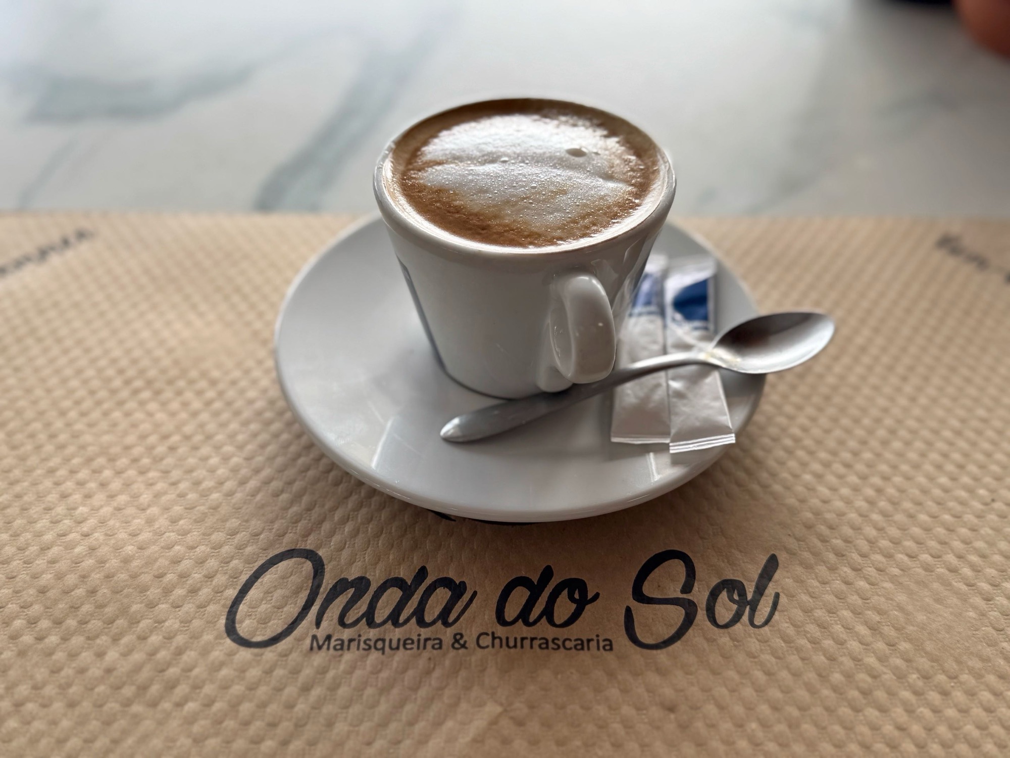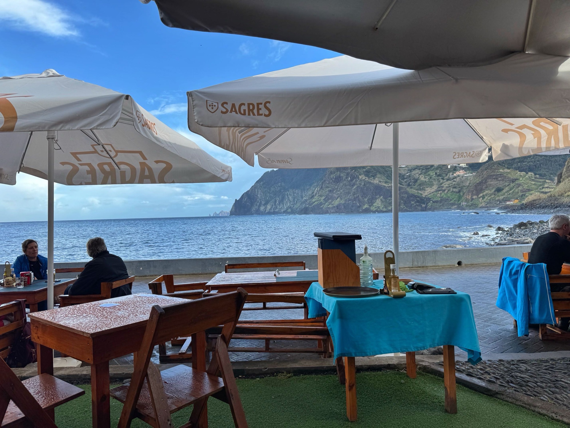 Die Bar gefällt uns gut. Heute läuft die Bestellung des „Chinesas“ (Kaffee mit Milch) sehr gut und durch die durchsichtigen Wetterschutzplanen können wir die mächtigen Wellen beobachten.