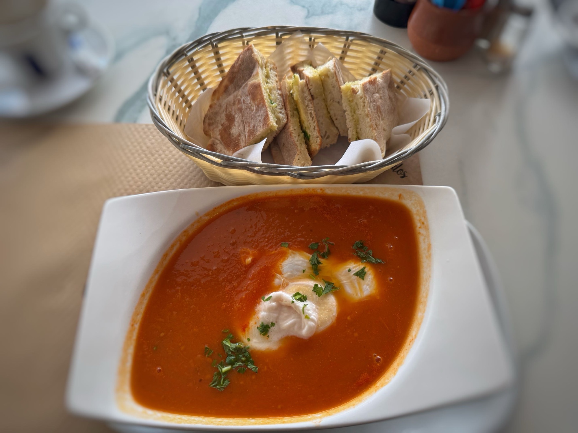 Für Marcus gibt es dieses Mal eine Fischsuppe, für mich eine Tomatensuppe. Was ausschaut wie ein Schwapp Schlagsahne ist in Wirklichkeit ein Ei. Auch mal eine interessante Idee in der Tomatensuppe.