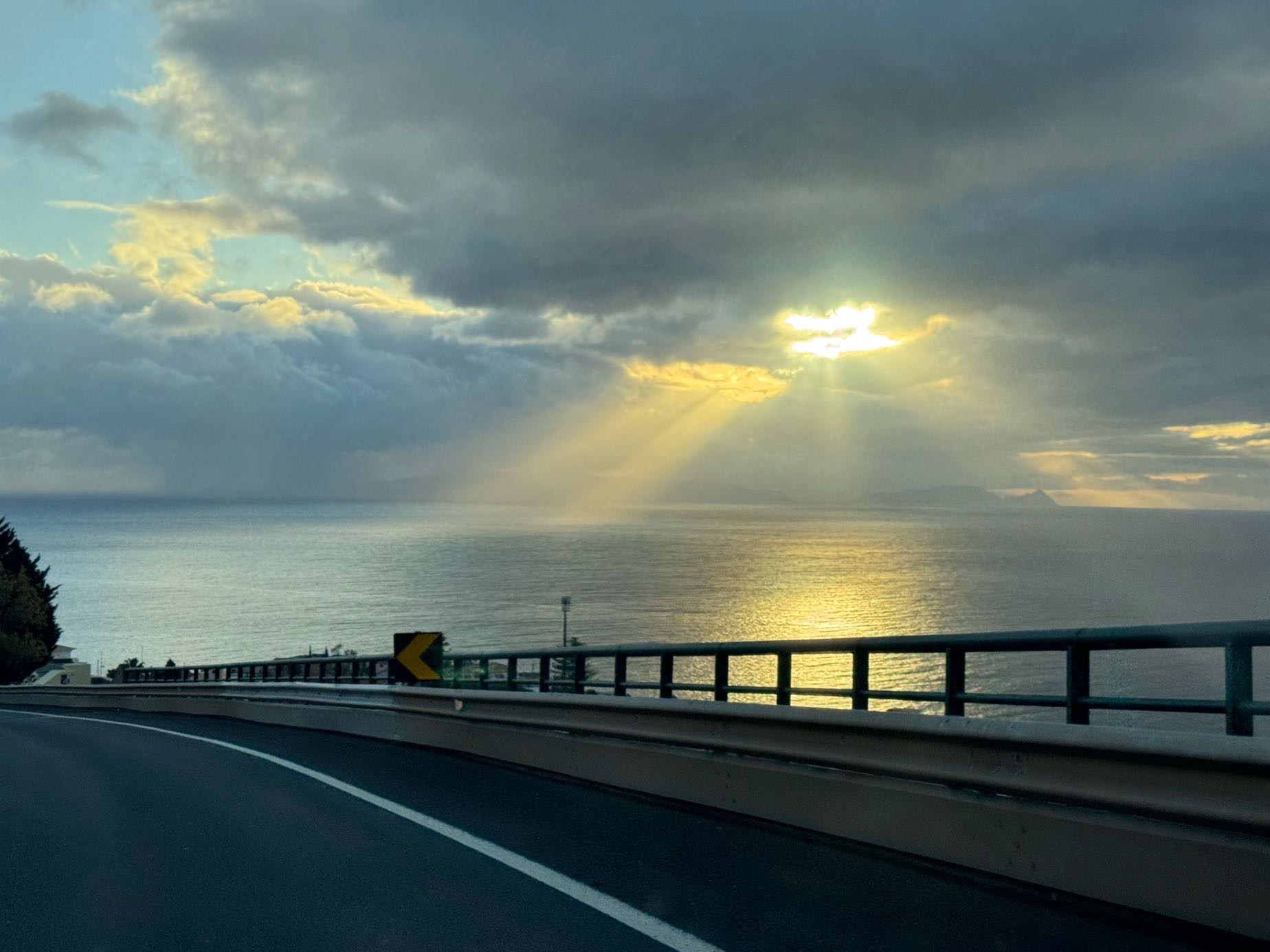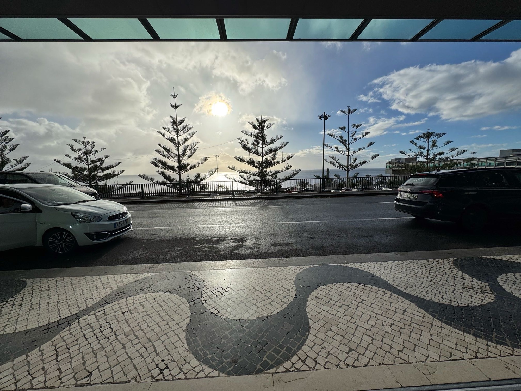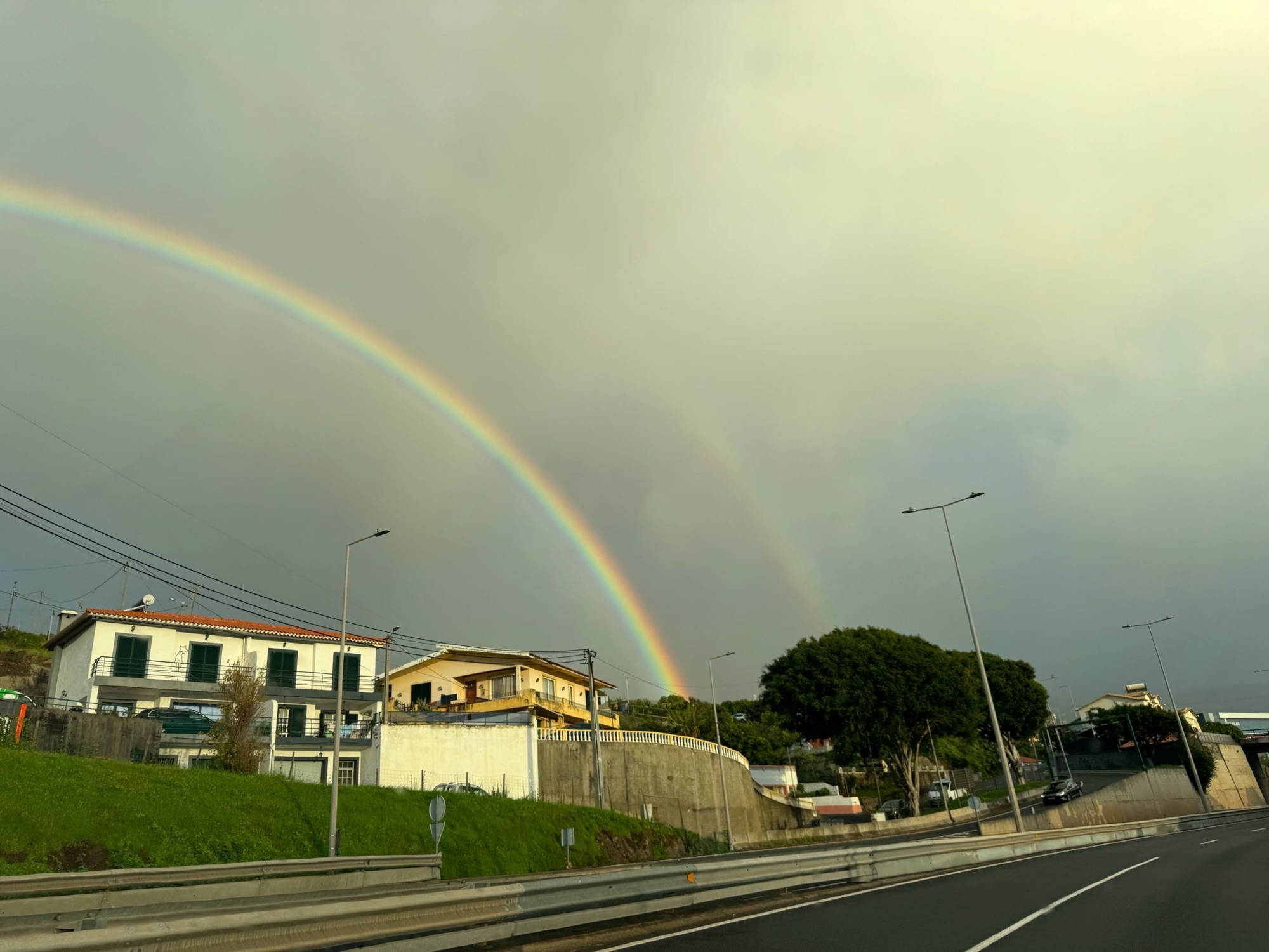 Bevor es soweit ist, müssen wir nach Machico, den Mietwagen abgeben. Im Regenschauer watscheln wir mit den Koffern zum Auto, sind wir schon das erste Mal wieder bisschen nass. Na das kennen wir ja nun mittlerweile. Die Straßen sind noch relativ leer. Auf dem Weg zur Vermietstation begleitet uns der uns nun für den Winter auf Madeira gut bekannte Sonne-Wolken-Mix. Einer von vielen Regenbögen in diesen 14 Tagen zeigt sich. Besser: Der Doppelregenbogen.