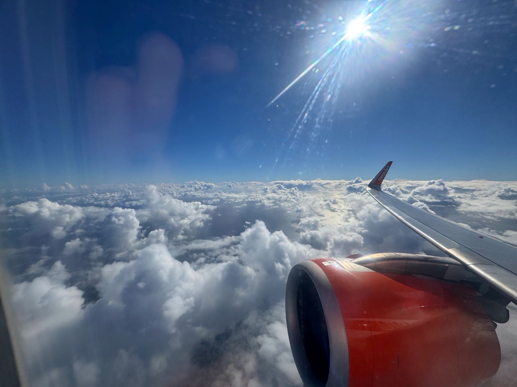 Ab und an werfen wir einen Blick aus dem Fenster – die ganze Zeit sind wir über den Wolken, der Flug insgesamt sehr angenehm und ruhig.
