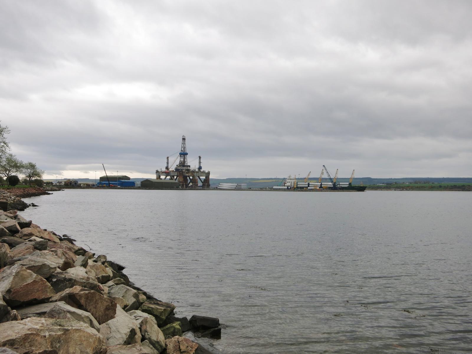 Buchladen. Schon im Schaufenster viel Platz für Golferlektüre und auch im kleinen Geschäft ein ganzes Regal. Hier in Dornoch sowie nördlich davon befindet sich also so etwas wie ein Golfereldorado. Fahrt über eine 2 km lange Brücke über den Meeresarm des Firth of Dornoch. Auffallend das frische Grün der Bäume, blühende Rapsfelder und richtig dunkle Erde. Kurze Durchfahrt durch das hübsche Städtchen Tain, dann Fahrt entlang des Meeresarmes Cromarty Firth. Wir trauen unseren Augen kaum. Auf einmal bauen sich vor unseren Augen riesengroße Bohrtinseln auf.